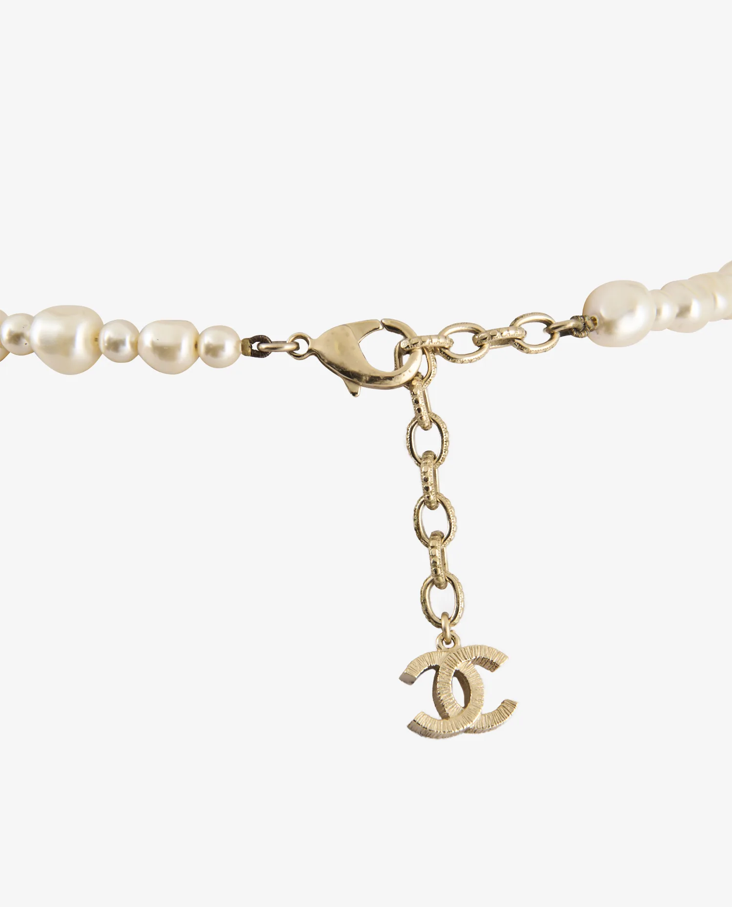 Le collier se compose d’un enfilage de perles synthétiques crème à effet nacré, volontairement irrégulières pour rappeler les formes organiques des perles naturelles. Le logo CC est réalisé en métal doré à effet gravé, conférant un aspect texturé et artisanal. Ce motif est intégré latéralement, en rupture avec la symétrie traditionnelle des colliers à pendentif central. Le fermoir mousqueton doré est relié à une chaîne de réglage ornée d’un second logo CC suspendu en breloque.