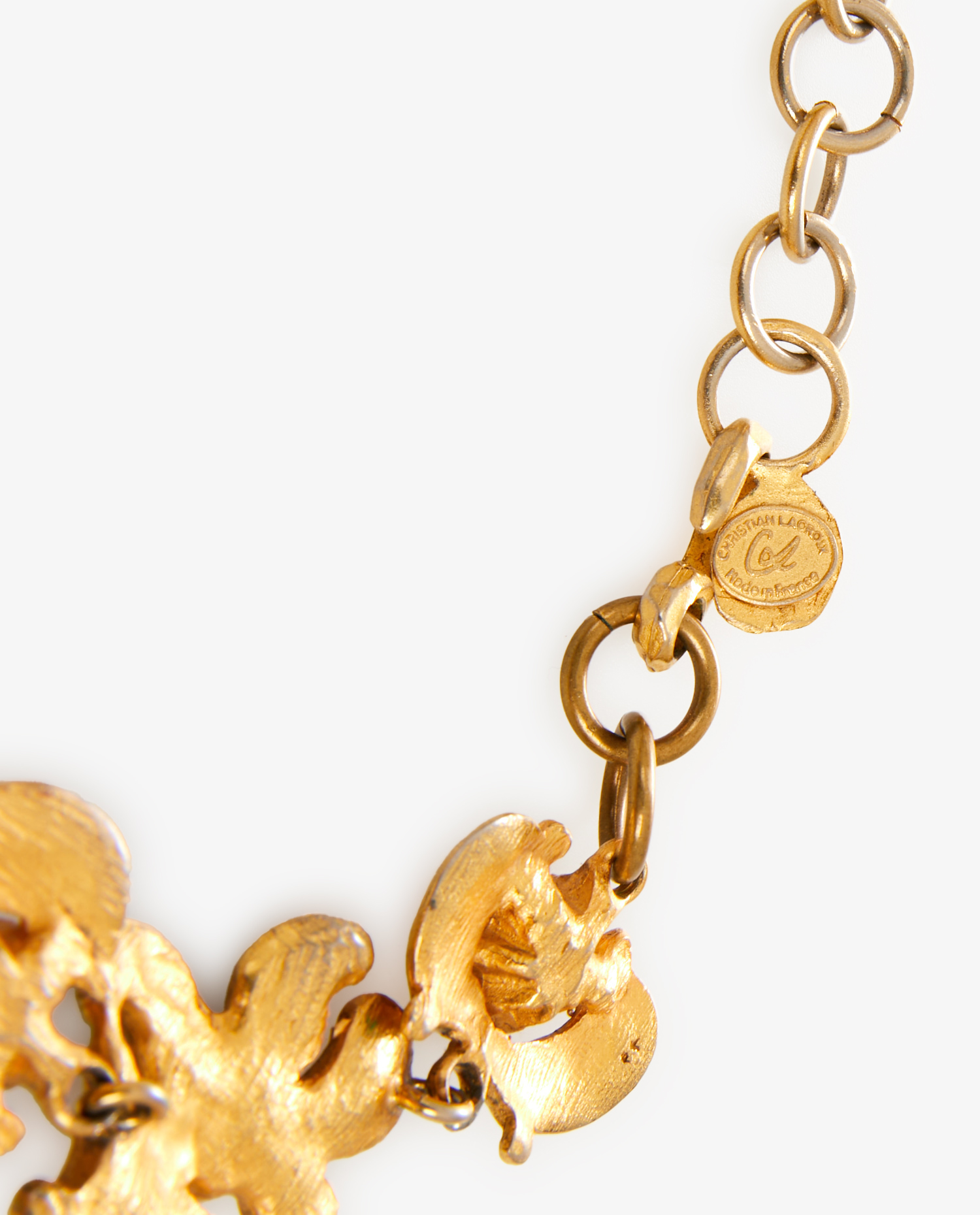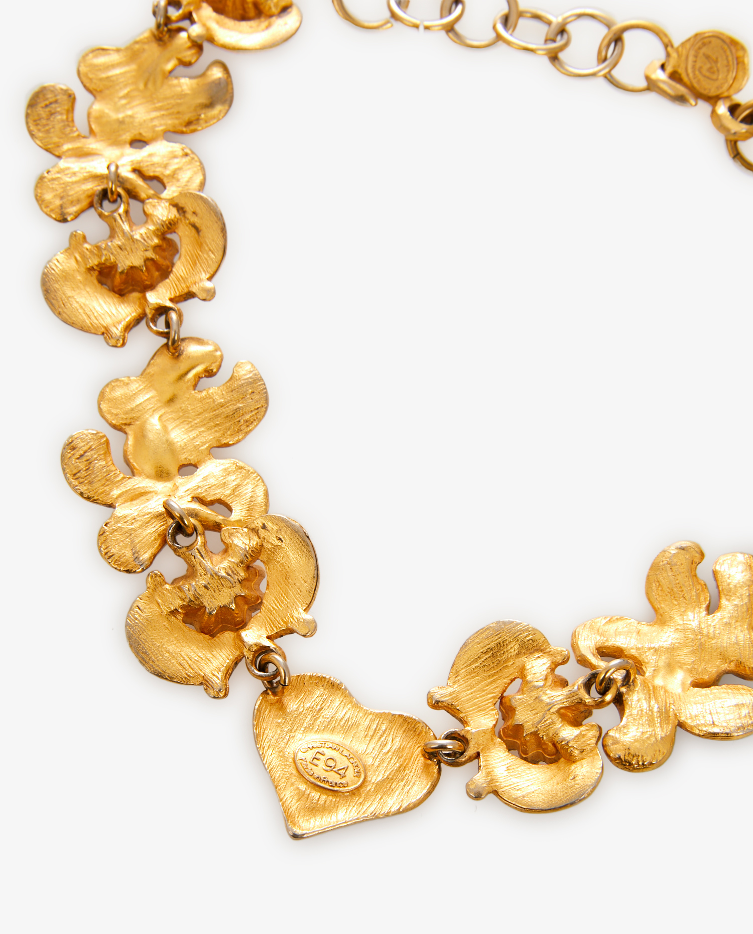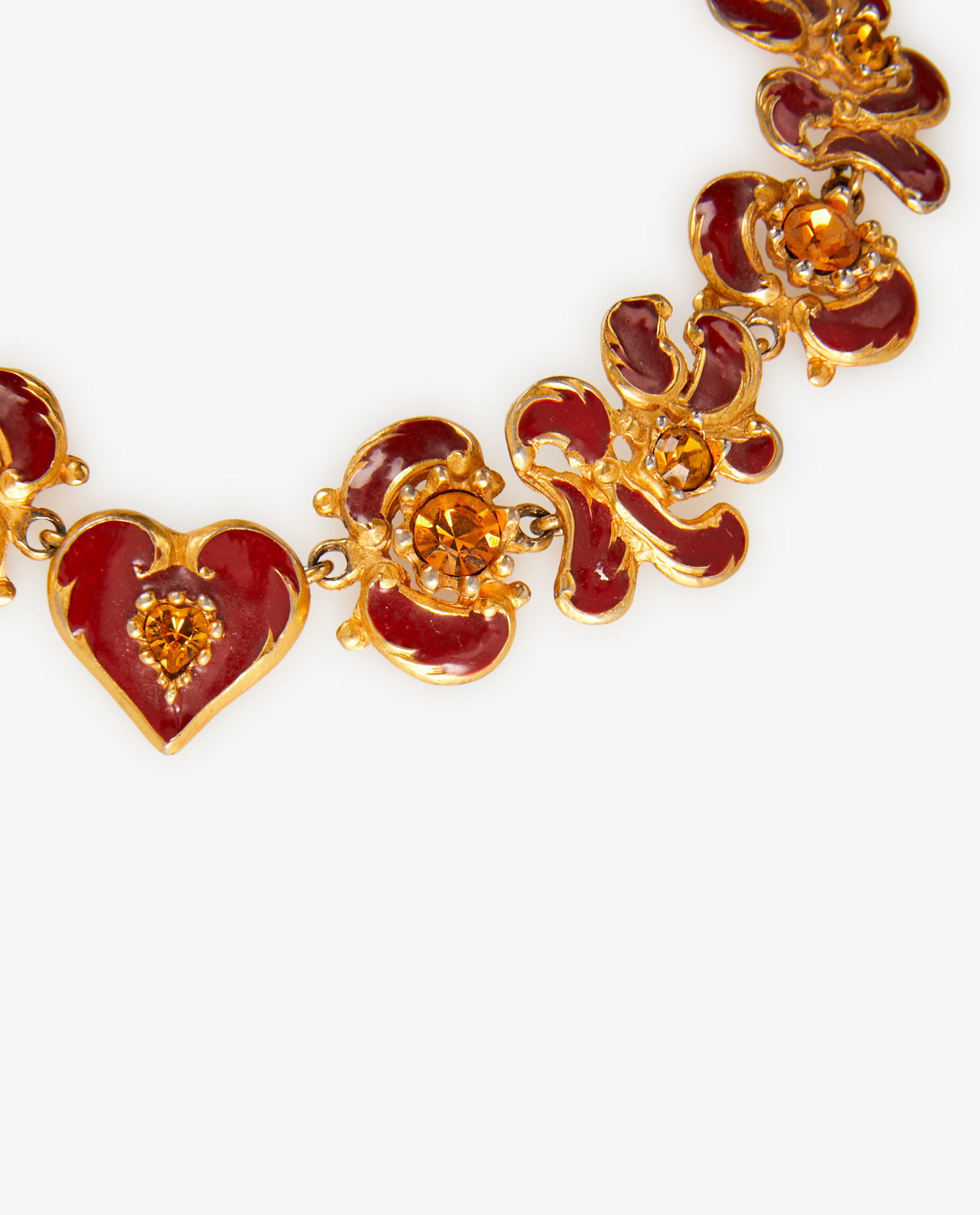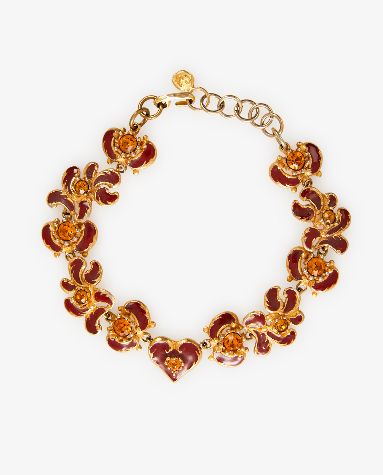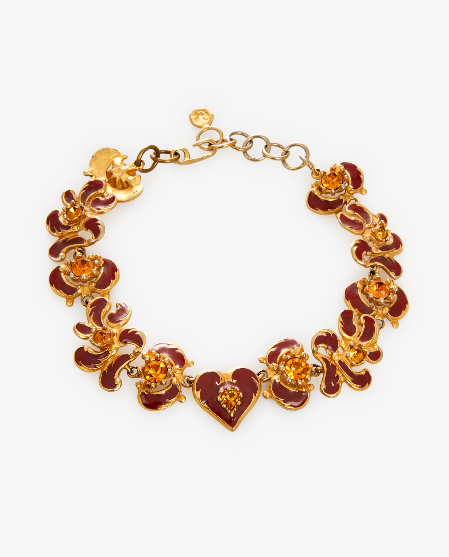 Choker Christian Lacroix vintage en métal doré avec finitions marron et cristal jaune. Collection été 1994 signé à l’arrière. En très bon état.