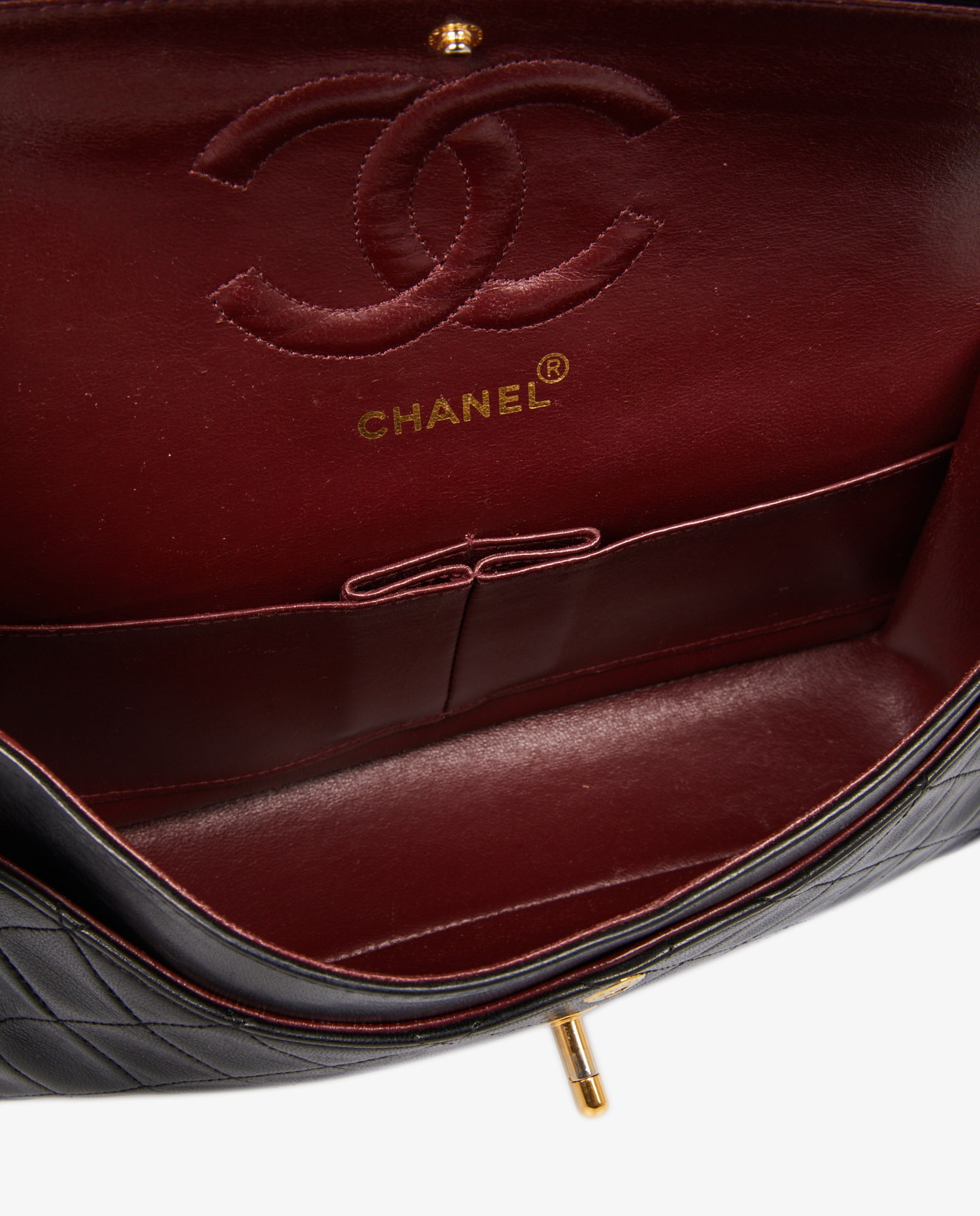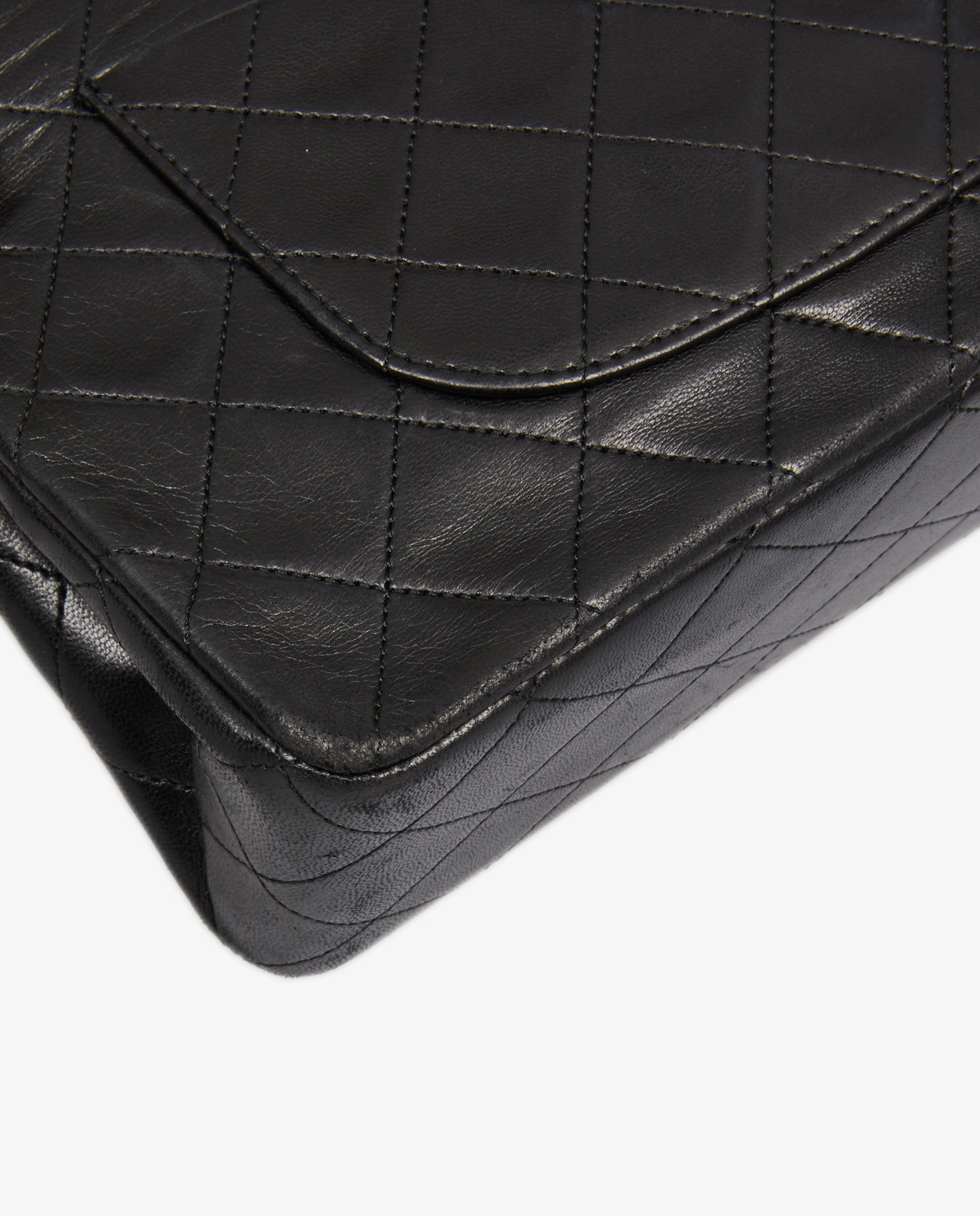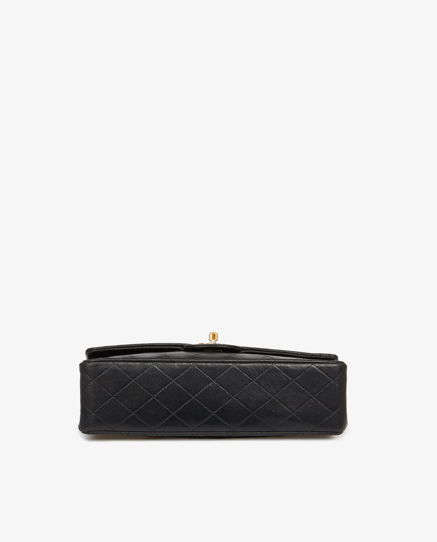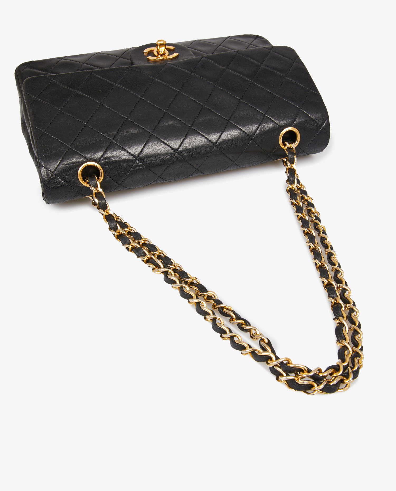 Classique Chanel 25cm vintage en cuir d’agneau noir matelassé. Porté épaule ou crossbody (90cm). Double rabat. En très bon état.