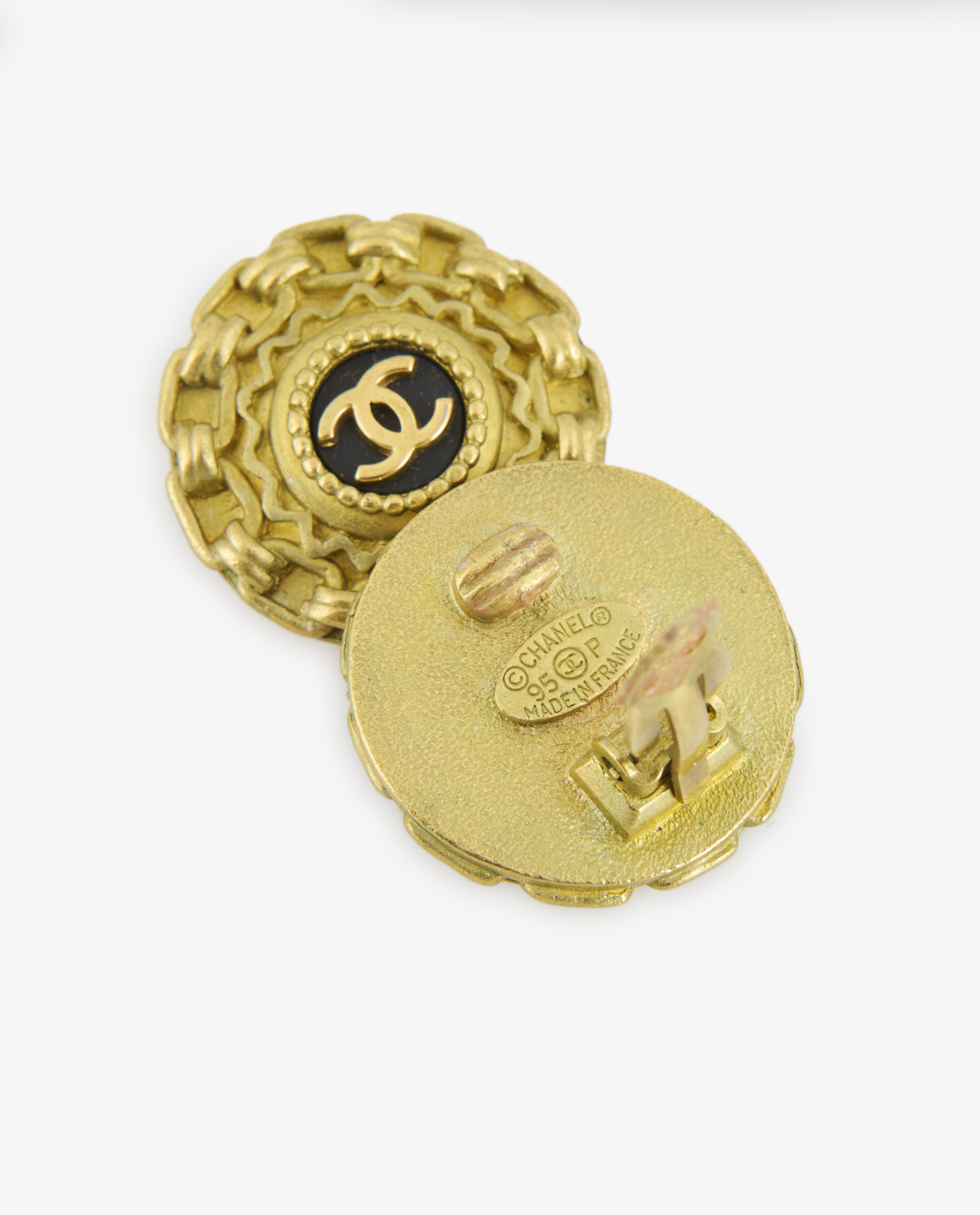 Le métal doré présente une finition texturée et légèrement satinée, caractéristique des bijoux Chanel de cette époque. La forme ronde est soulignée par un motif de chaîne sculpté en relief qui encadre harmonieusement le logo central. L’émail noir brillant au centre offre un contraste marqué, mettant en valeur le double C doré. Le diamètre est d’environ 3,5 cm, ce qui leur confère une présence visible sans être surdimensionnée.