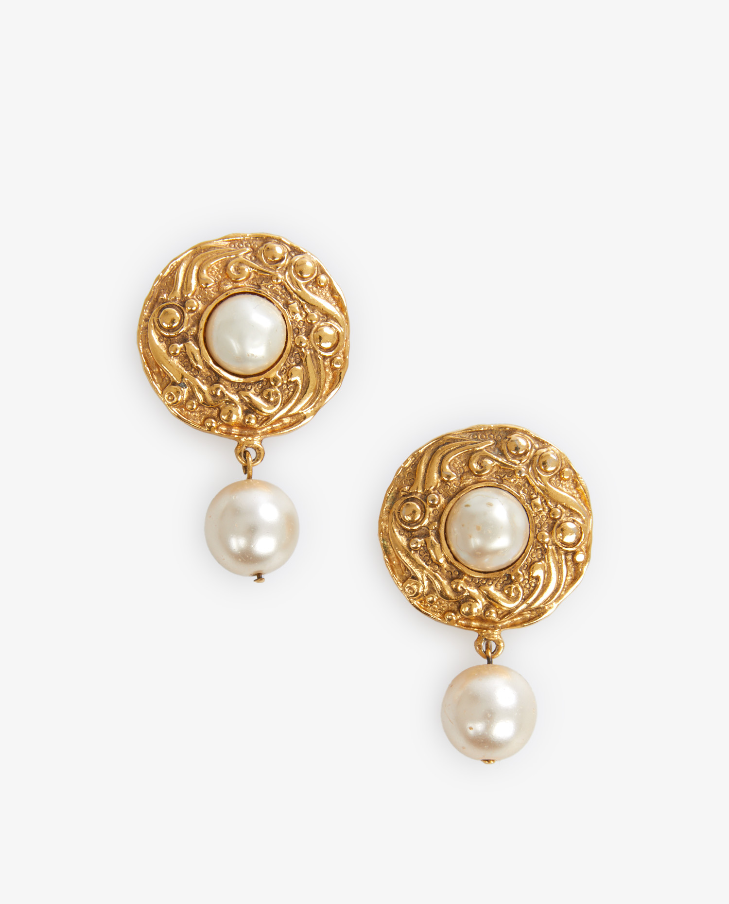 Clips d’oreilles pendants Chanel vintage en métal dorée et perles. En bon état. Quelques rayures d’usure d’usage.