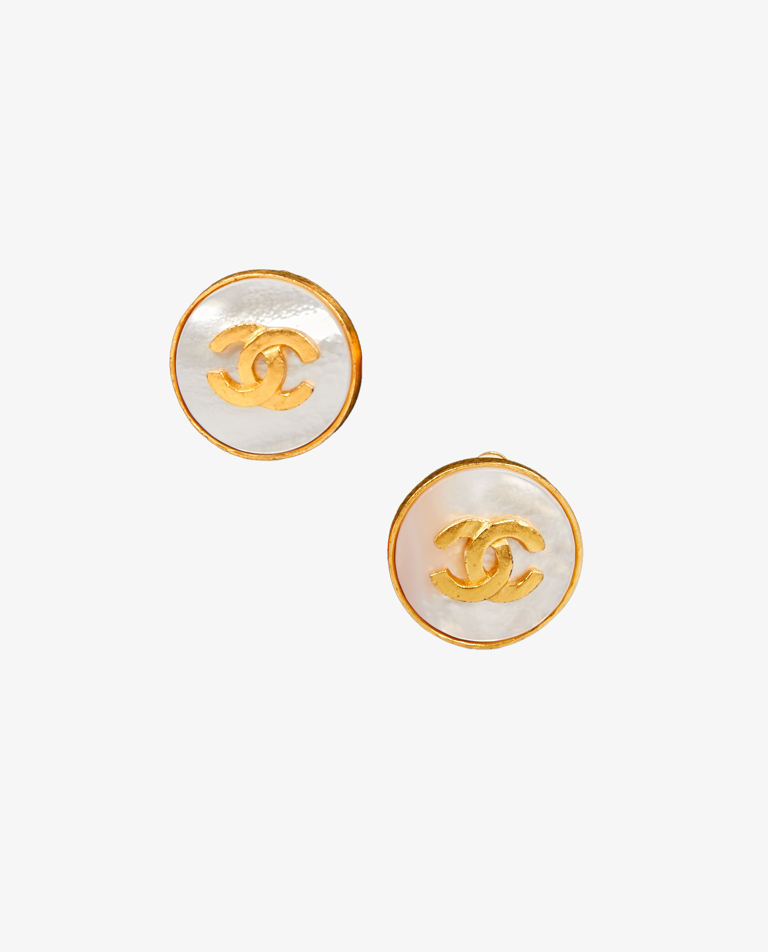 Clips ronds vintage Chanel en métal doré plaqué or 24K et nacre. Collection Automne/Hiver 1995. En très bon état.