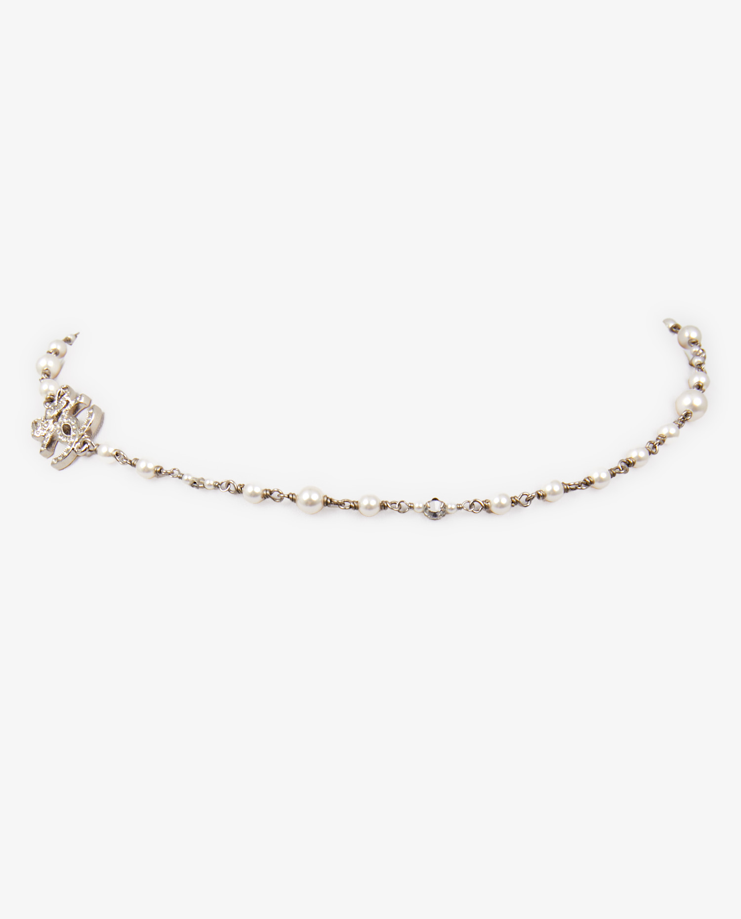 Le collier se compose d’une série régulière de perles blanches, montées sur une base en métal argenté. Certaines perles sont intercalées avec des petits cristaux sertis, créant des points d’éclat sans alourdir l’ensemble. Le logo Chanel en métal, placé de façon décentrée, fonctionne comme un médaillon raffiné, orné de strass qui épousent délicatement sa forme arrondie. L’ensemble se ferme à l’aide d’un fermoir discret, dissimulé dans la continuité du motif. La ligne fluide du collier épouse parfaitement les courbes du cou et du décolleté, qu’il vienne habiller une tenue sobre ou compléter un ensemble plus habillé.