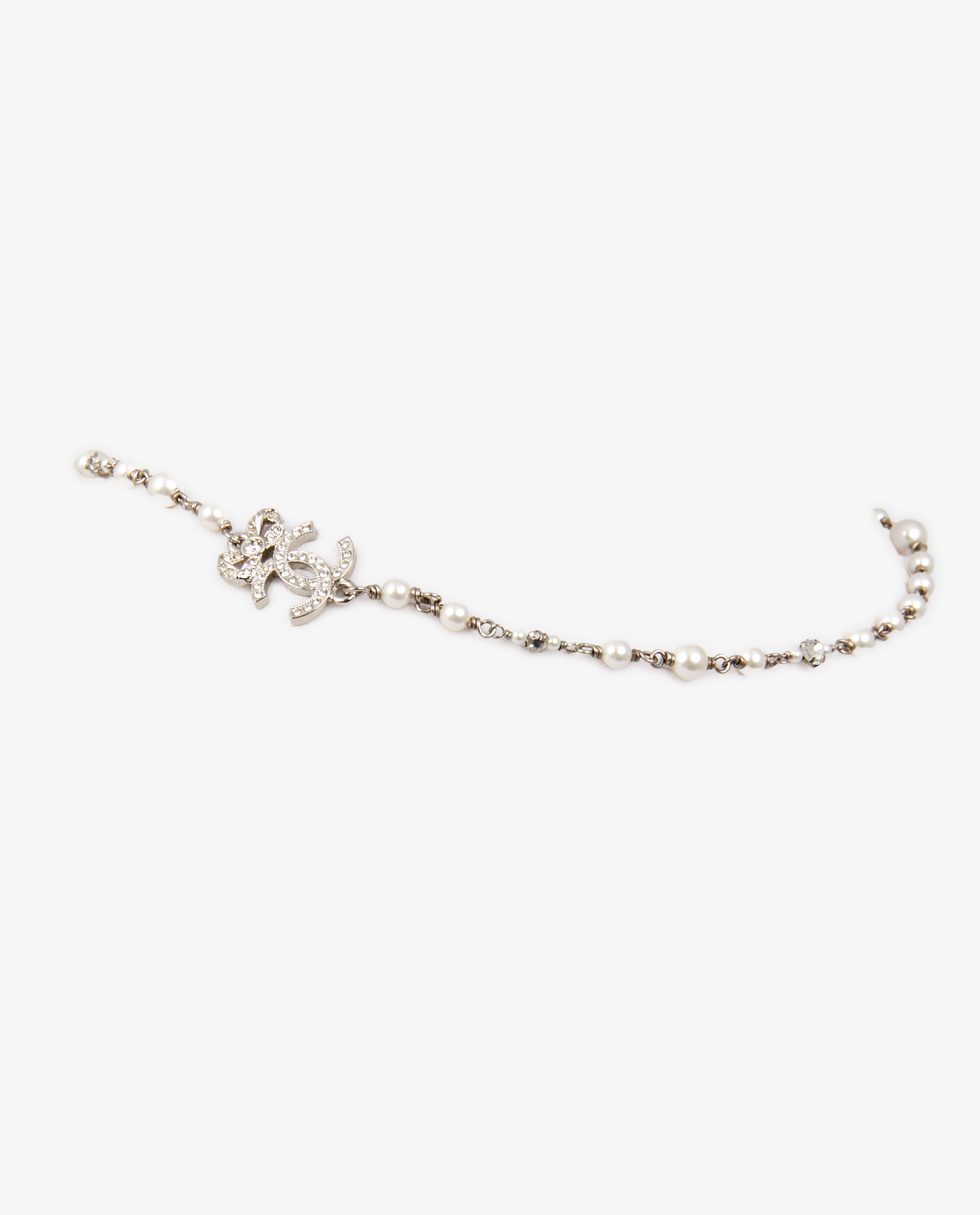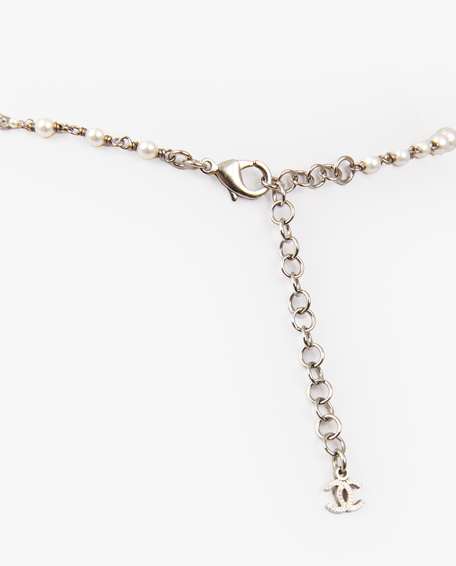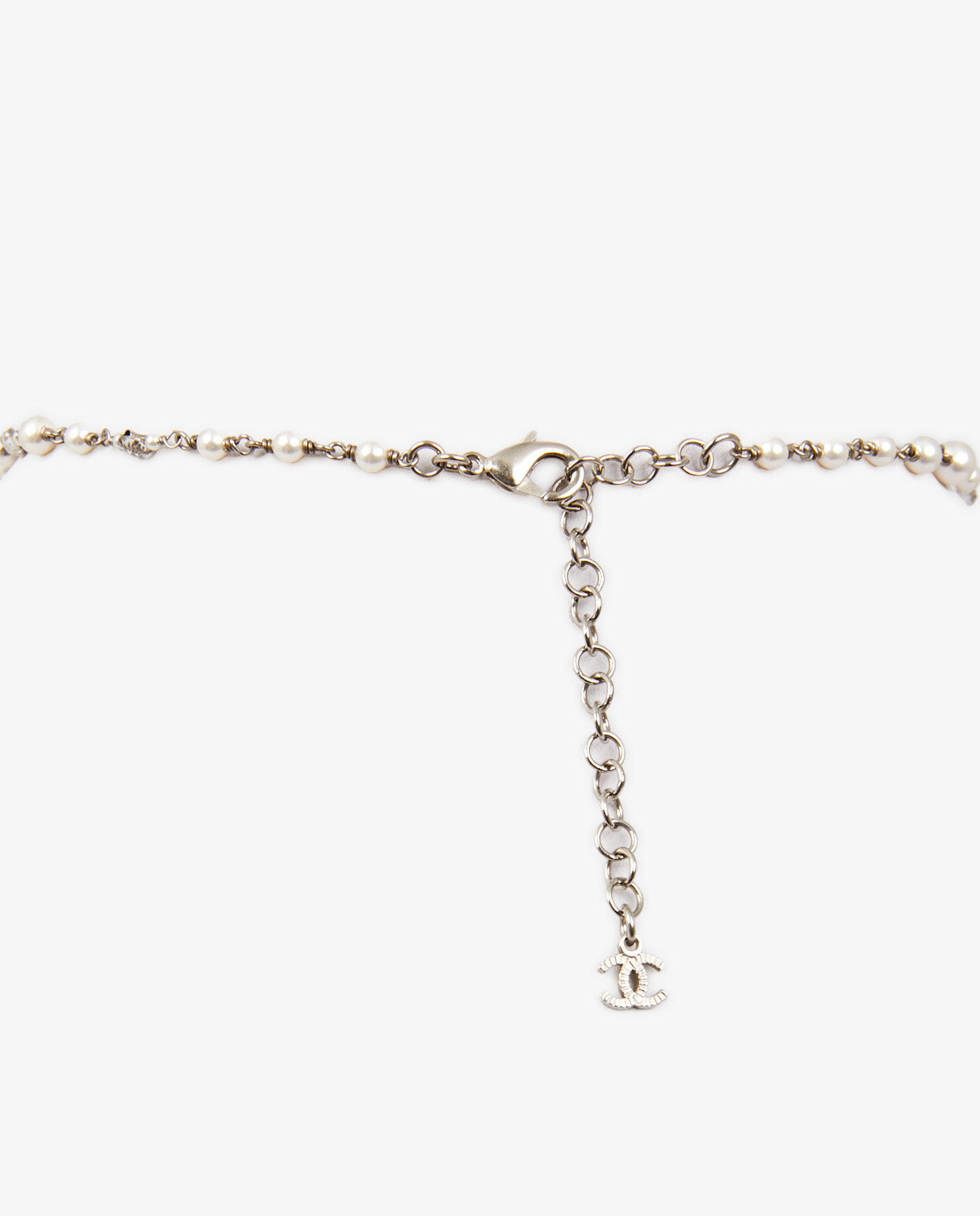 Le collier se présente en excellent état. Les perles sont lumineuses, sans éclat terni ni rayures. Les éléments en métal argenté sont intacts, avec une patine légère qui renforce son caractère vintage sans altérer l’uniformité de l’ensemble. Les strass du logo CC sont tous présents, bien sertis et brillants. Aucun signe d’oxydation, de perte de couleur ou de défaut structurel n’est à signaler.