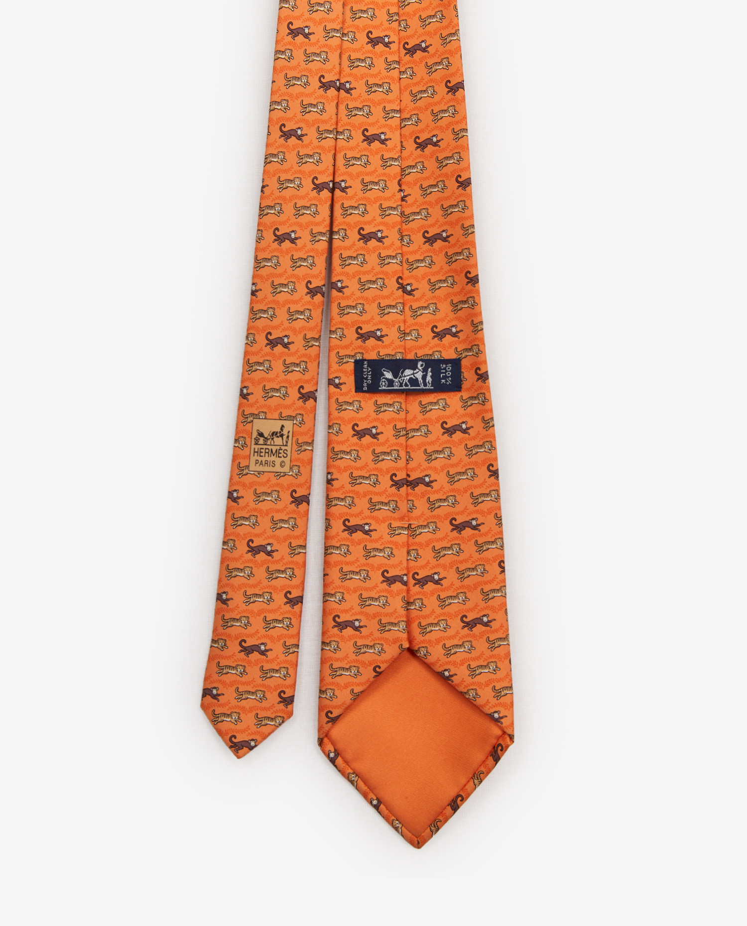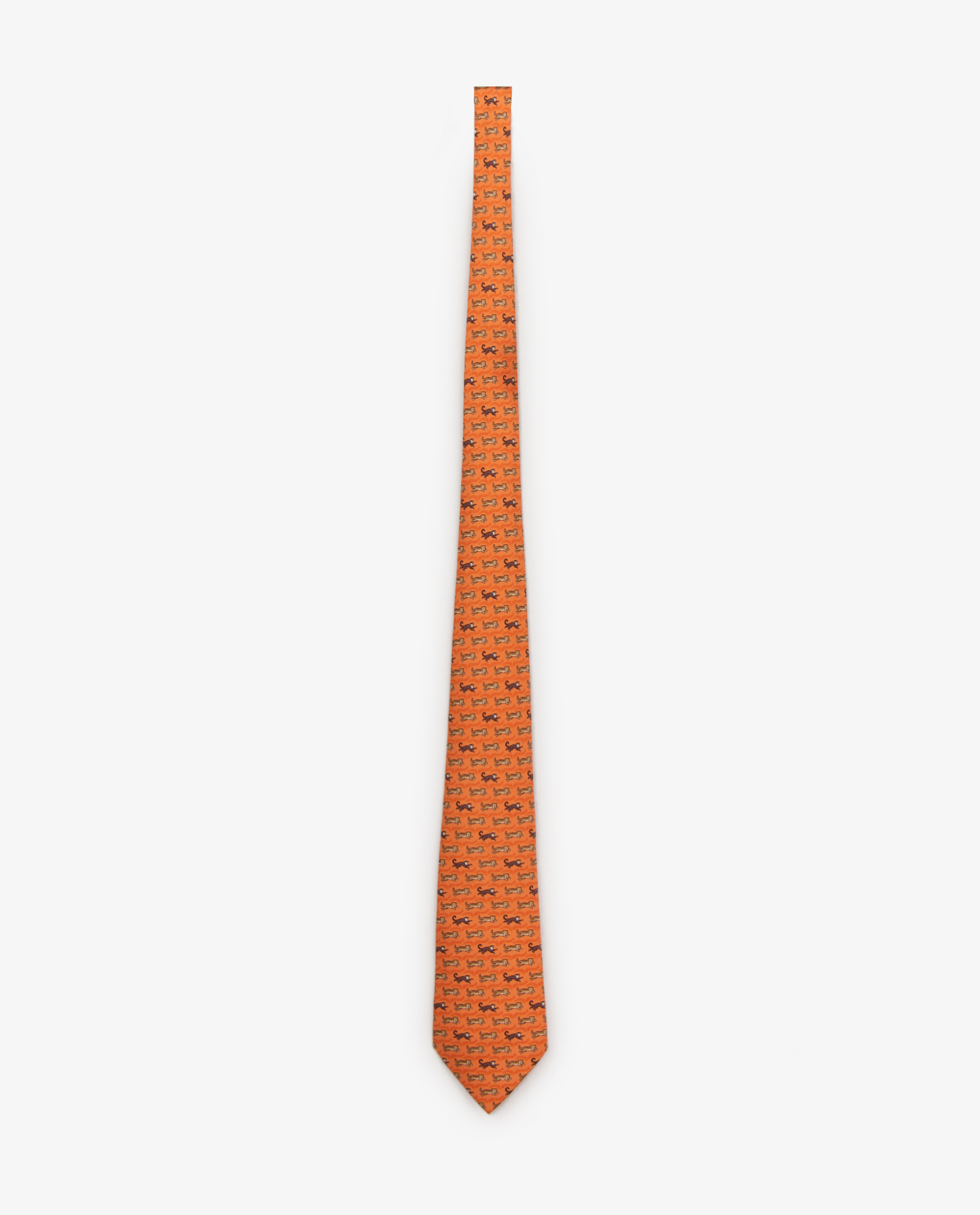 Cravate Hermès en soie orange avec des motifs lions et singes. En très bon état.