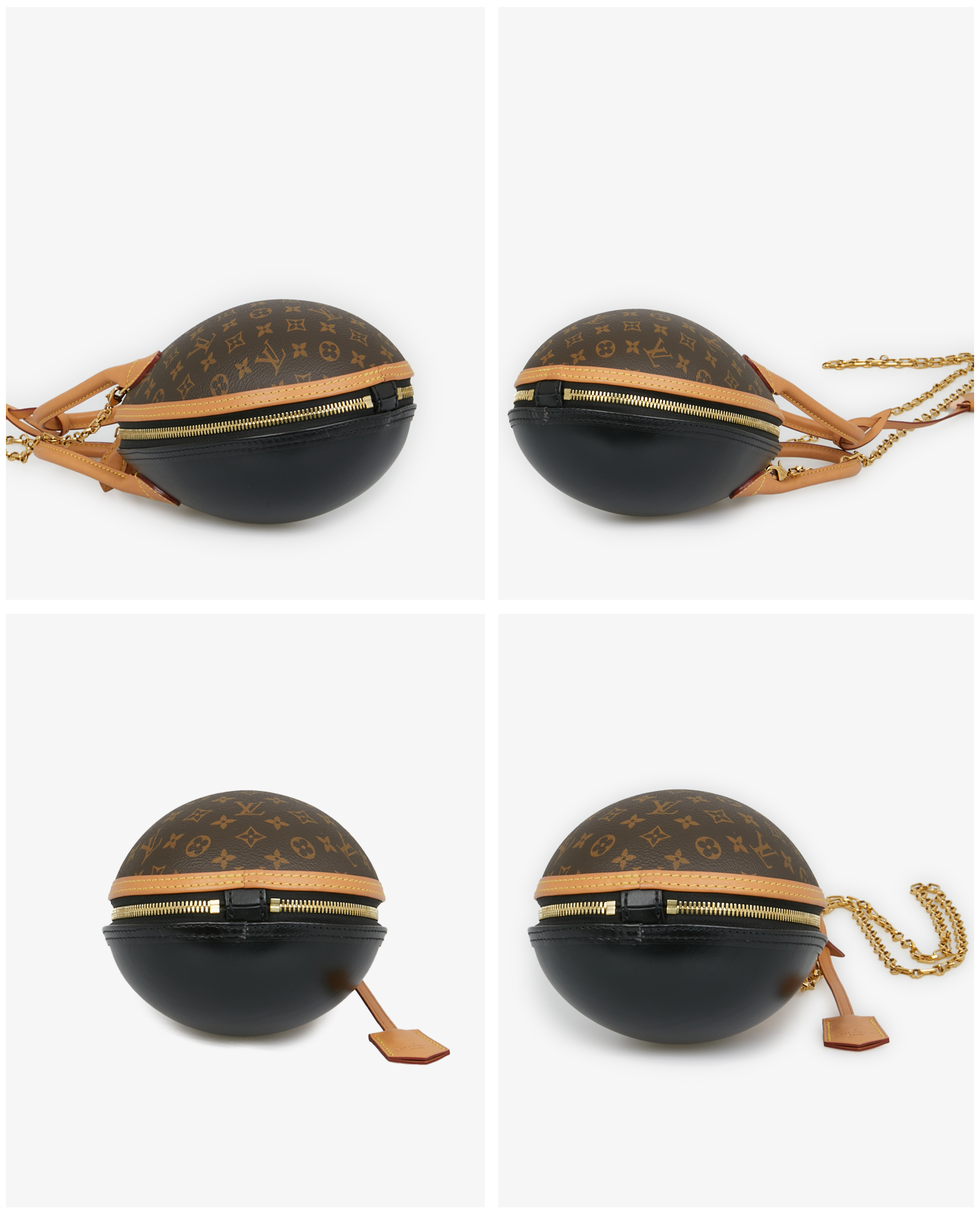 Sac Collector Egg bag de la Maison Louis Vuitton en cuir monogram et finitions en cuir de vache naturelle. Fermeture zippée. Porté à la main ou à l’épaule à l’aide d’une bandoulière en chaine dorée amovible. L’intérieur est en cuir noir. En très bon état. Livré dans son dustbag d’origine.