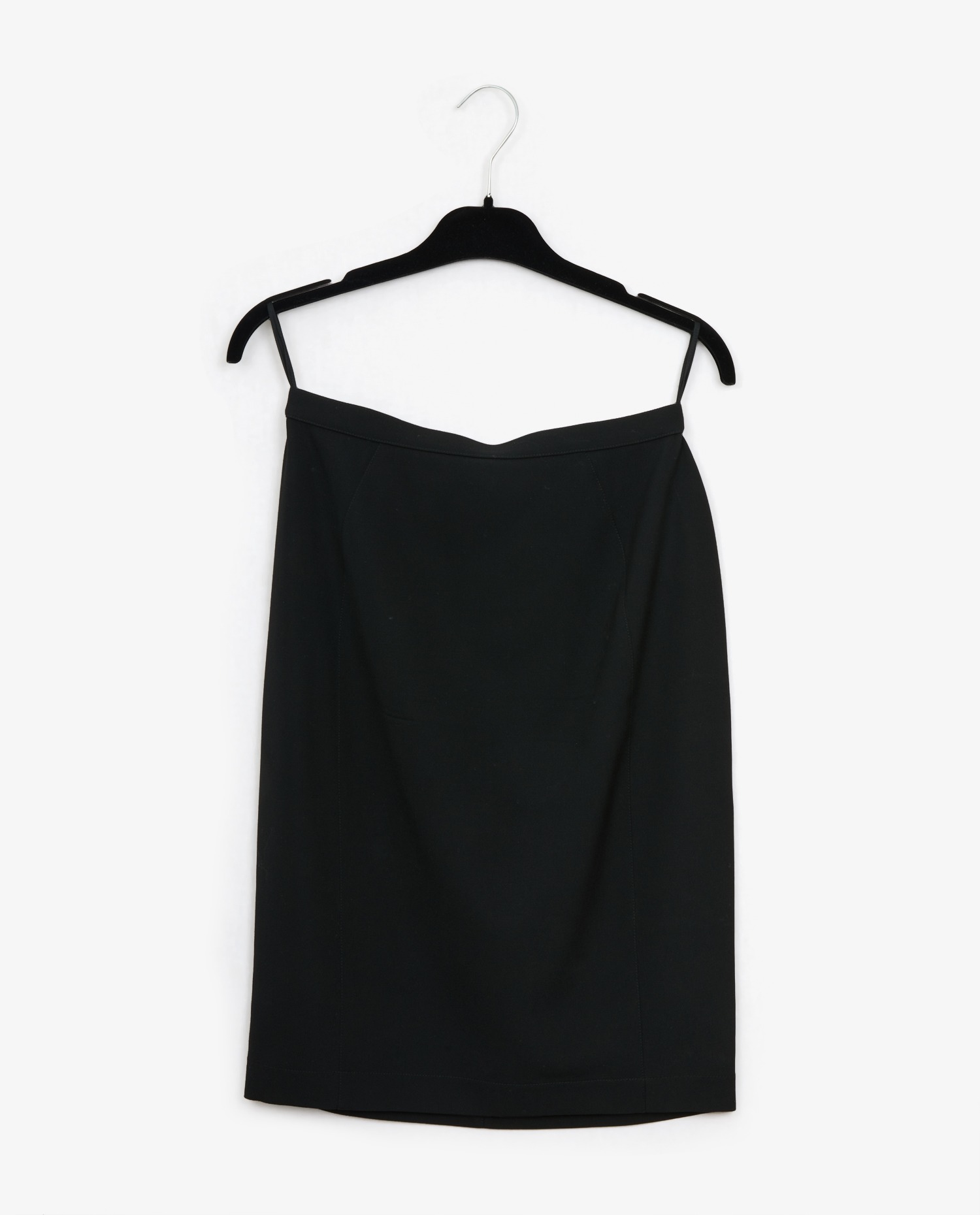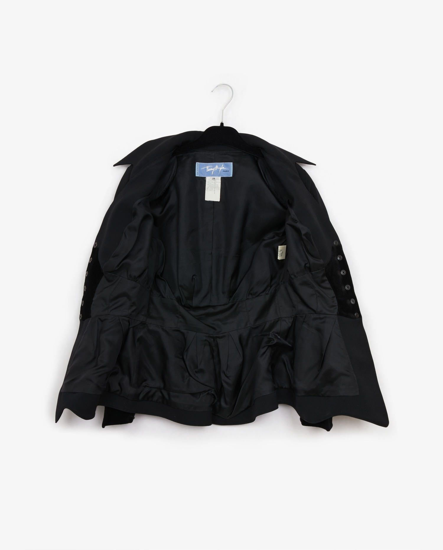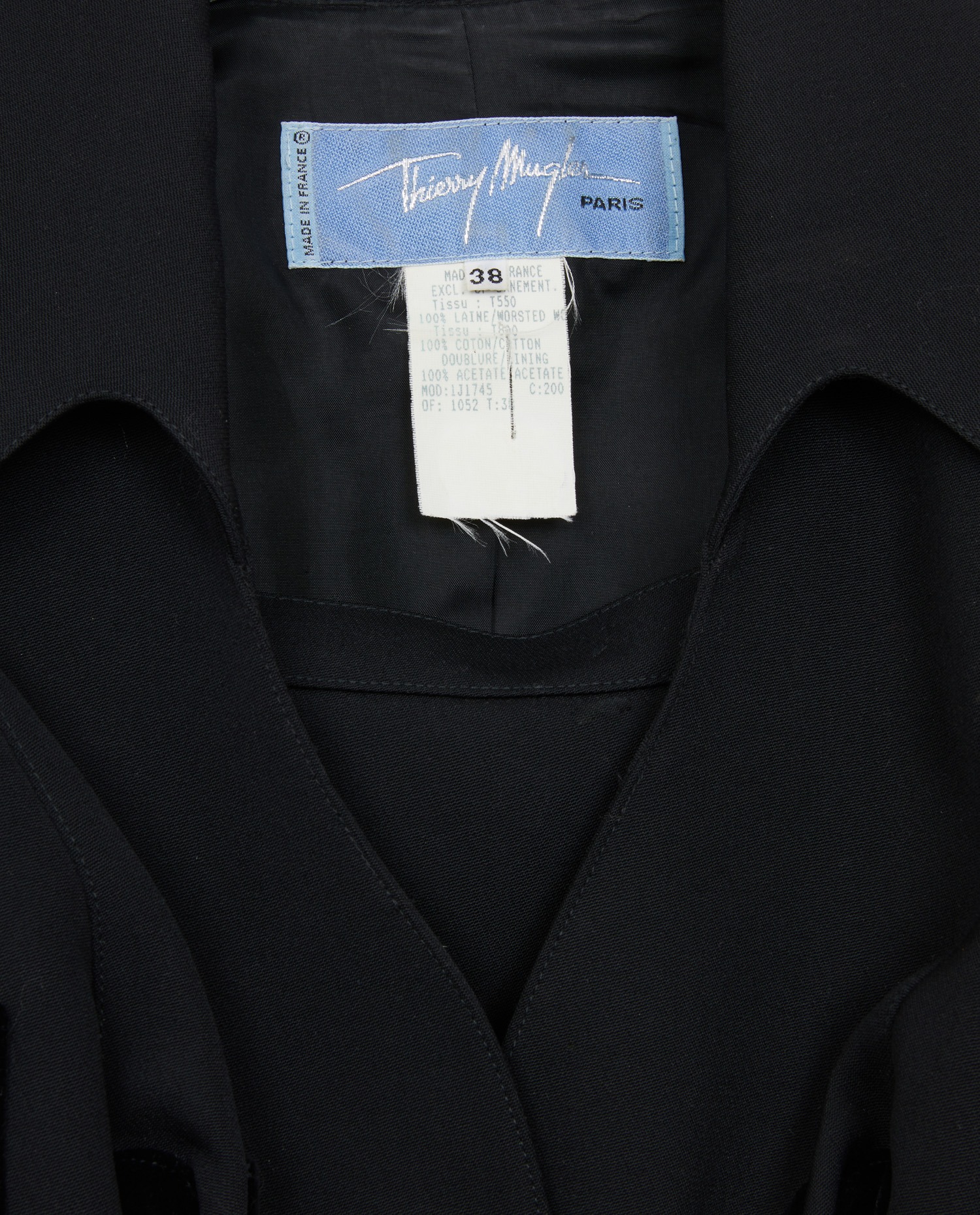 Ensemble Thierry Mugler en laine noire. Taille 38. La veste est serrée à la taille et aux poignées. Fermeture avec des boutons pressions. La jupe a une coupe droite ajustée. En très bon état. Légère usure du poignée gauche mais peu visible.