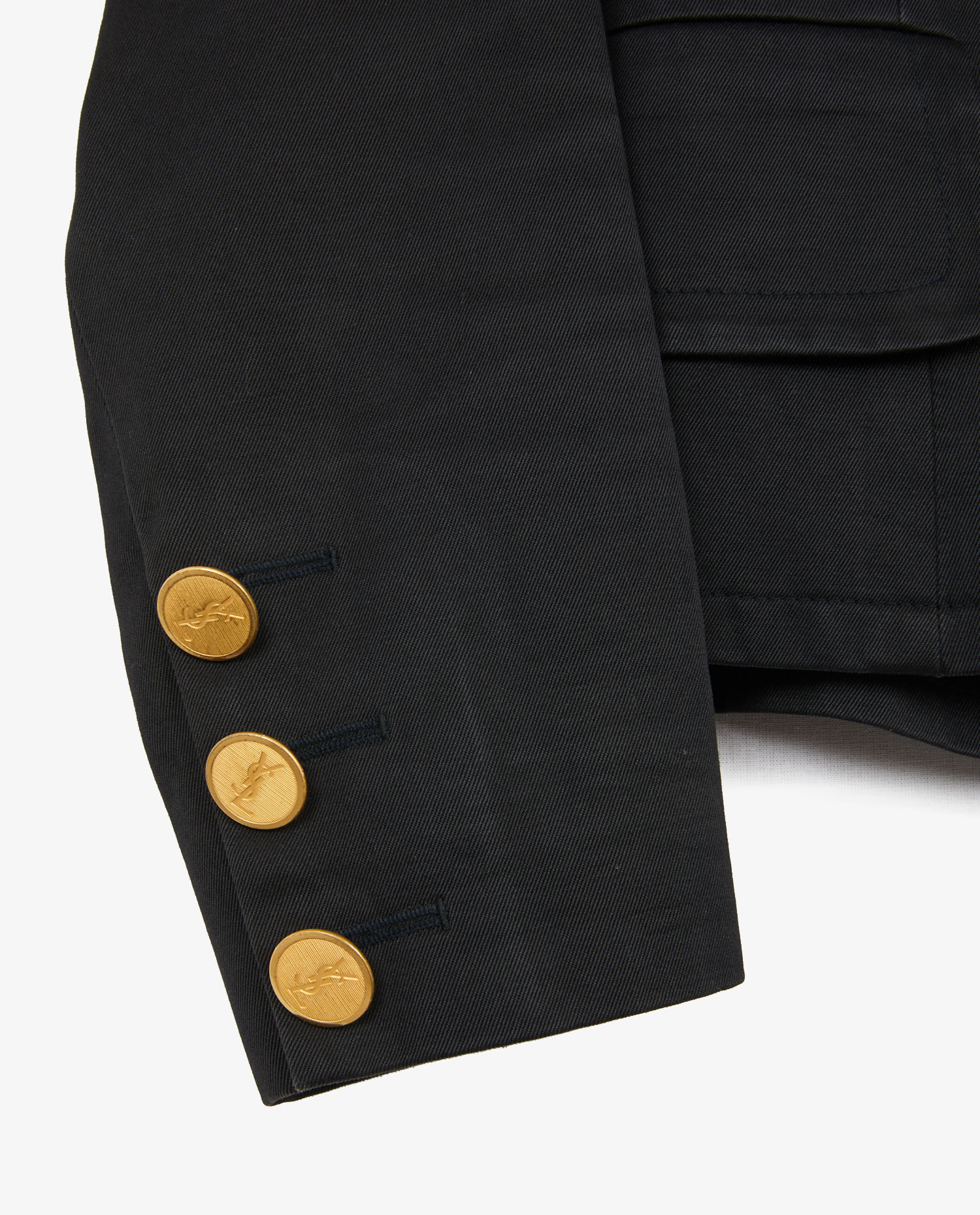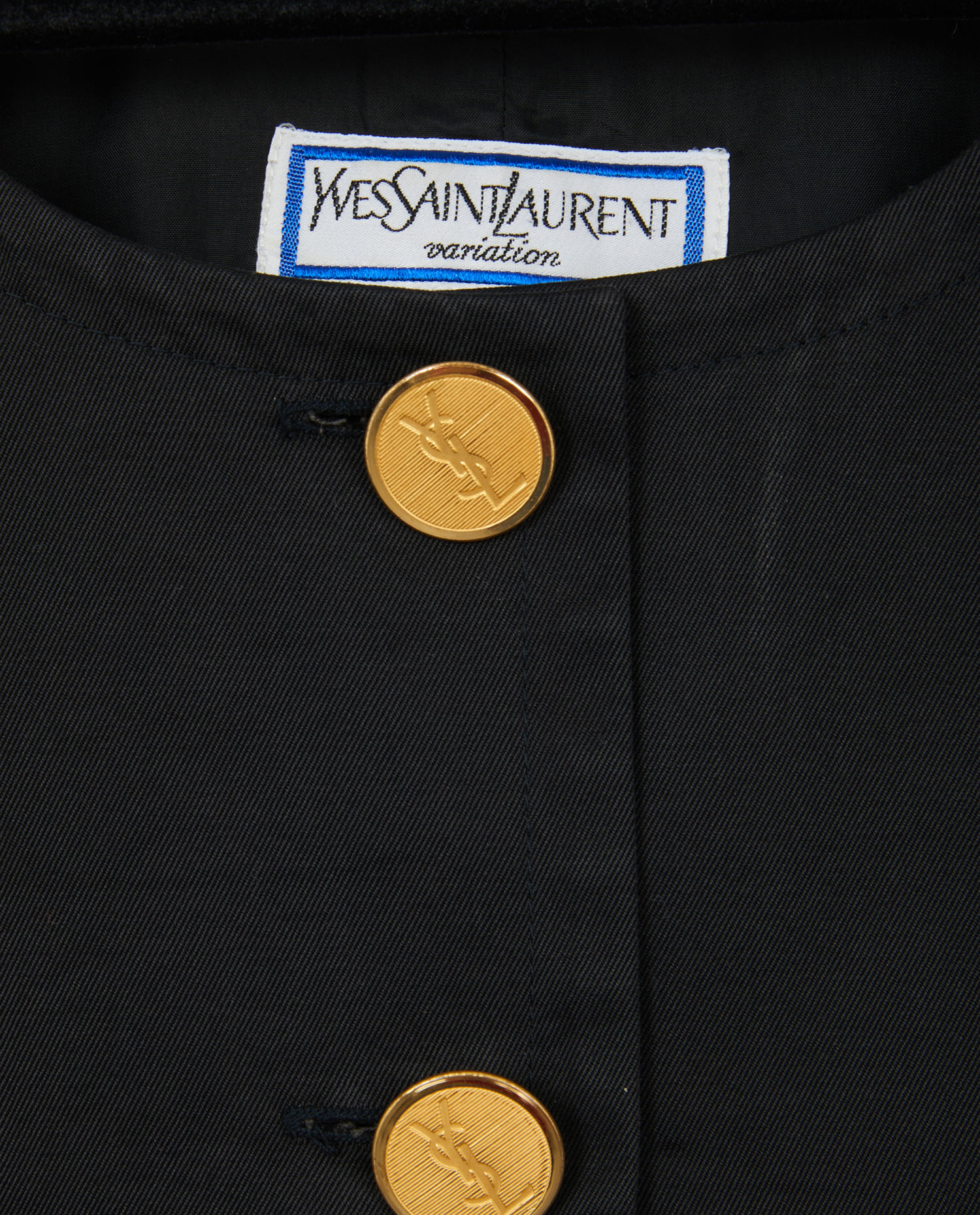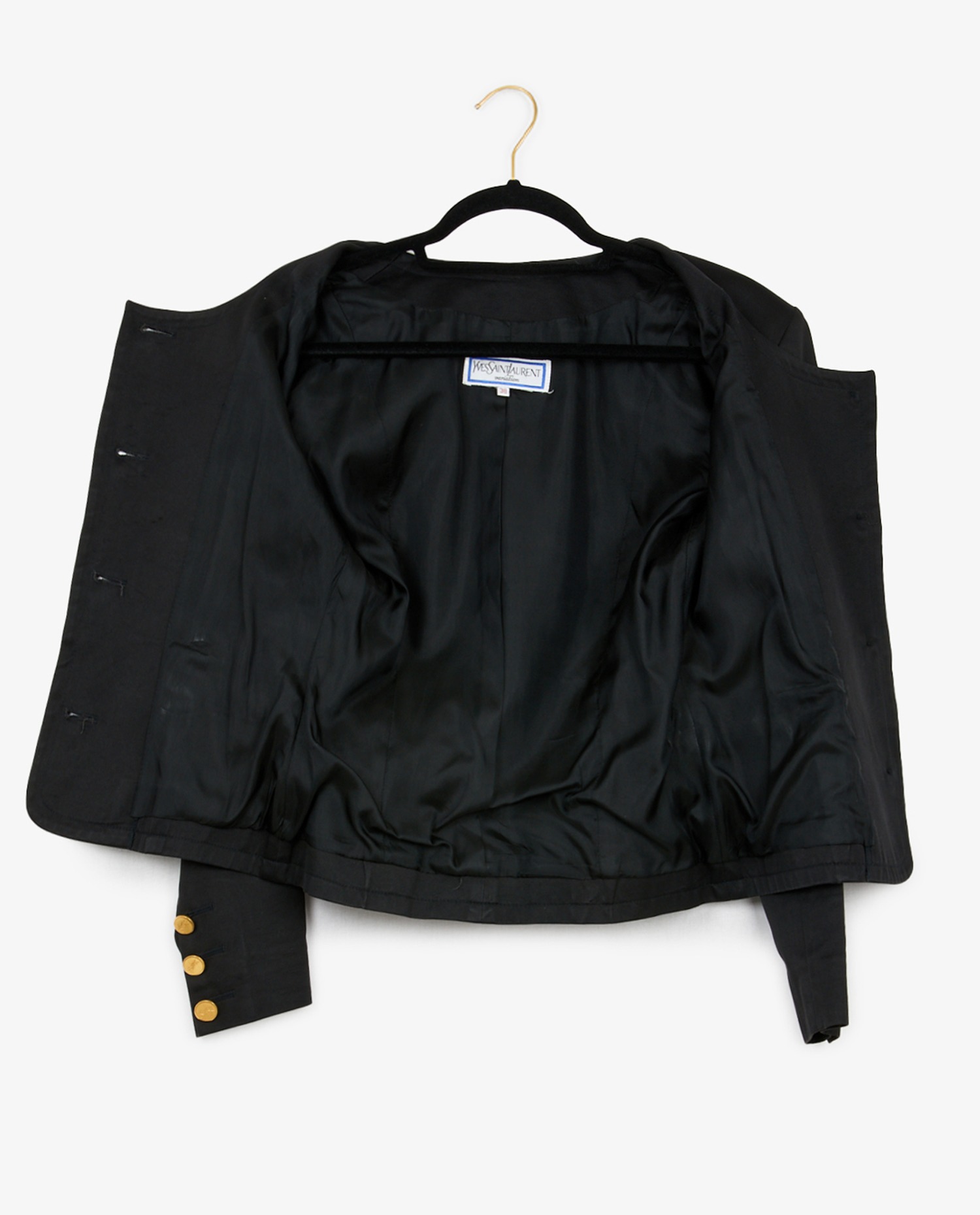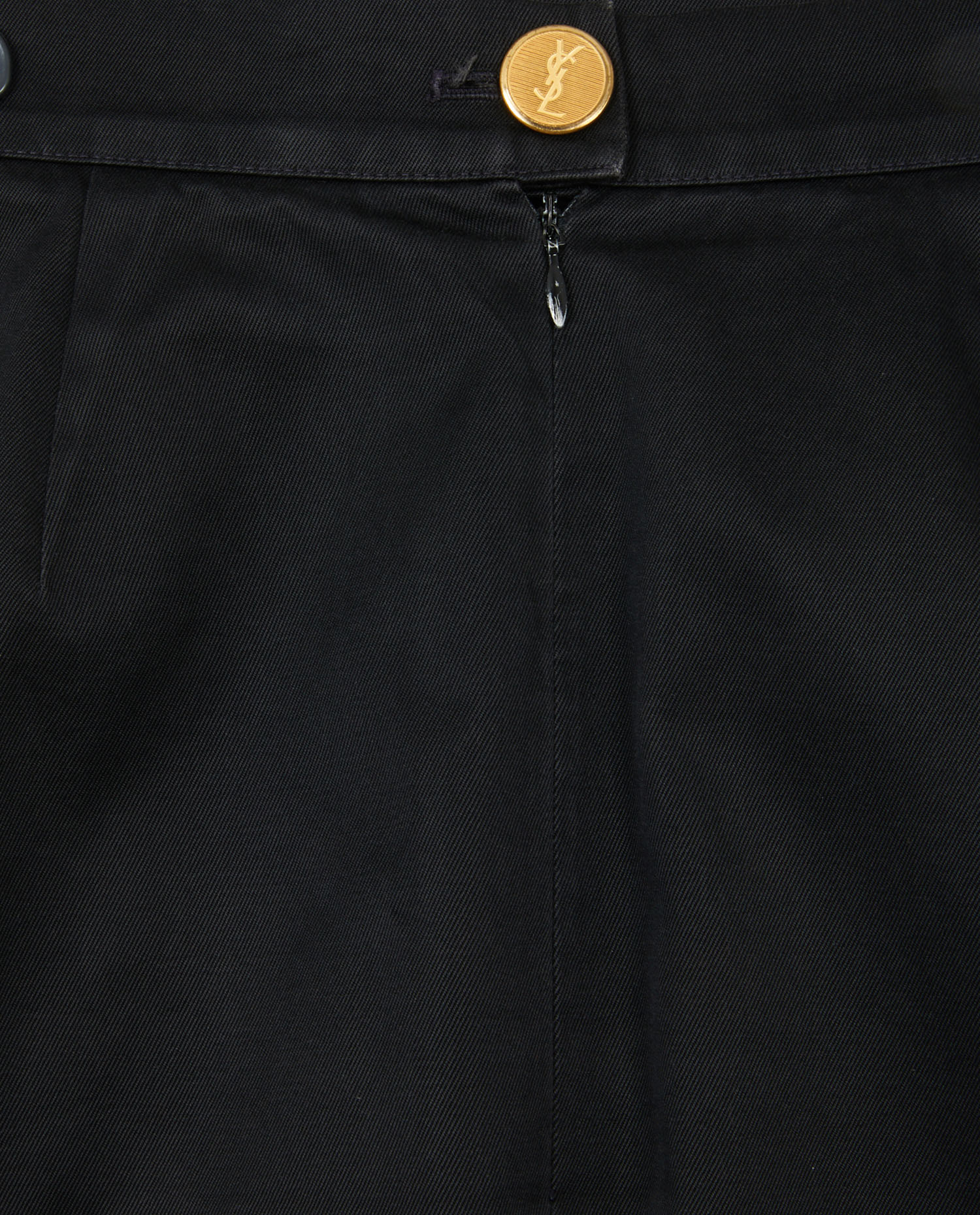 Ensemble veste et jupe Yves Saint Laurent en coton noir. Collection des années 80. Epaulettes. Cintrée a la taille. Boutons logo. En très bon état.