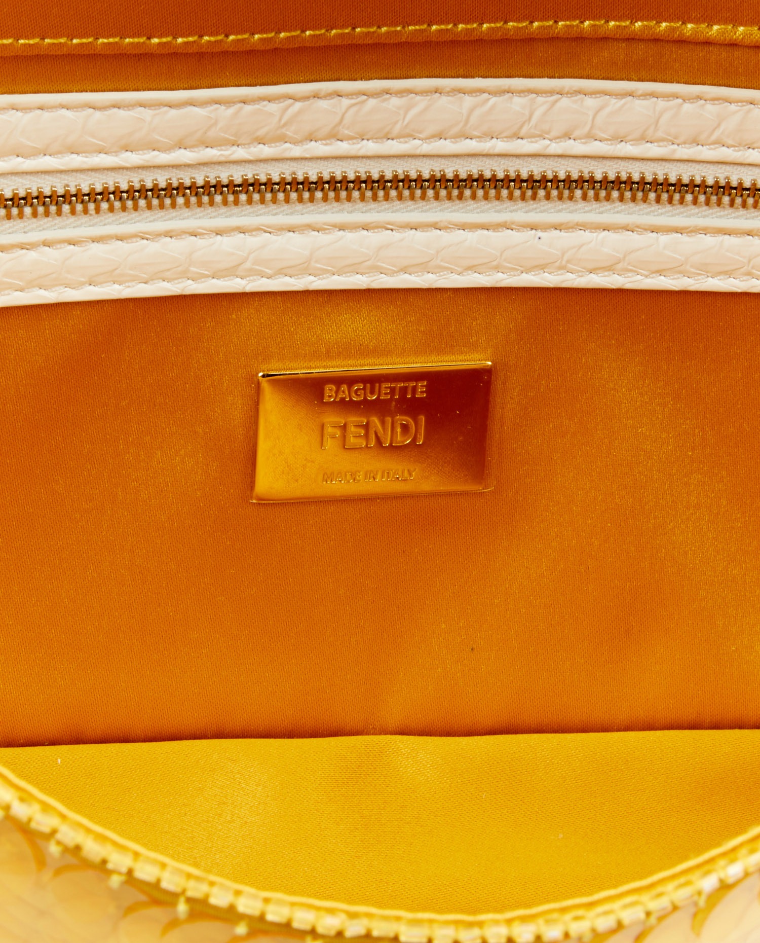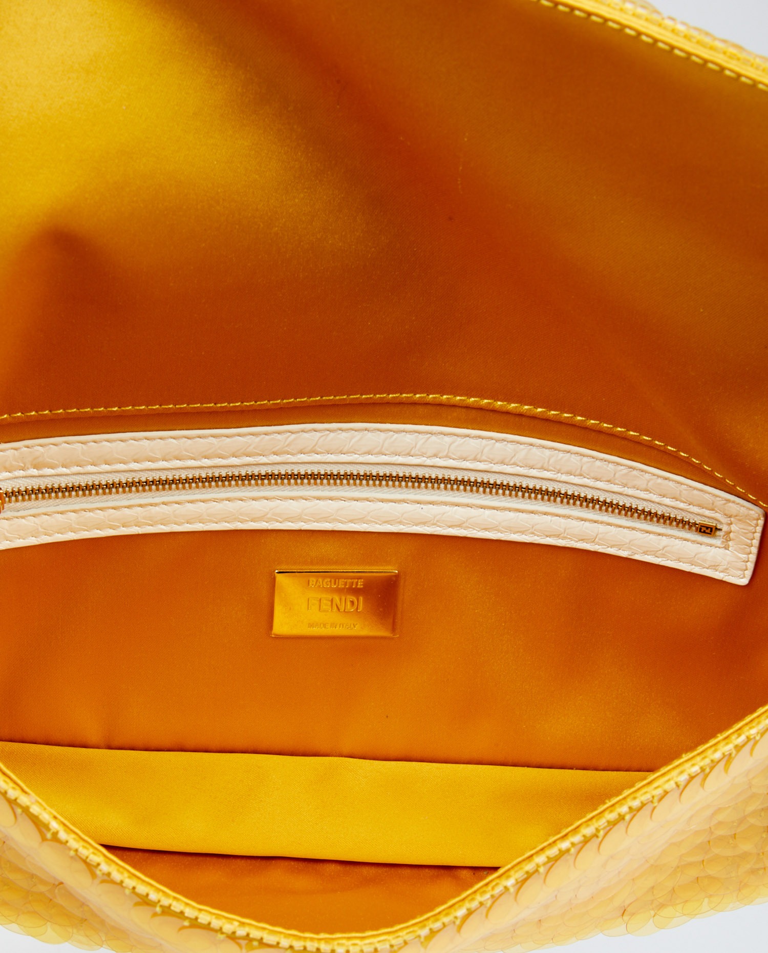 L’intérieur du sac est doublé de satin jaune vif, parfaitement assorti à la teinte extérieure. On y trouve une poche zippée plaquée et une étiquette en cuir embossée “FENDI Baguette – Made in Italy”. Les finitions sont impeccables.