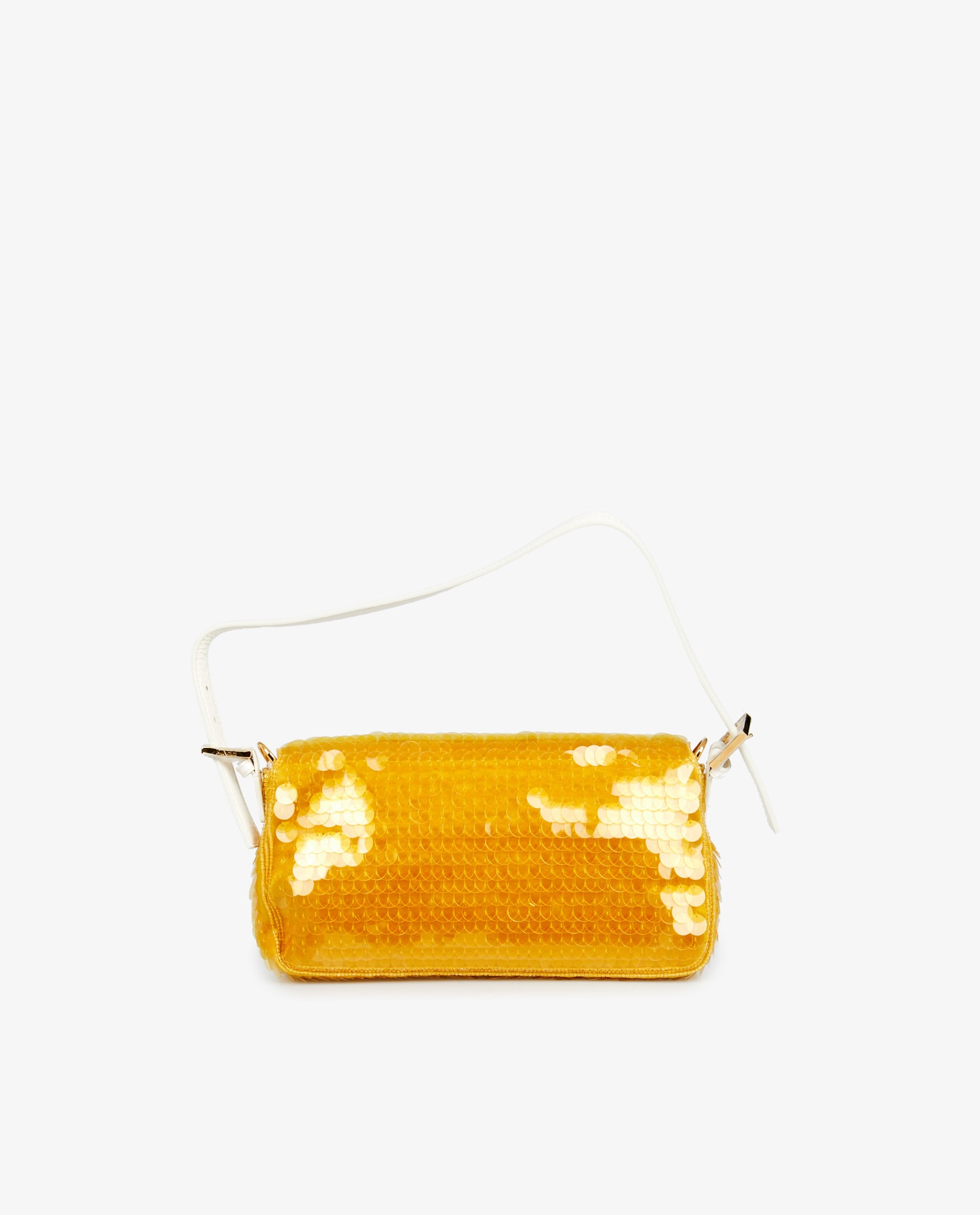 Introduit en 1997 par Silvia Venturini Fendi, le sac Baguette devient rapidement un objet culte, notamment après avoir été popularisé dans la série Sex and the City. Depuis, Fendi a décliné ce modèle en centaines de versions, mêlant techniques artisanales et matériaux inattendus. Cette version en sequins jaunes et Elaphe blanc s’inscrit dans cette lignée de réinterprétations créatives, en rendant hommage à l’esprit original tout en affirmant une esthétique festive et luxueuse.