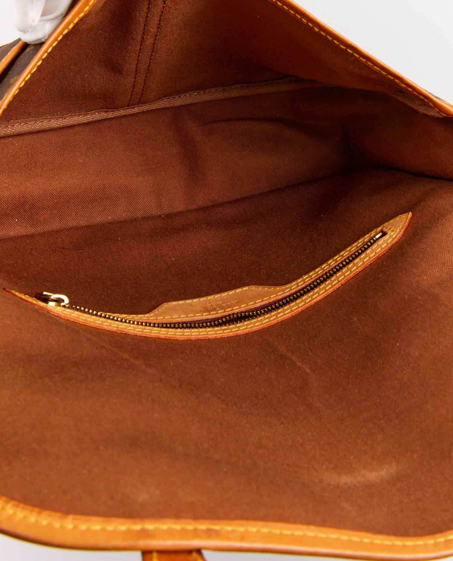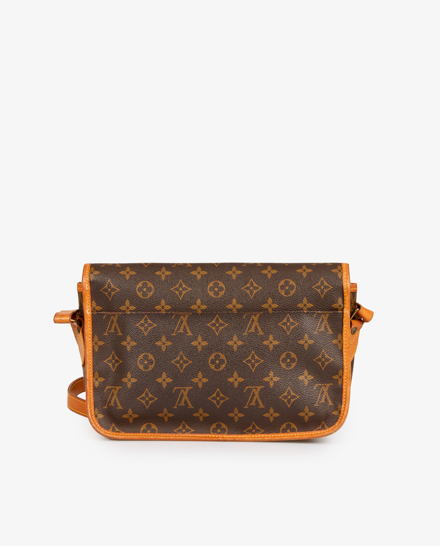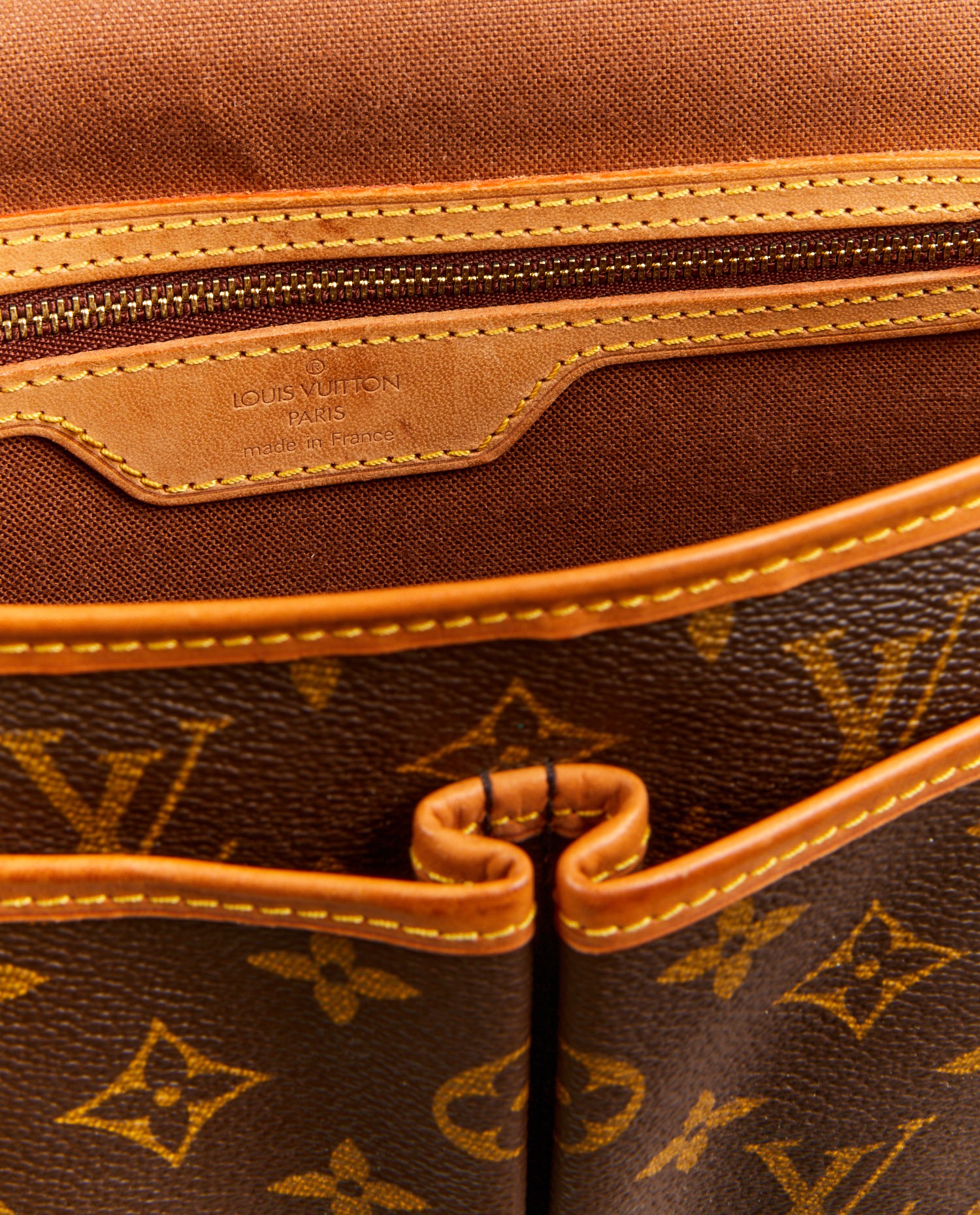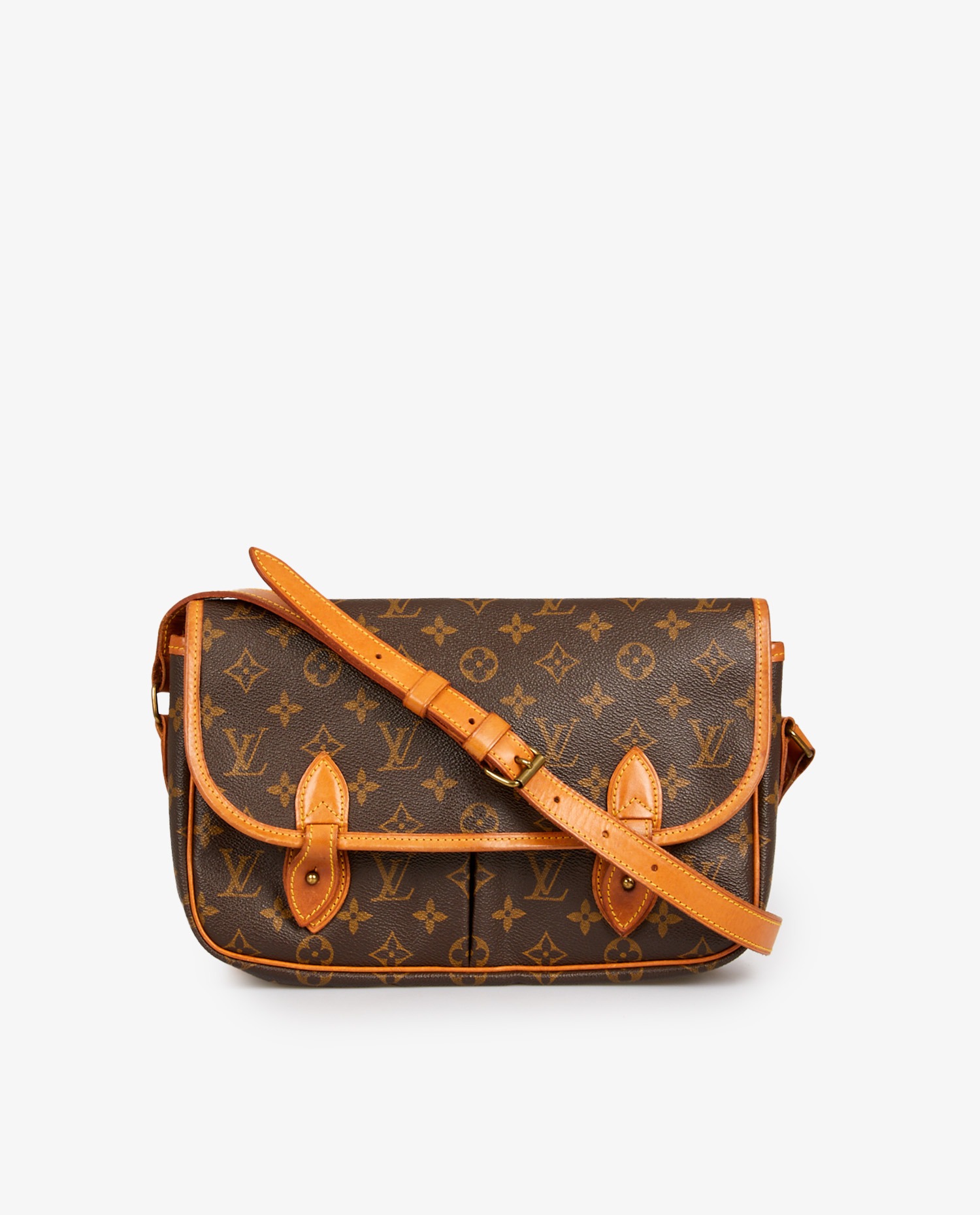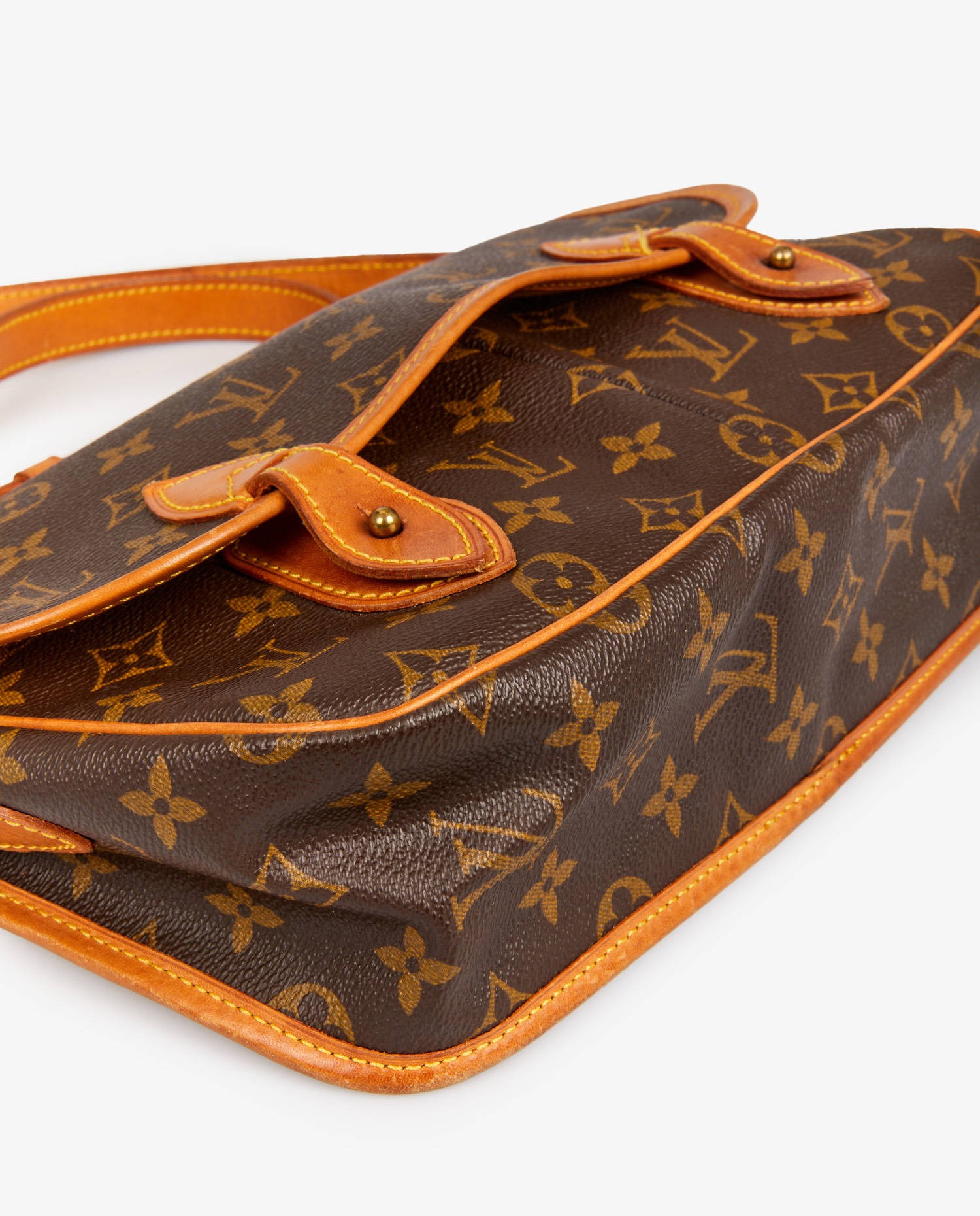 Gibecière Louis Vuitton en toile monogramme et cuir de vache. Idéal pour tous les jours. Porté épaule ou crossbody à l’aide d’une bandoulière ajustable (au plus court 115cm, au plus long 133cm). L’intérieur est en tissu marron. En très bon état. Légère patine du cuir. Voir photos.