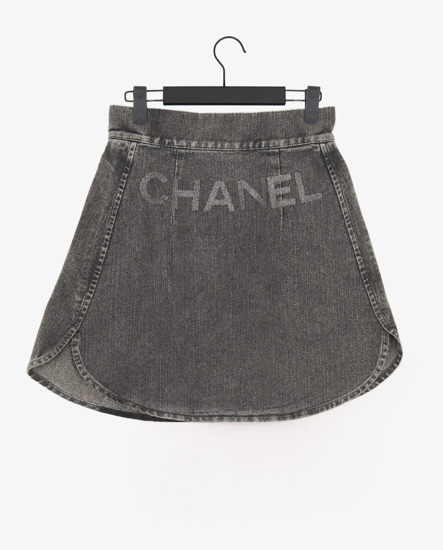 Le denim gris délavé présente une finition subtilement usée, évoquant l’aspect naturel du temps sur la matière. Le devant est structuré par deux grandes poches zippées obliques, une braguette à fermeture bouton gravé du logo CC en métal argenté, et des plis discrets à la taille pour plus d’aisance. À l’arrière, le mot “CHANEL” est brodé en grand dans la même teinte, s’intégrant dans la toile de manière subtile mais lisible. La silhouette trapèze est mise en valeur par une base arrondie, légèrement évasée, qui adoucit l’allure du denim.