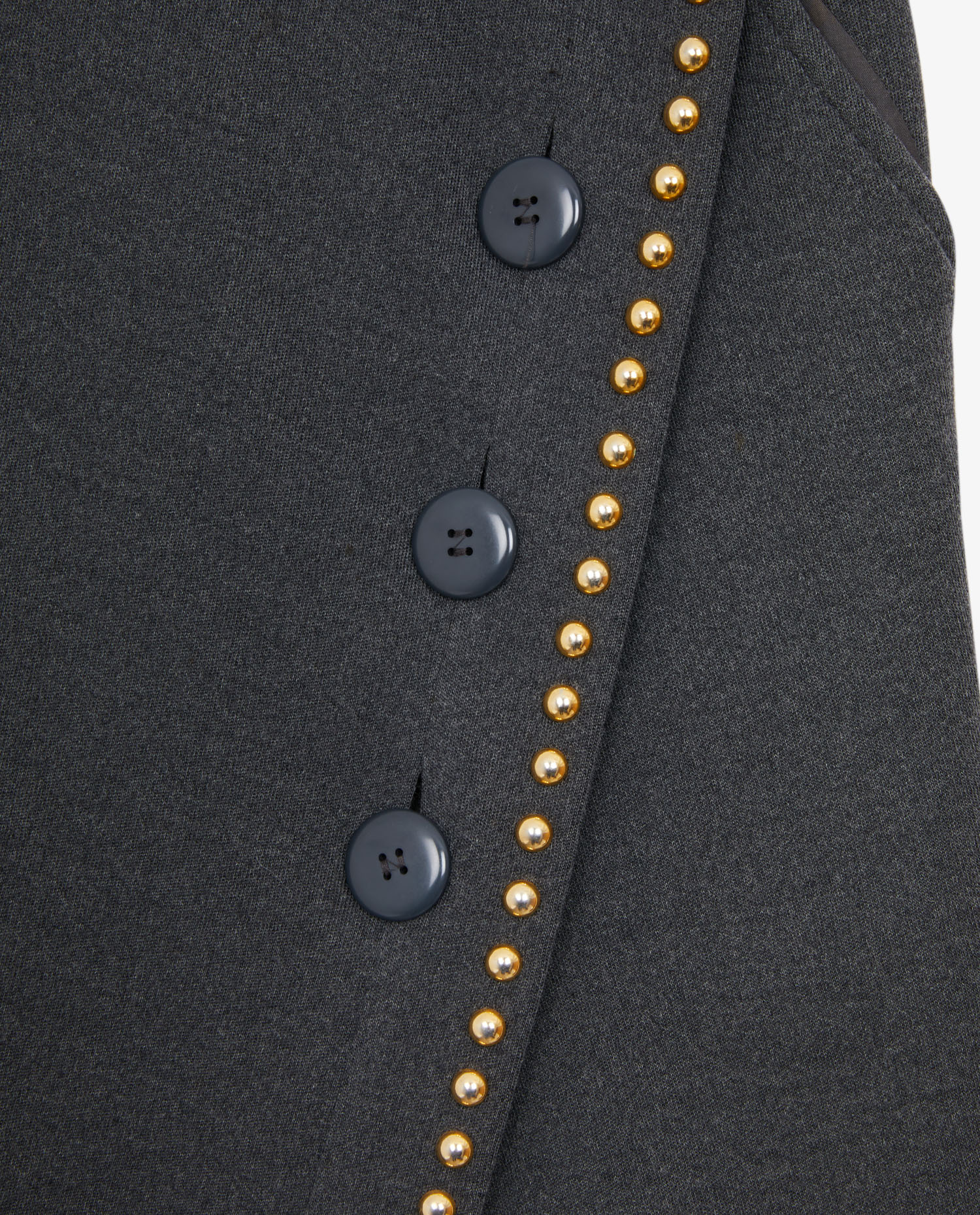 Jupe grise asymétrique Yves Saint Laurent en jersey de coton. Poches diagonales détails de boutons et pin’s en métal. En très bon état.