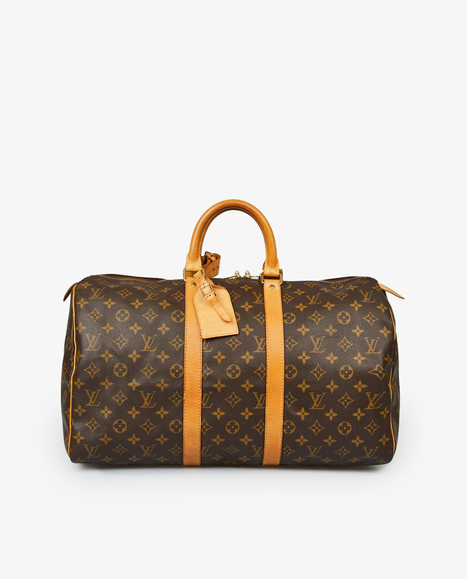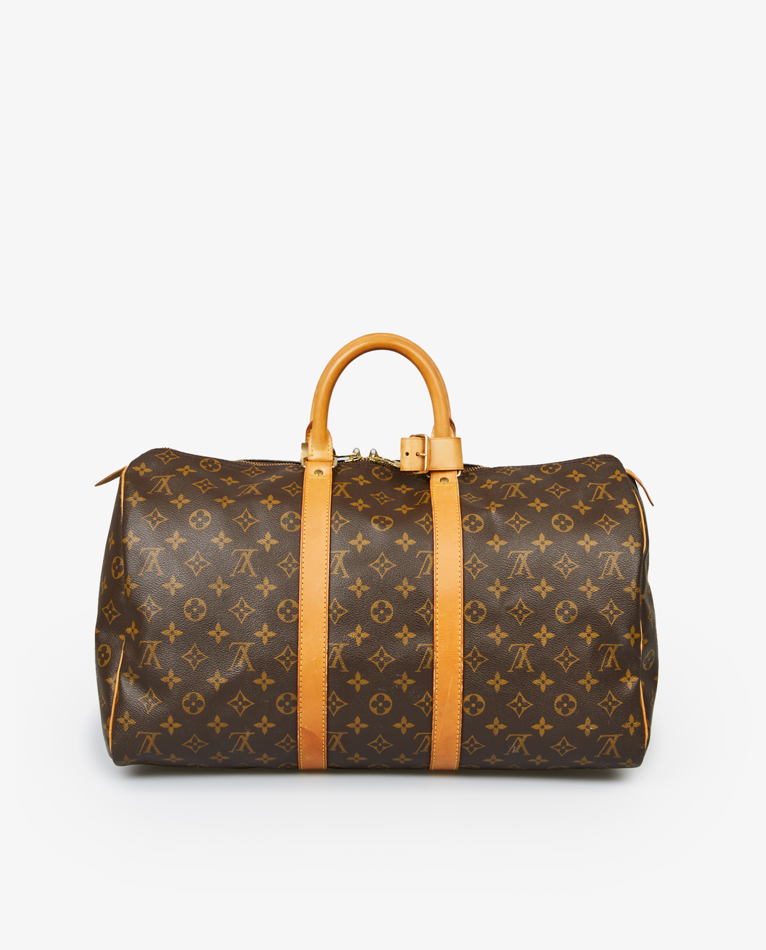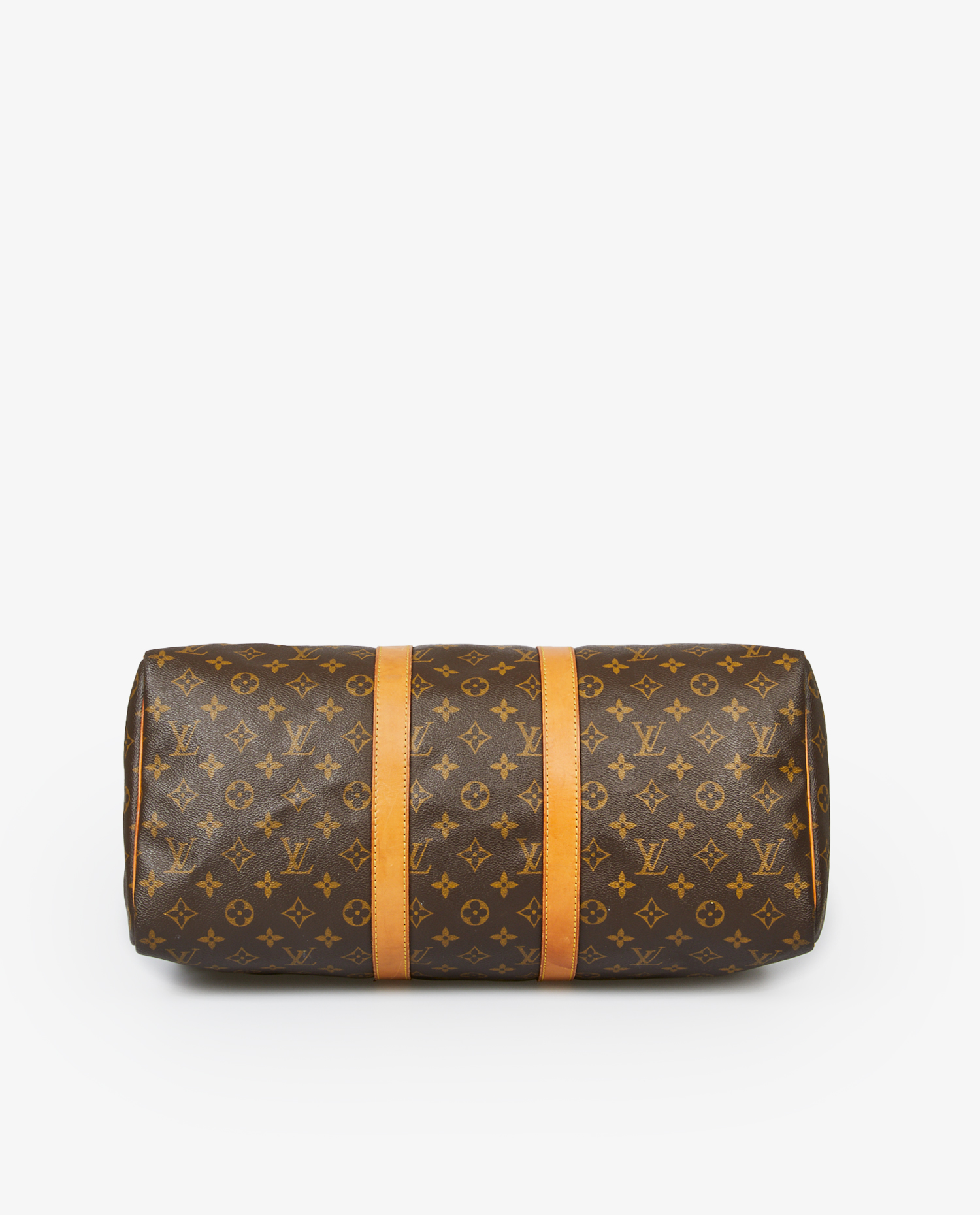 Sac Keepall 45cm Louis Vuitton en toile monogramme et finitions en cuir de vache naturelle. Fermeture zippée. En très bon état.
