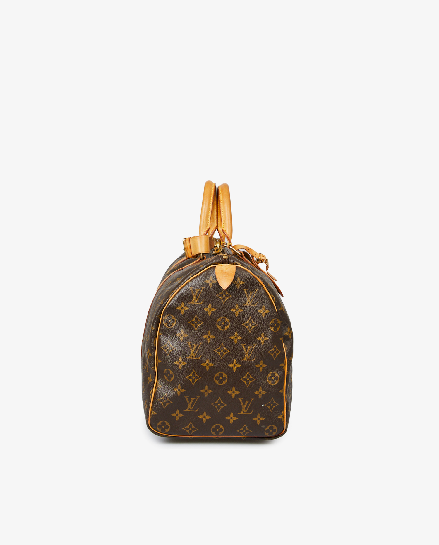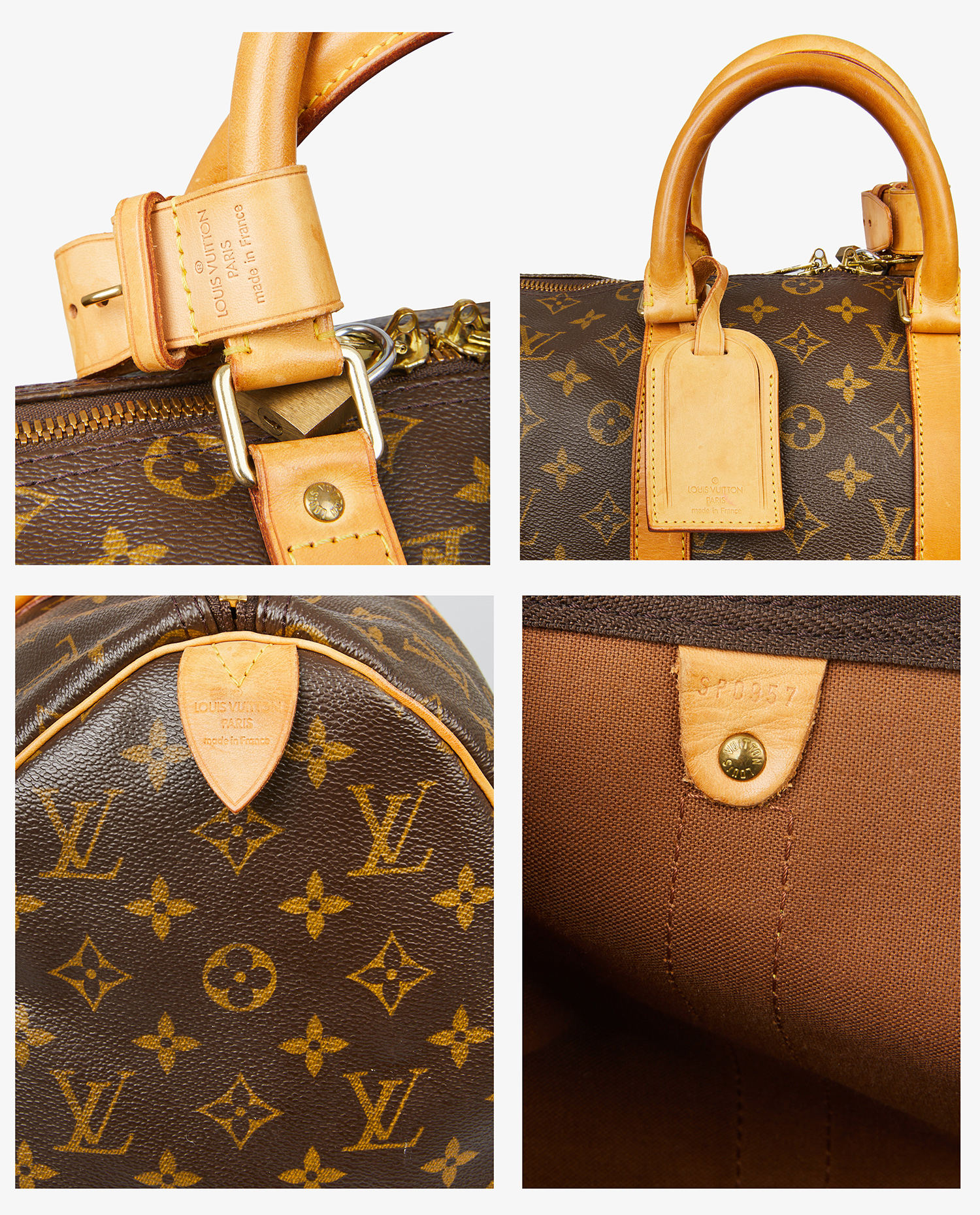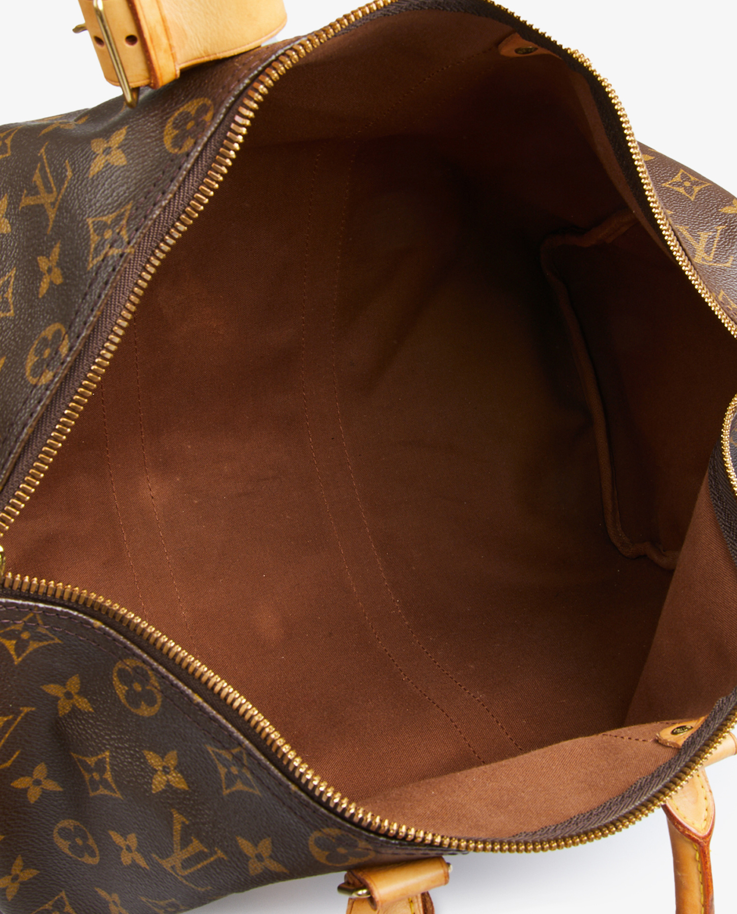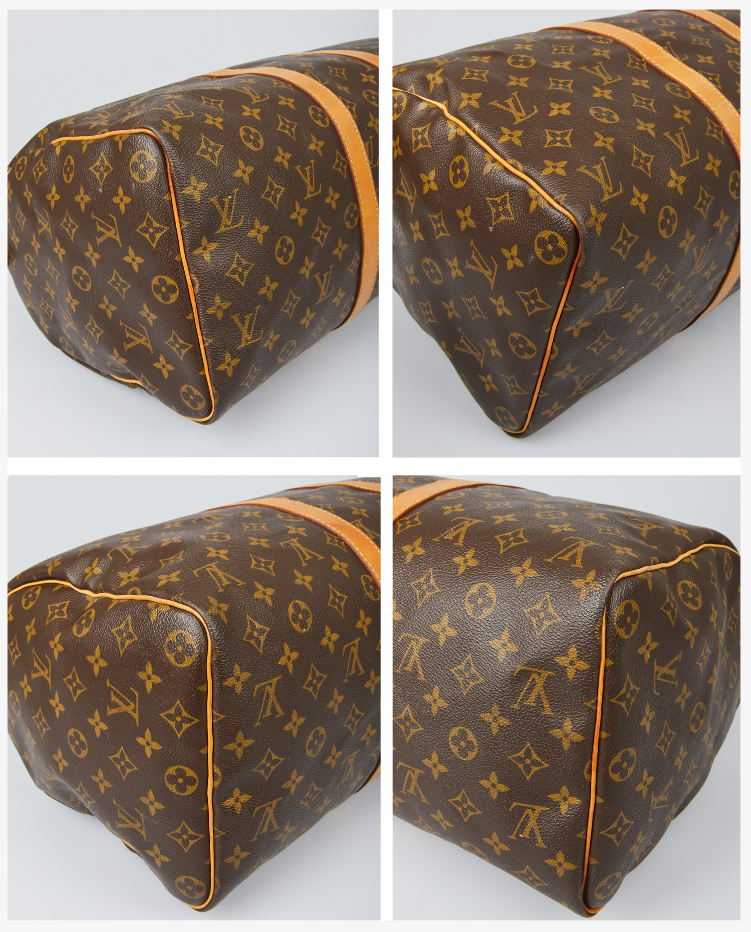 Sac Keepall 45cm Louis Vuitton en toile monogramme et finitions en cuir de vache naturelle. Fermeture zippée. En très bon état.