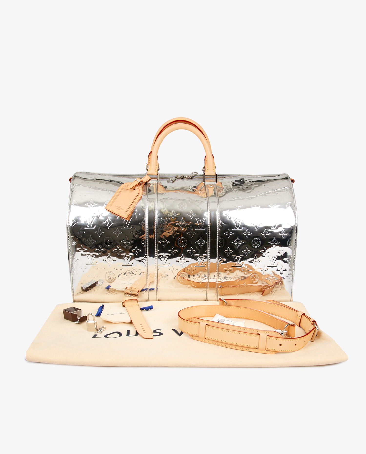 Sac Keepall 50 Louis Vuitton monogram mirror fait par Virgil Abloh en toile refléchissante. Jamais porté. Livré dans son dustbag et boite d’origine.