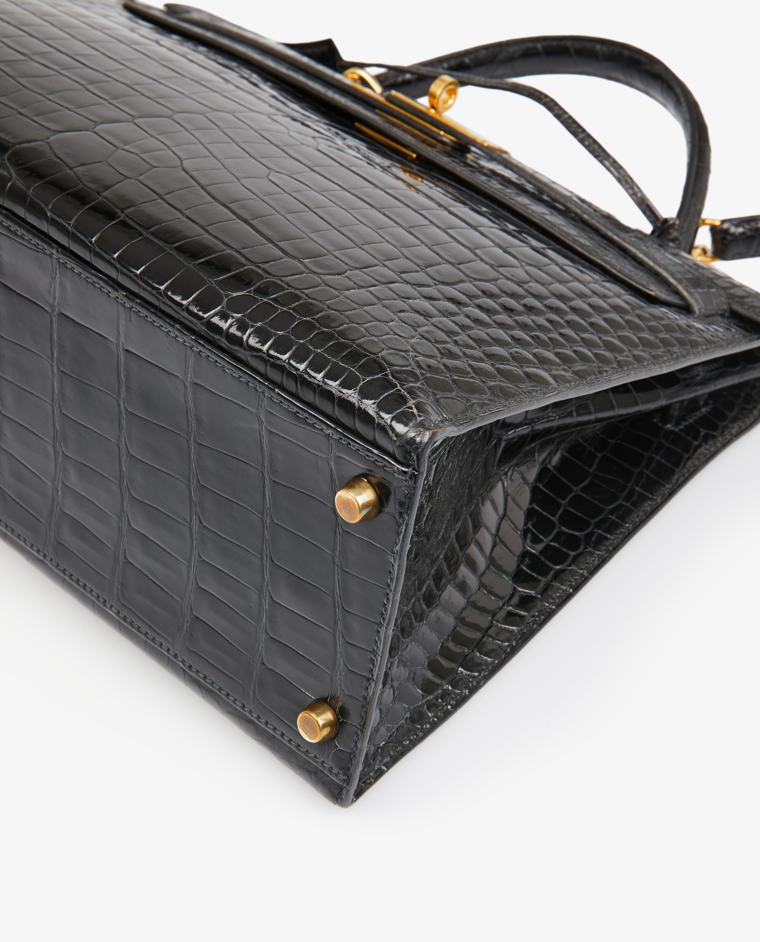 Sac Kelly 32 Hermès en crocodile porosus noir. Tirette, clochette et cadenas. Porté main ou à l’épaule à l’aide d’une bandoulière amovible qui mesure 90cm. Stamp V dans un rond, année 1992. En très bon état.