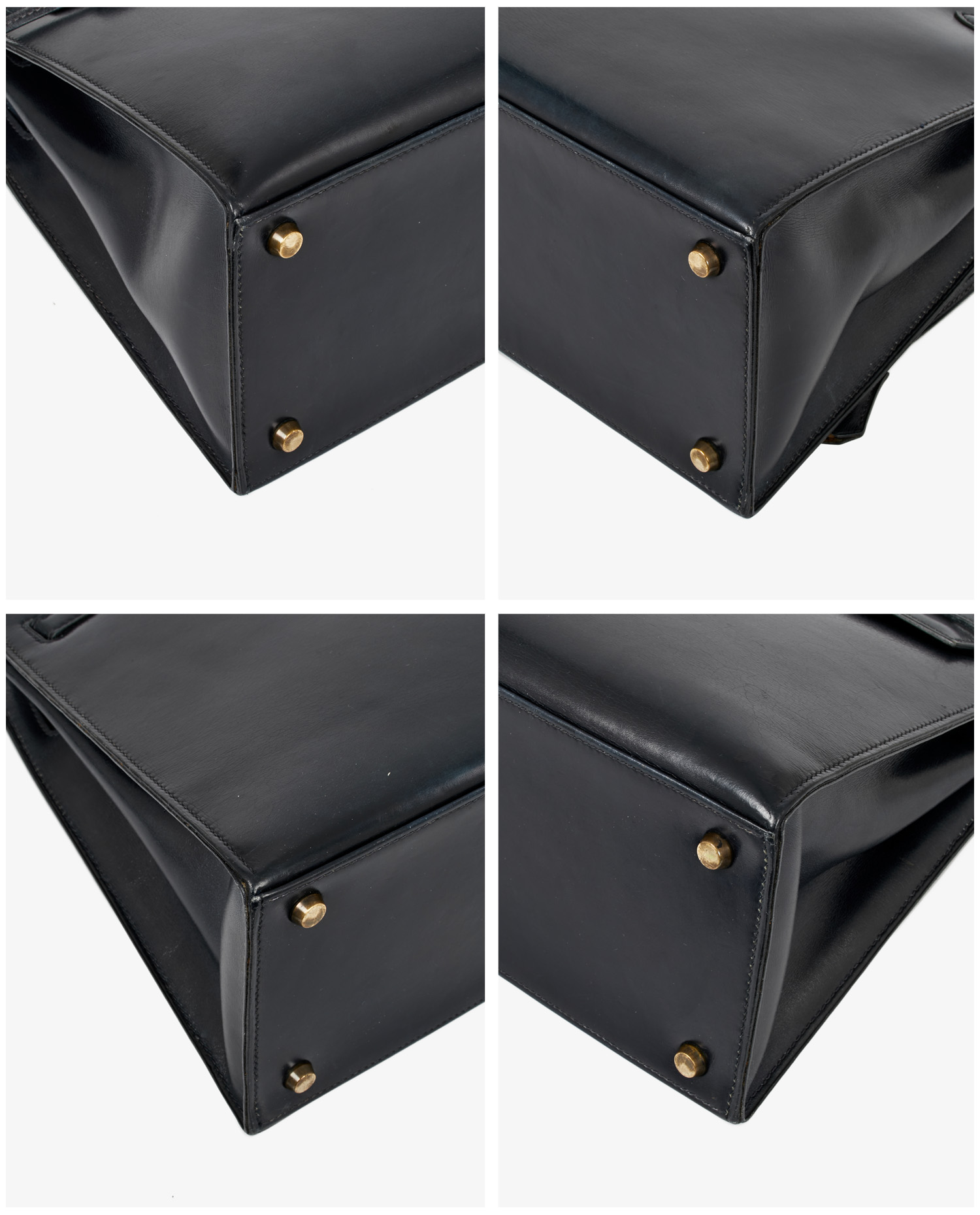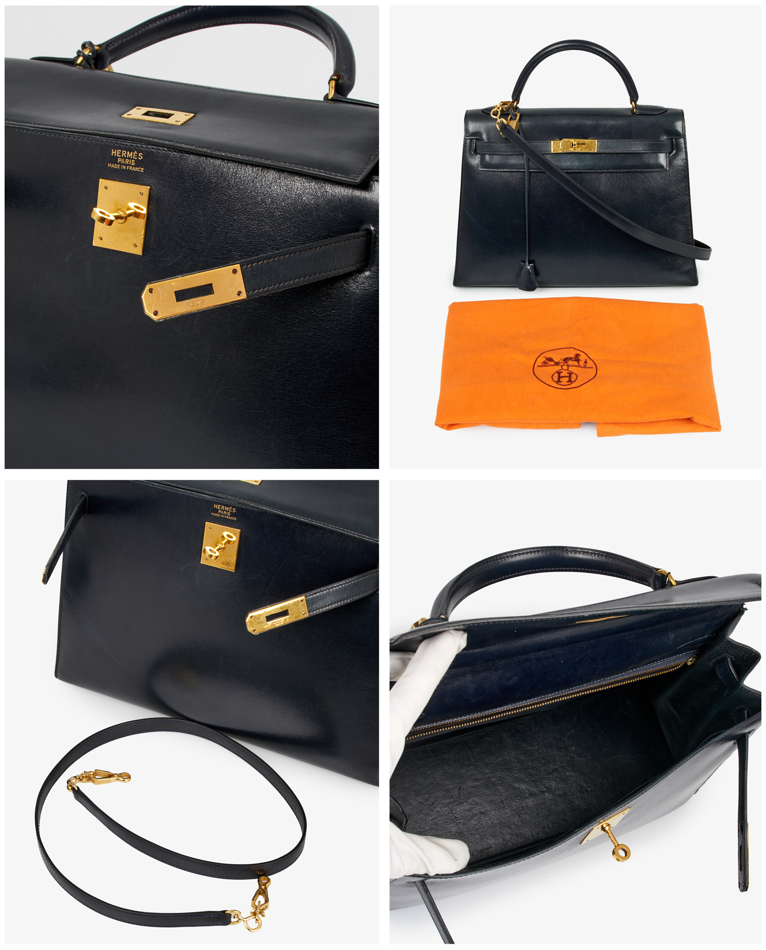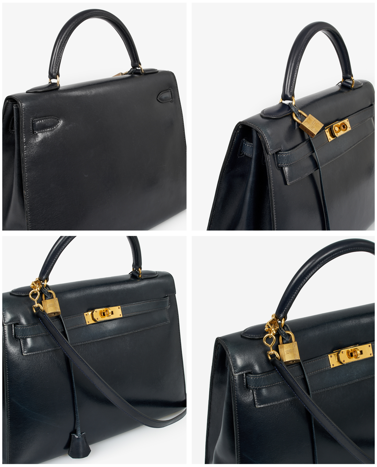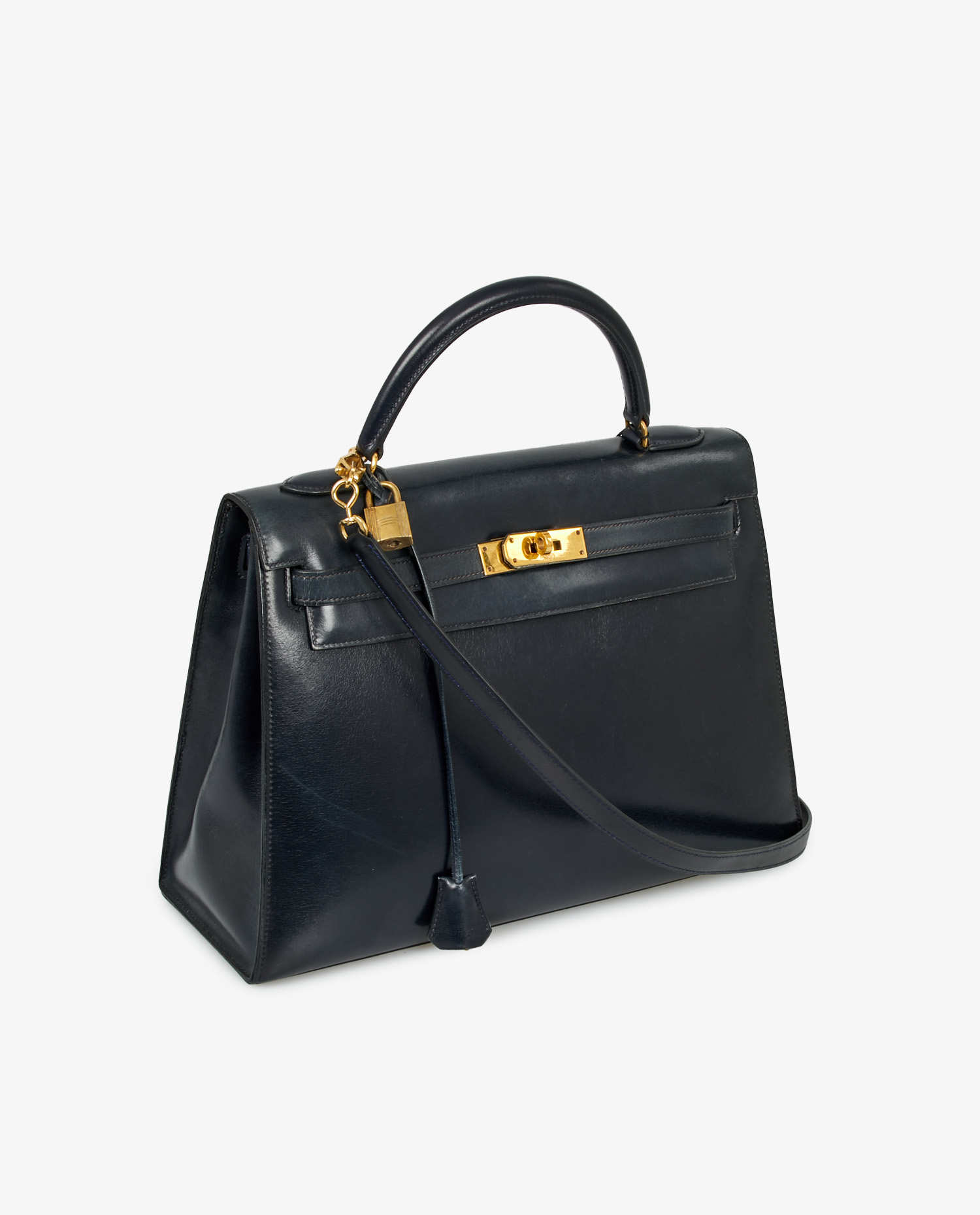 Sac Kelly 32 Hermès vintage en cuir box bleu marine. En très bon état.