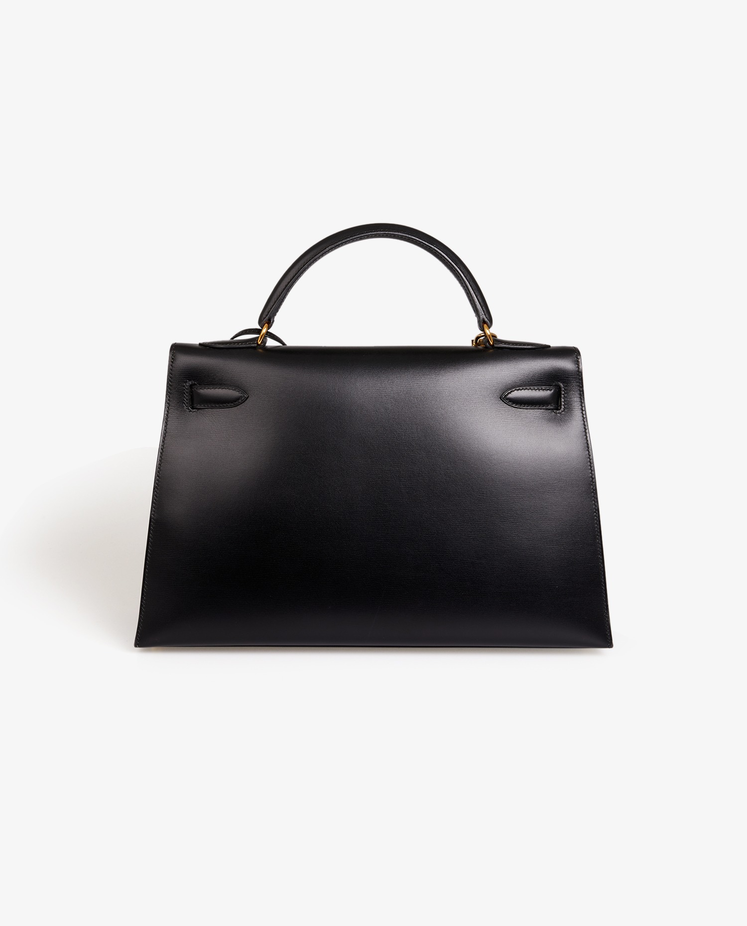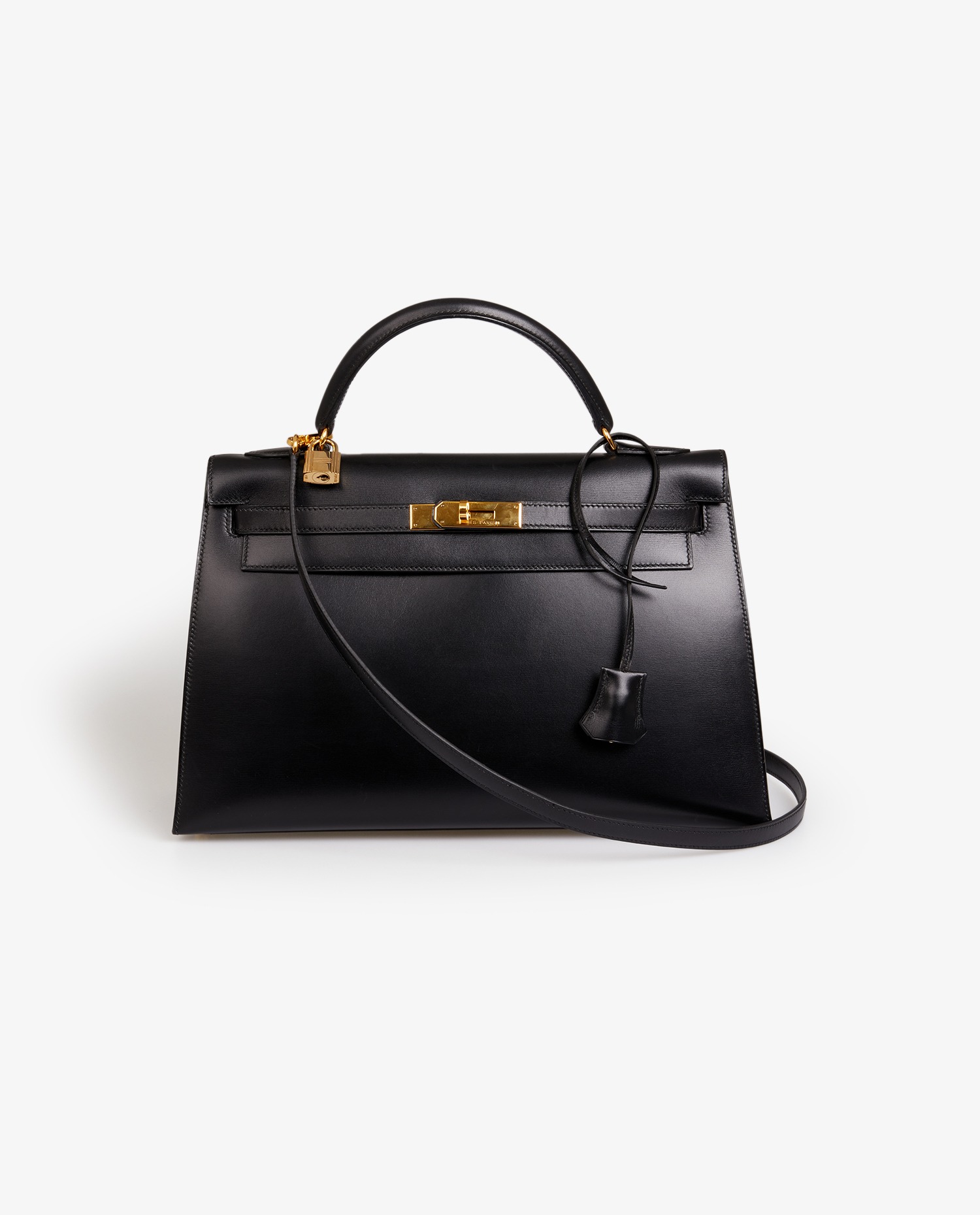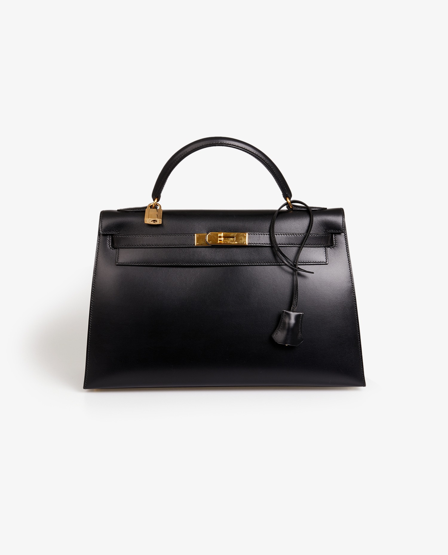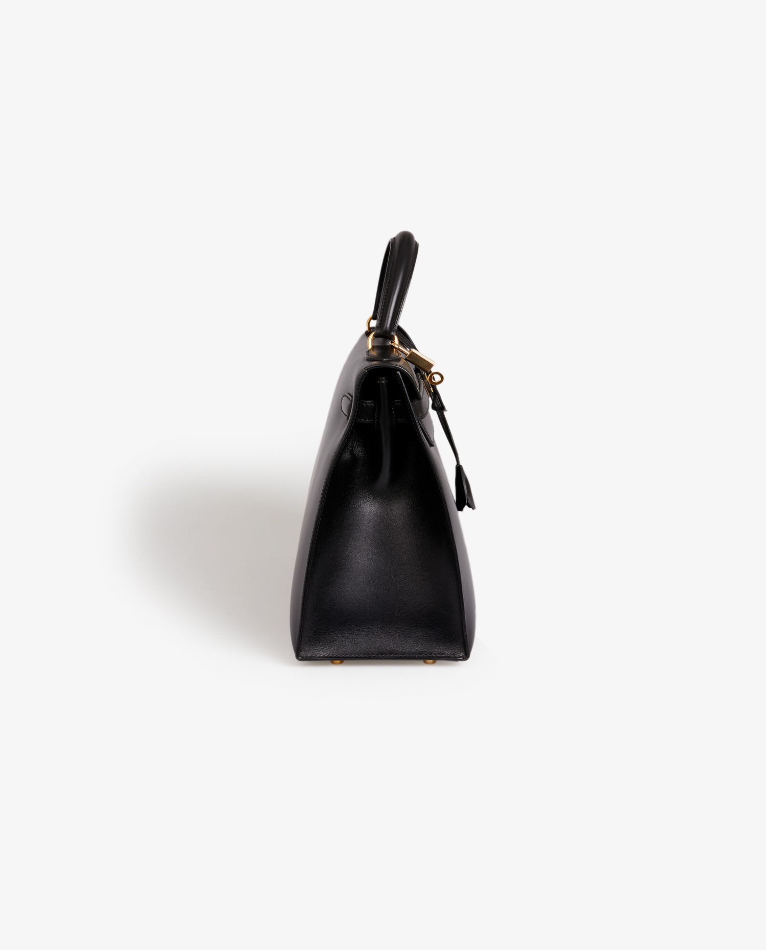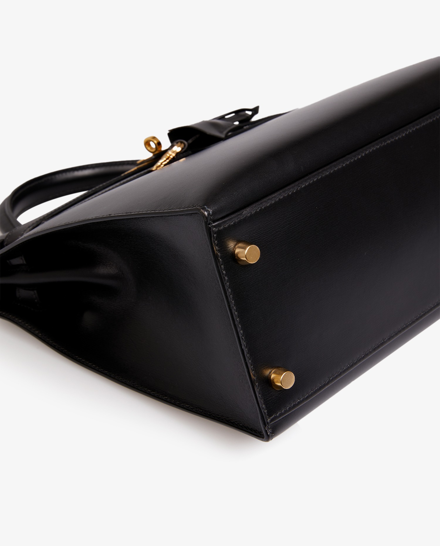 Sac Kelly 32 sellier noir Hermès. Lettre C dans un carré, année 1999. Il se porte de deux façons différentes, à la main et à l’épaule à l’aide d’une bandoulière amovible. En très bon état, quelques légères griffures mais très peu visible. Tirette, clochette, clefs et cadenas.