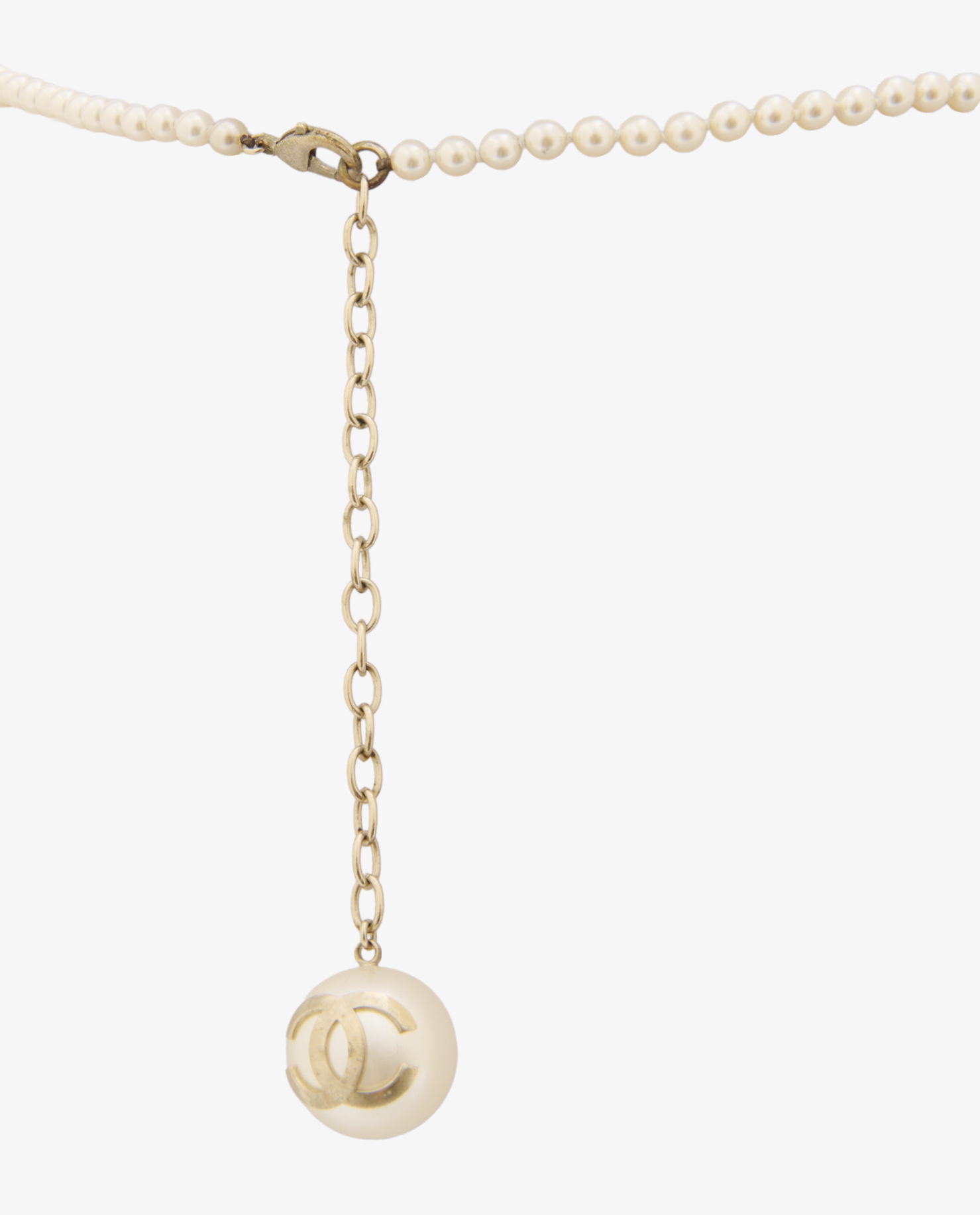 Le collier mesure environ 110 cm, formé de perles en résine nacrée à finition lustrée. Les perles sont agencées dans un ordre croissant puis décroissant, avec en son centre une large perle qui attire le regard. À l’arrière, une chaînette de réglage dorée permet d’ajuster légèrement la longueur, et se termine par une perle sphérique décorée du logo Chanel en métal doré. L’ensemble présente un jeu subtil de volumes, accentuant le mouvement du bijou lorsqu’il est porté.