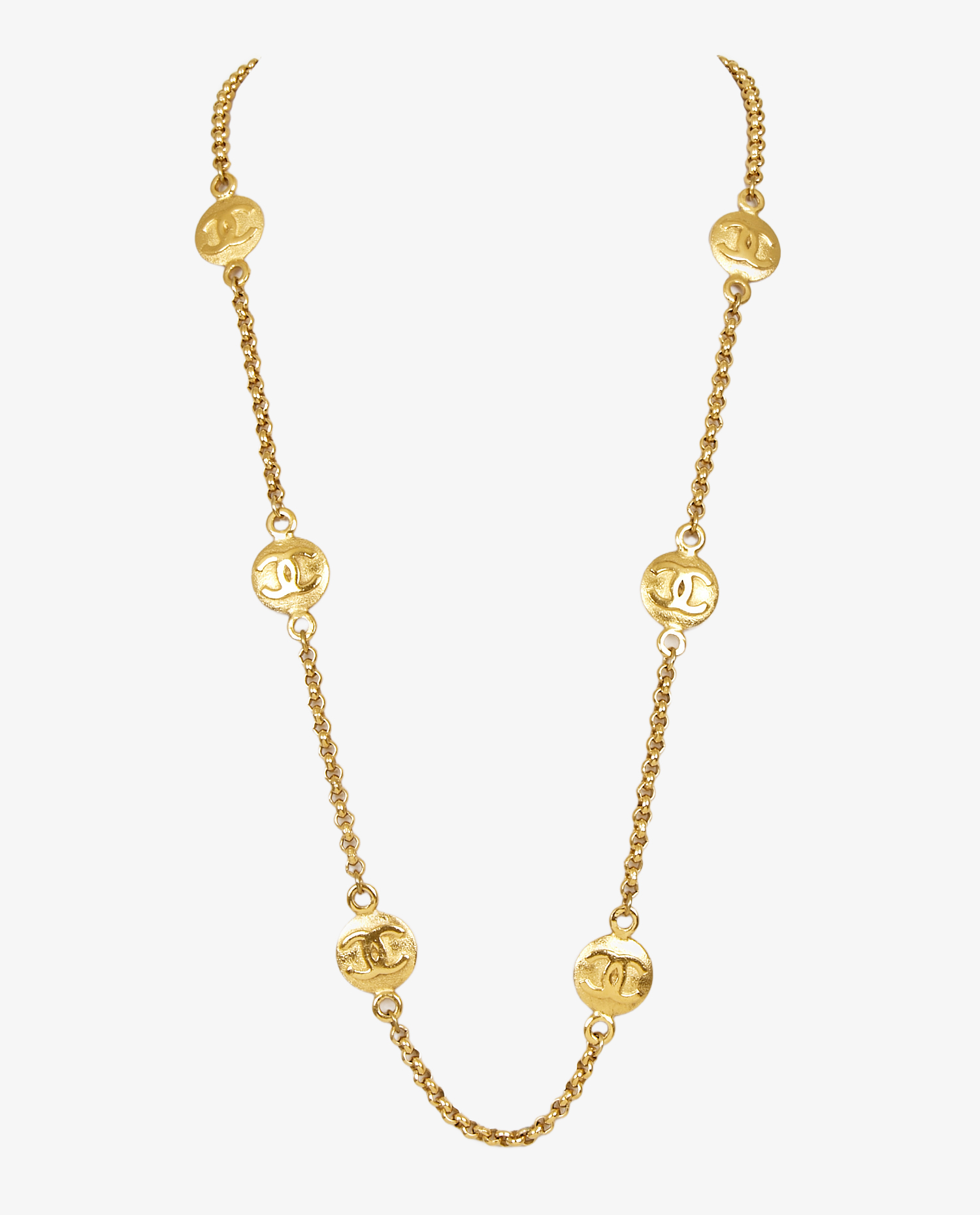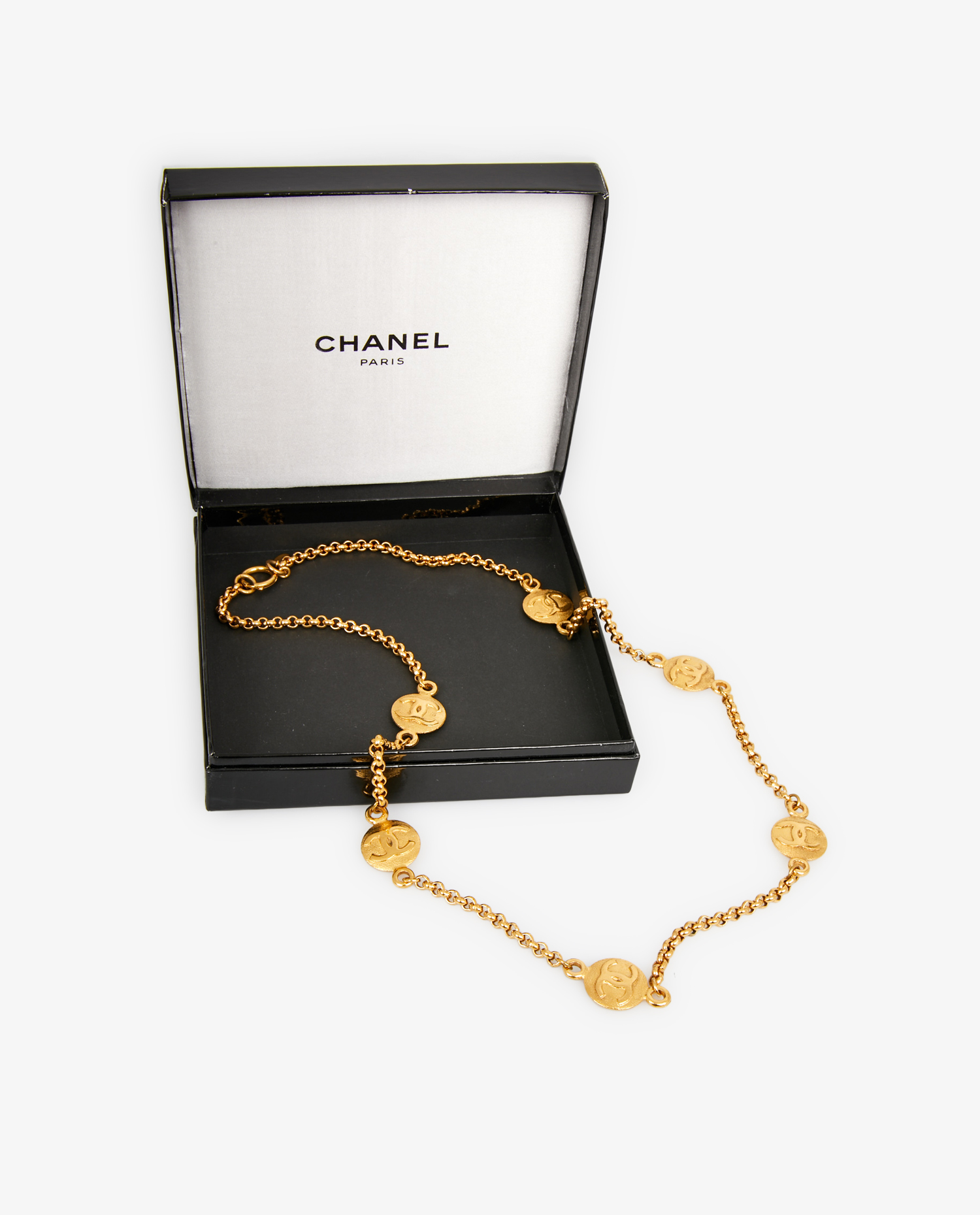 Long sautoir Chanel vintage avec des ronds CC en plaqué or 24K. Collection 1990. La longueur de la chaine est de 93cm. En très bon état. Livré sa boite d’origine.