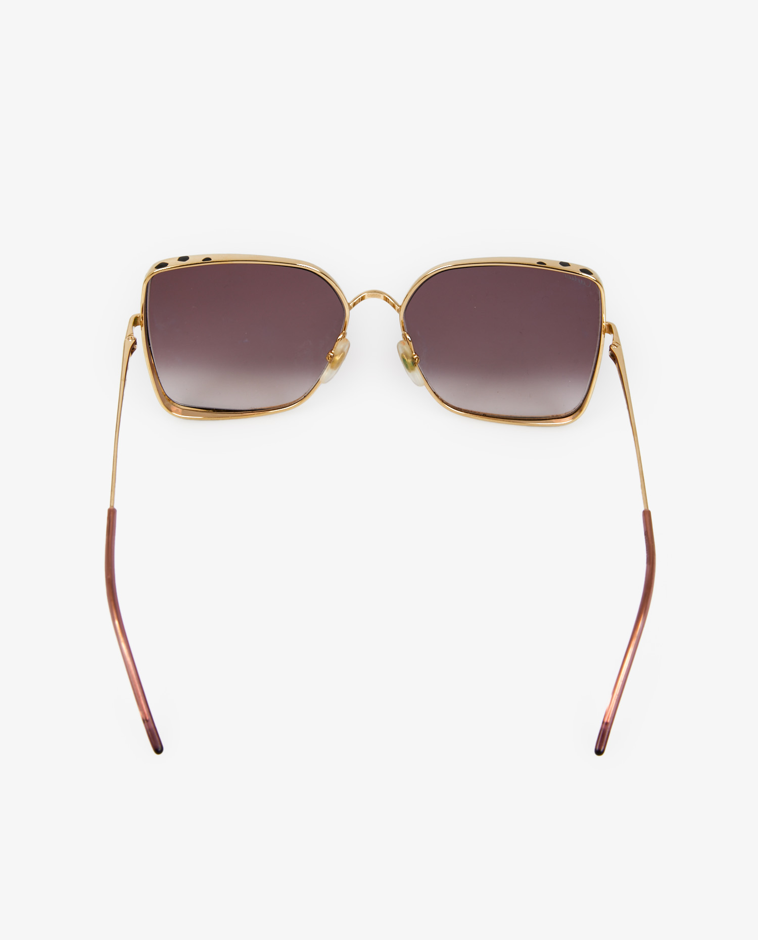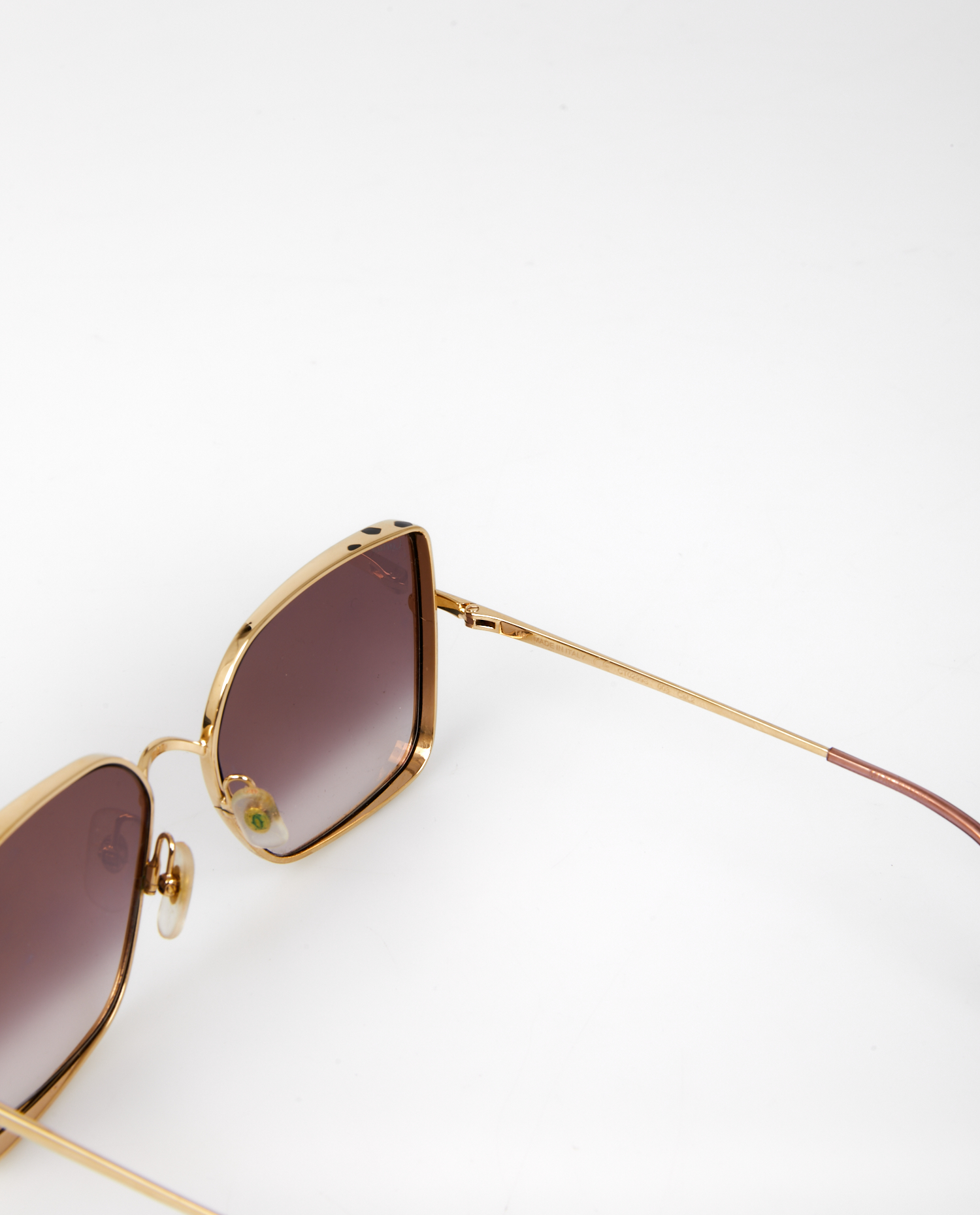 La face avant adopte une forme carrée légèrement papillon, avec des angles adoucis pour flatter la ligne du visage. Les verres, teintés d’un brun profond aux reflets rosés et violacés, sont mis en valeur par une monture métallique dorée brillante plaqué Or 24K. Sur les flancs, les inserts noirs laqués en forme de taches rappellent discrètement l’esthétique Panthère, emblème iconique de Cartier. Les plaquettes réglables et les charnières renforcées témoignent d’une conception haut de gamme pensée pour un usage quotidien.