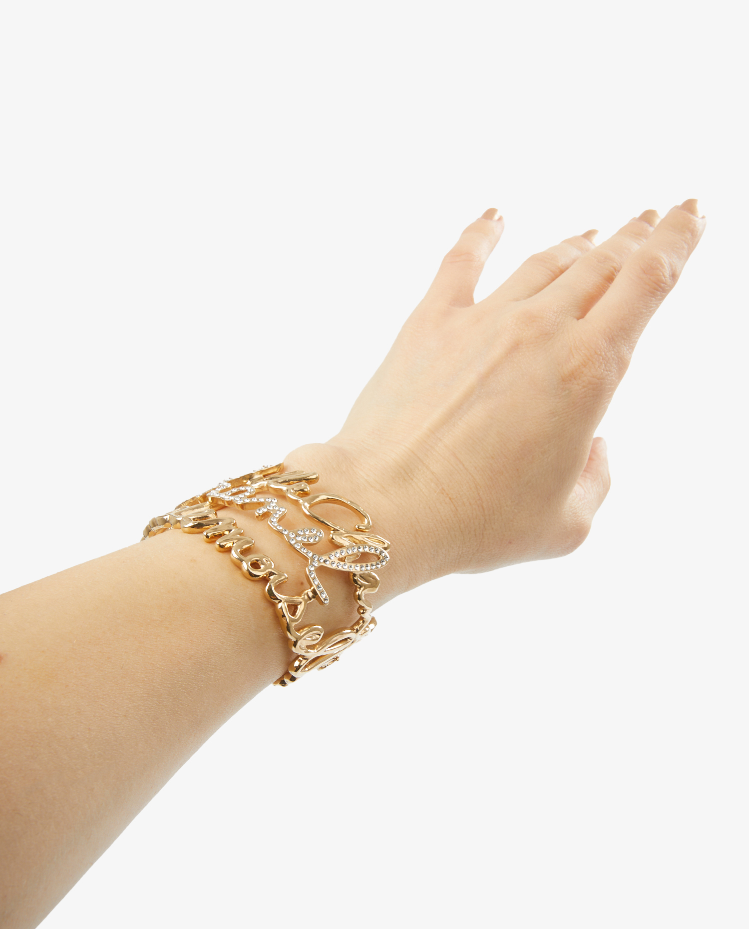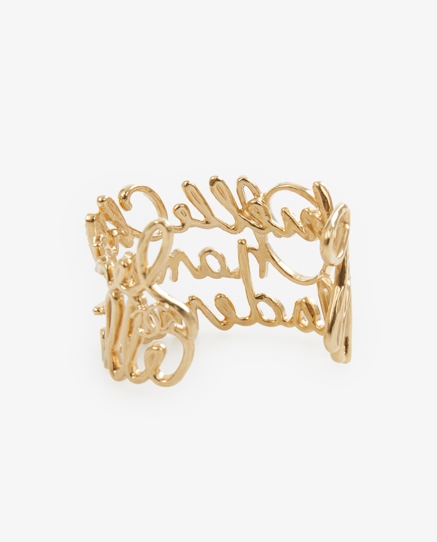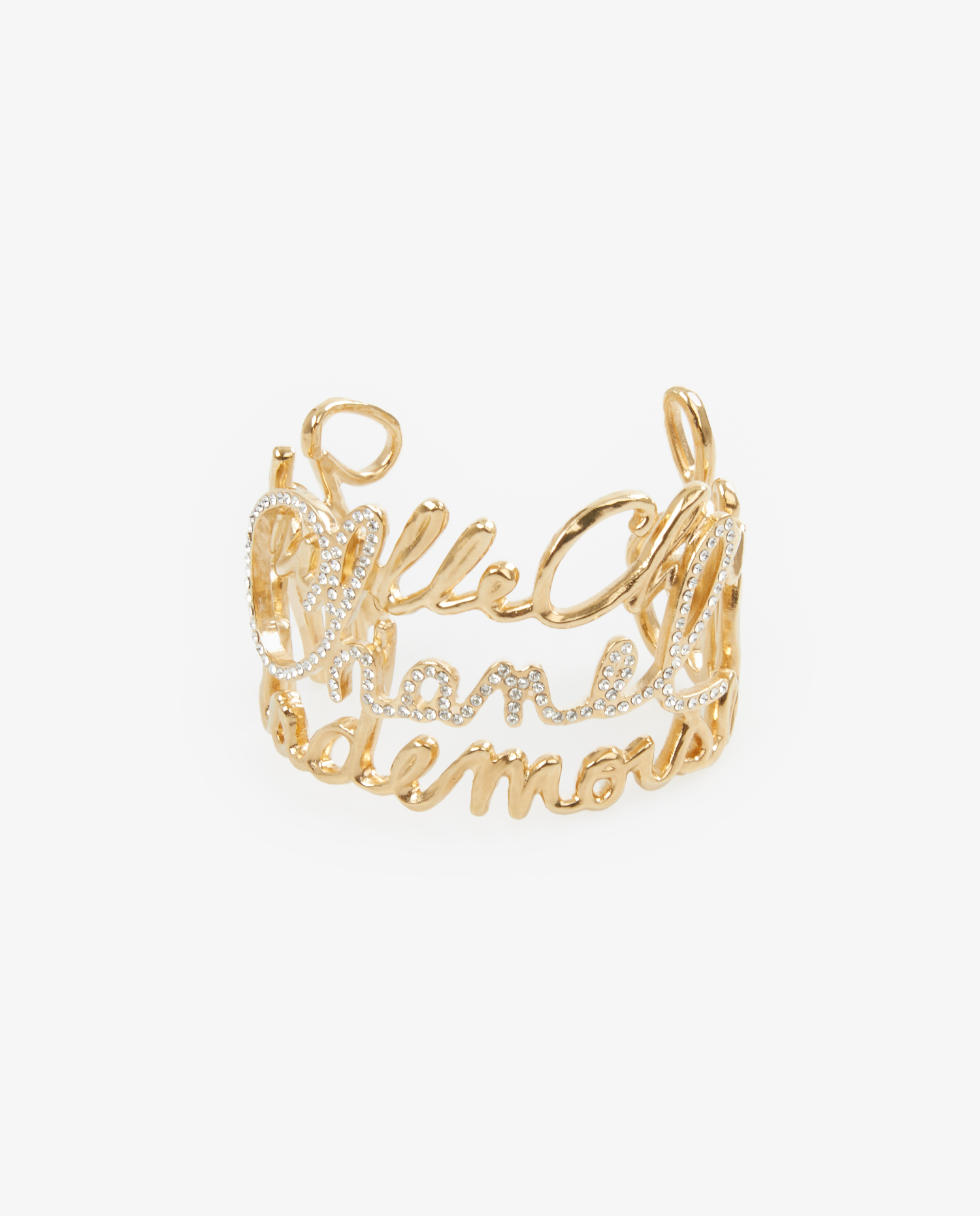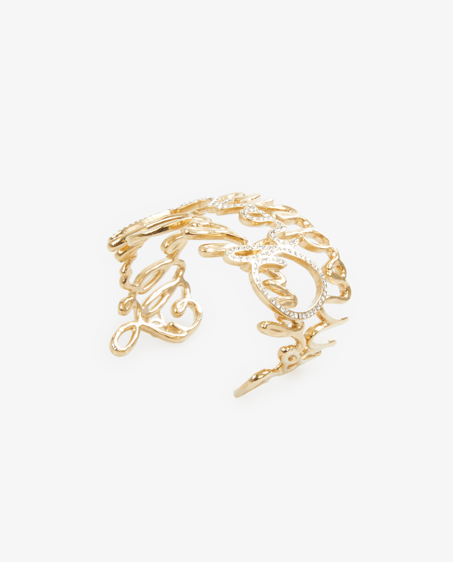 Manchette Chanel en métal doré et strass. Tour de poigné 18cm. Jamais porté.