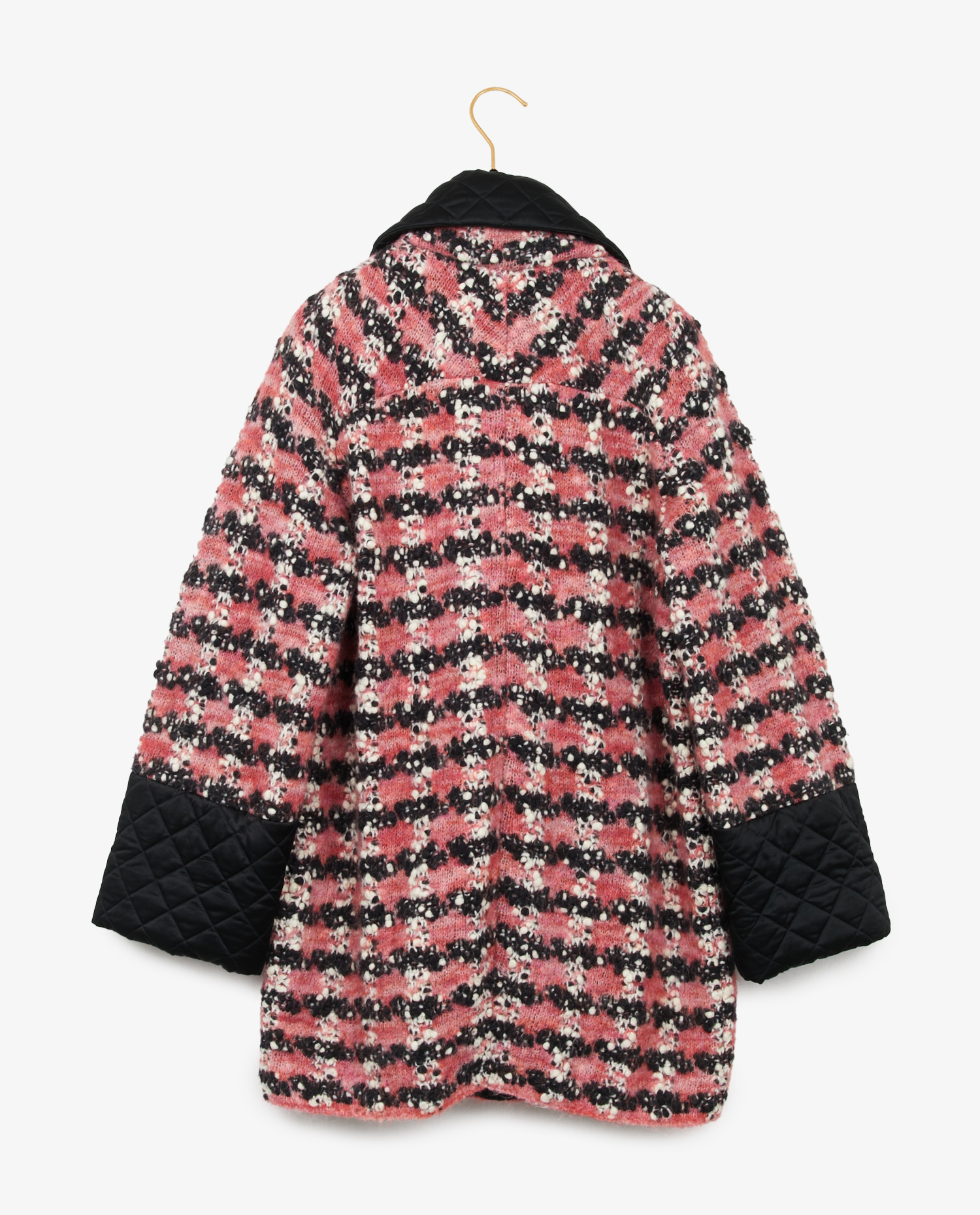 Manteau Chanel en tweed rose, blanc et marron. Col et poignées en satin matelassé noir. Manches raglan. Collection Hiver 2012. En très bon état. Prix public 5500 euros.