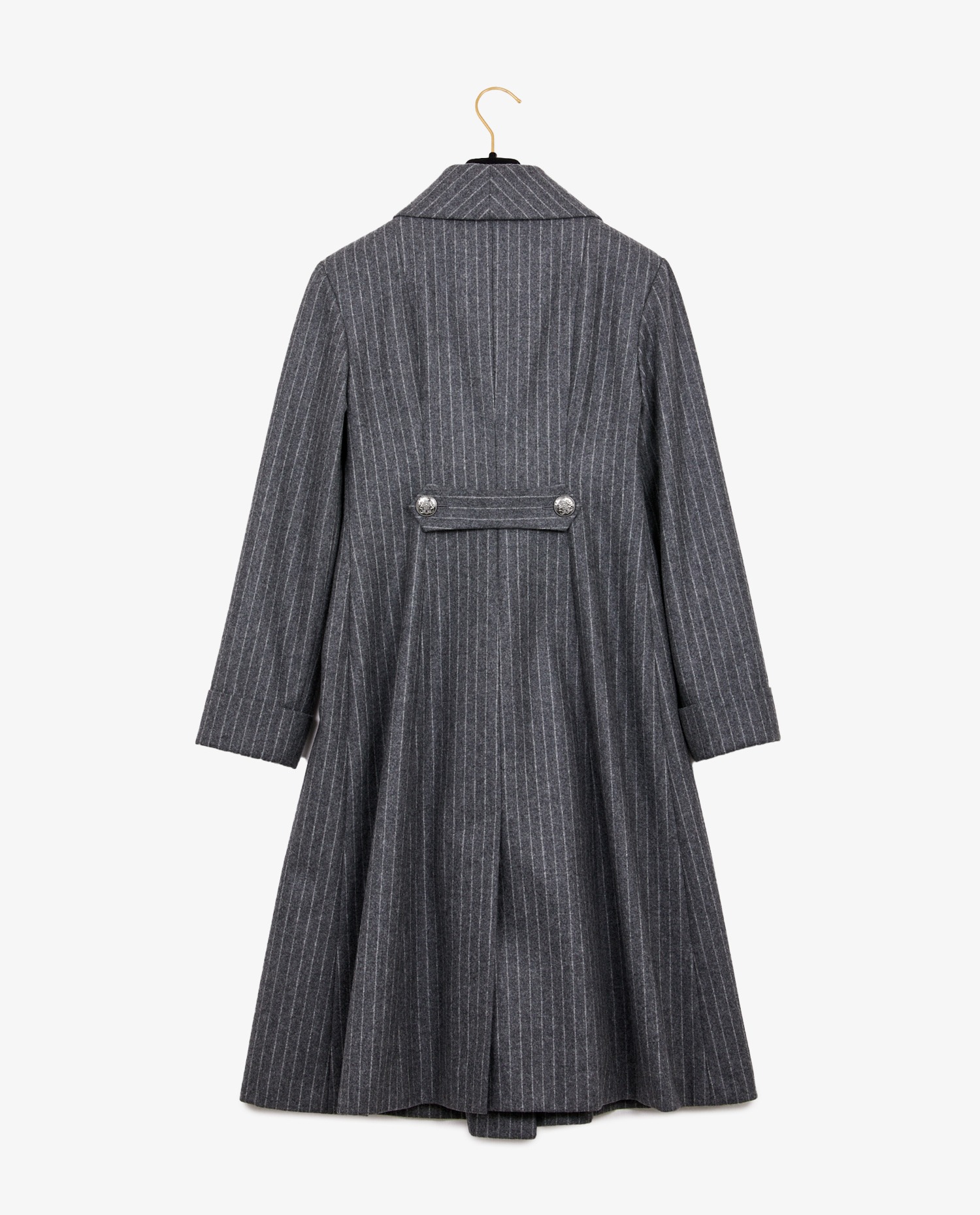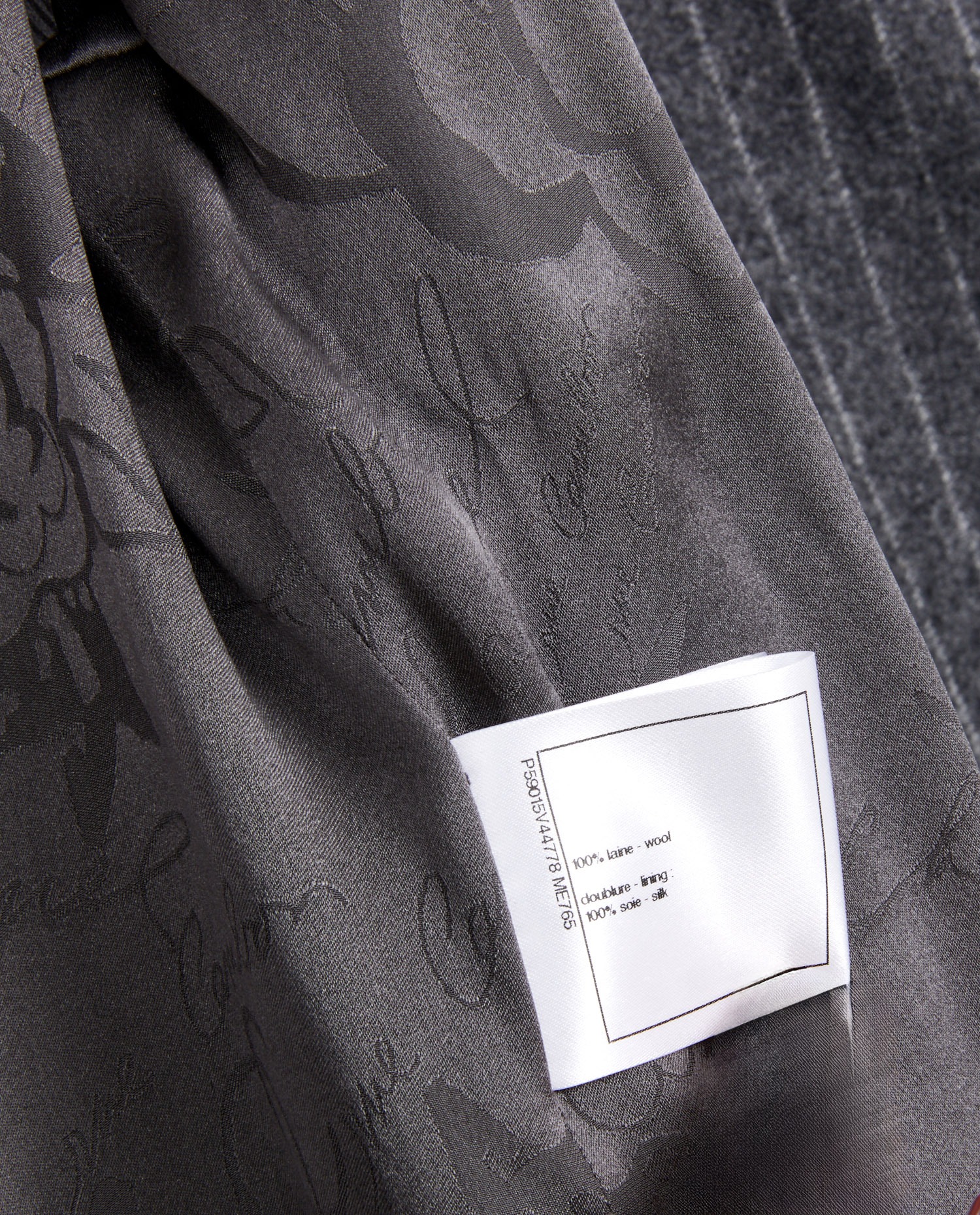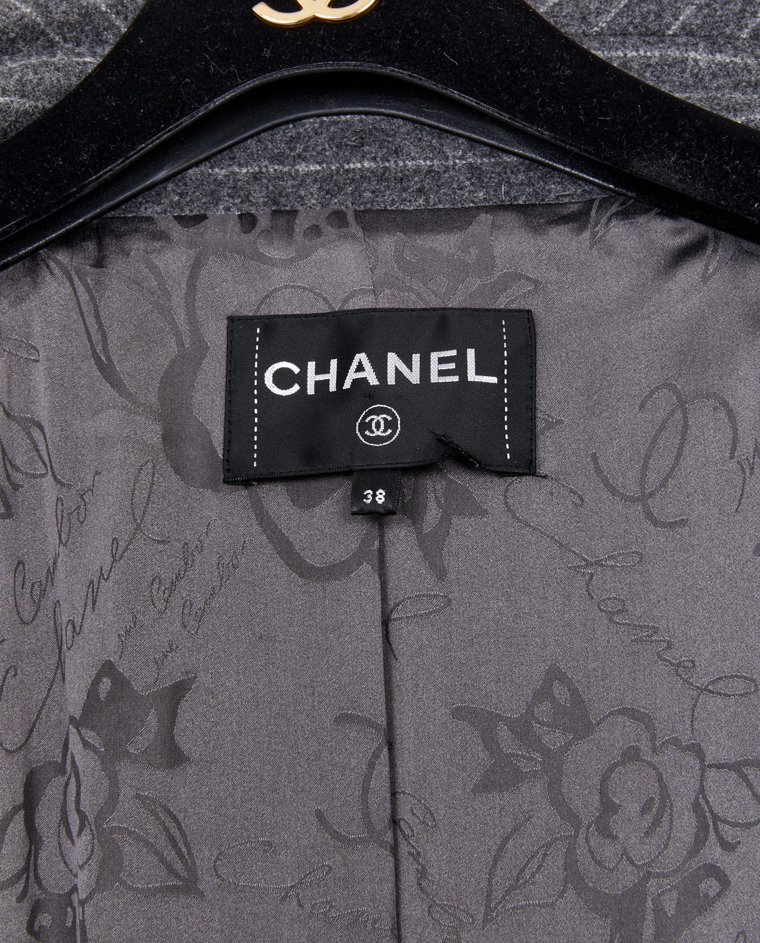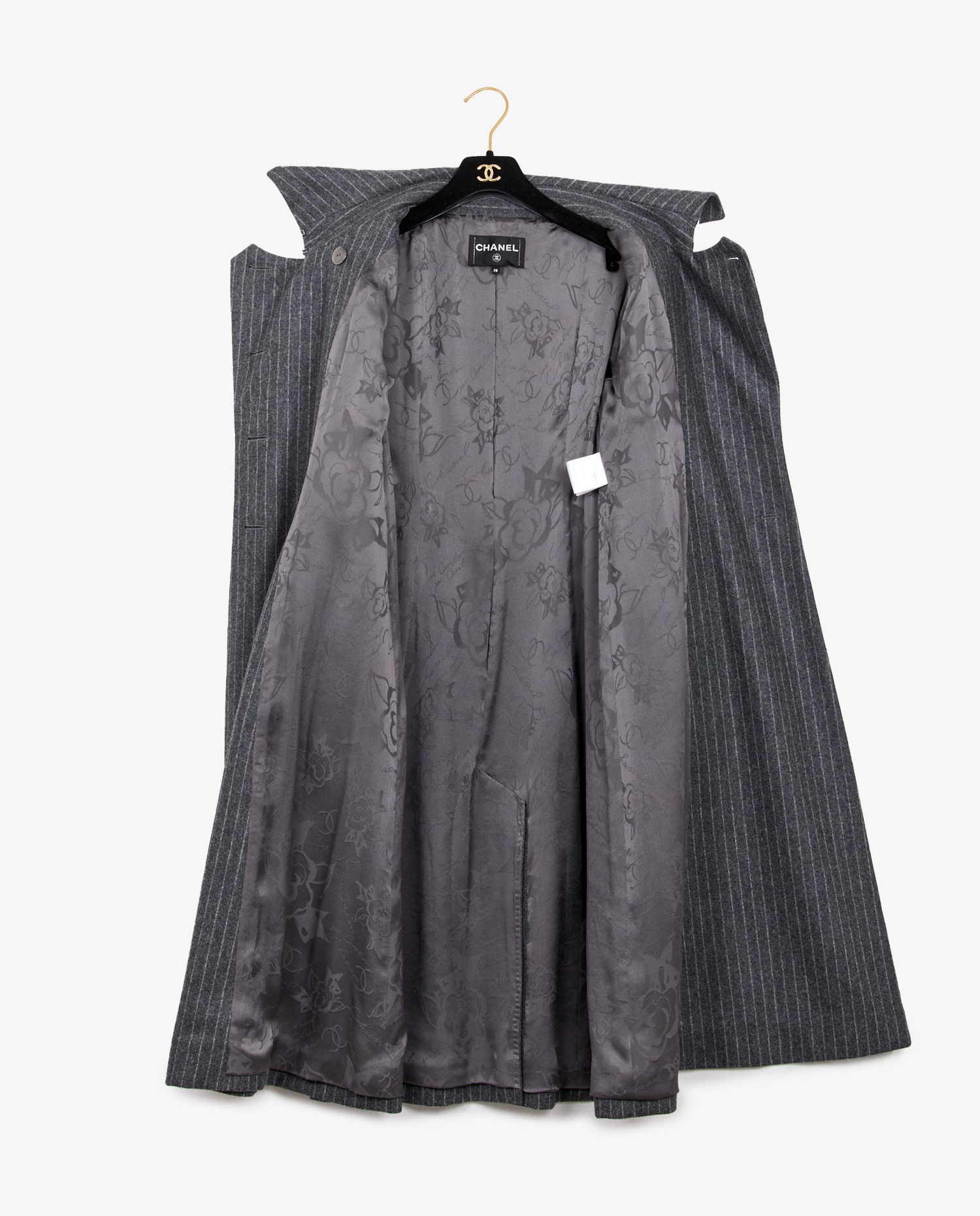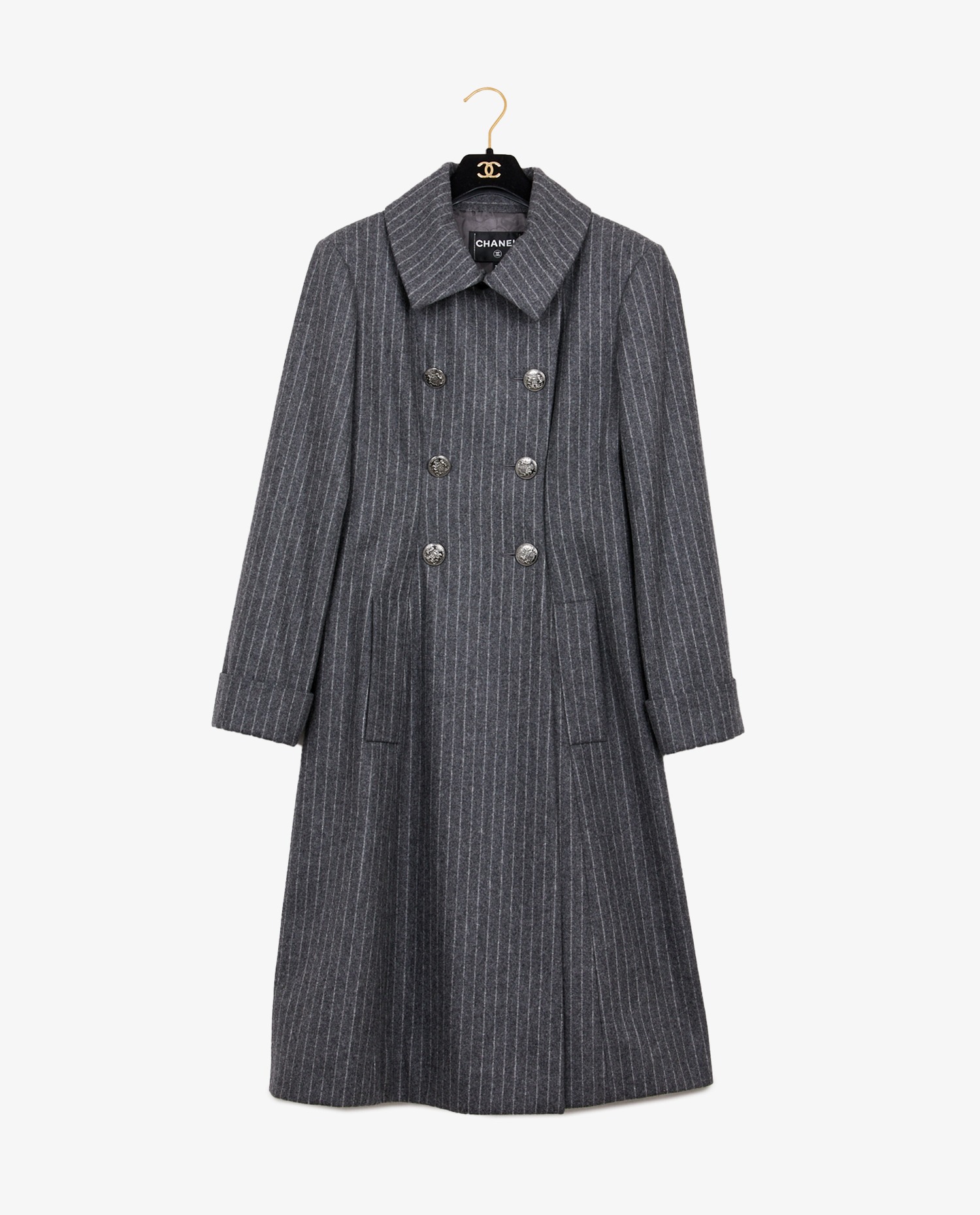 Manteau croisé Chanel en laine grise rayée. Doublure en soie. En très bon état.