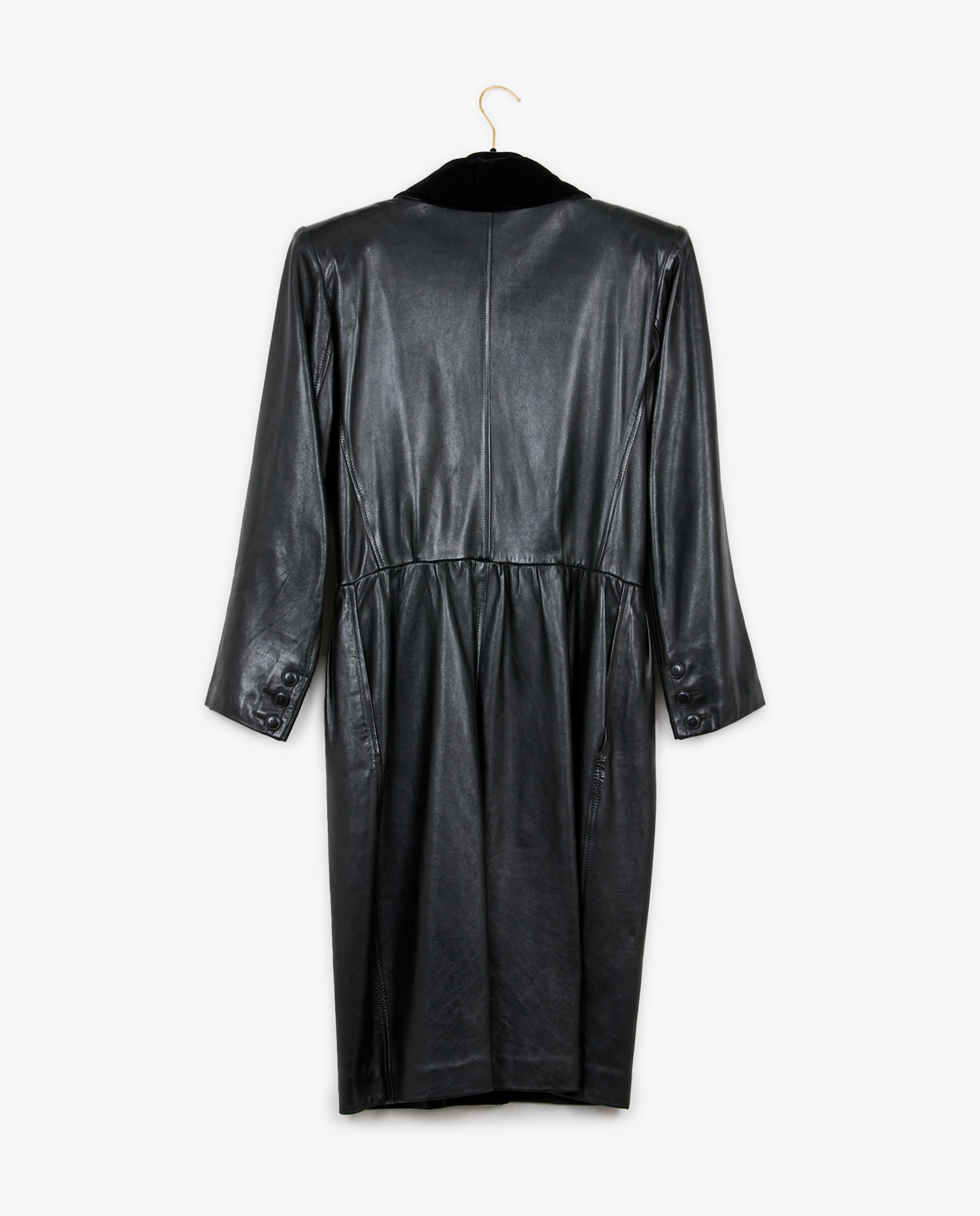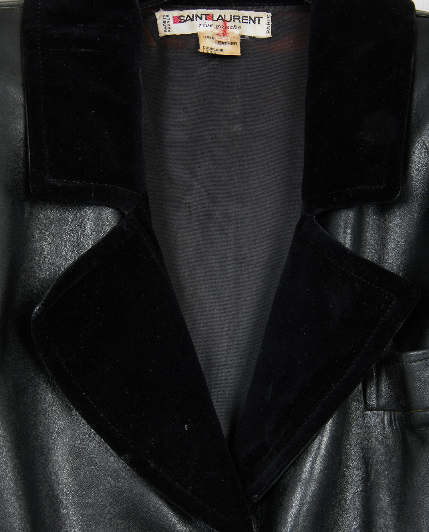 Manteau Saint Laurent en cuir et col en velours noir. Epaulettes, taille cintrée. En très état.
