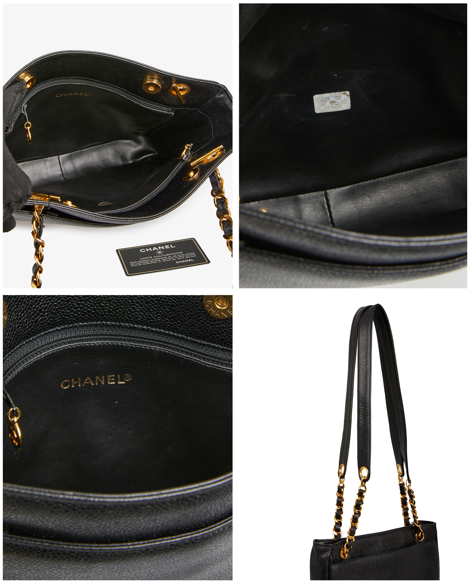 Petit cabas vintage Chanel en cuir caviar noir. Bijouterie dorée. Fermeture par bouton pression. En très bon état.