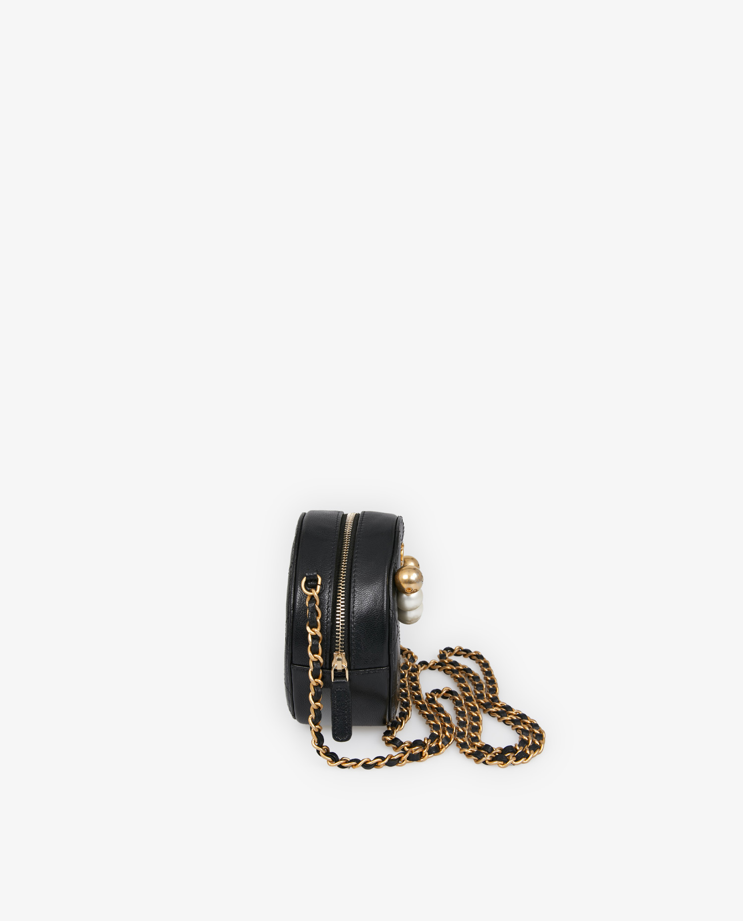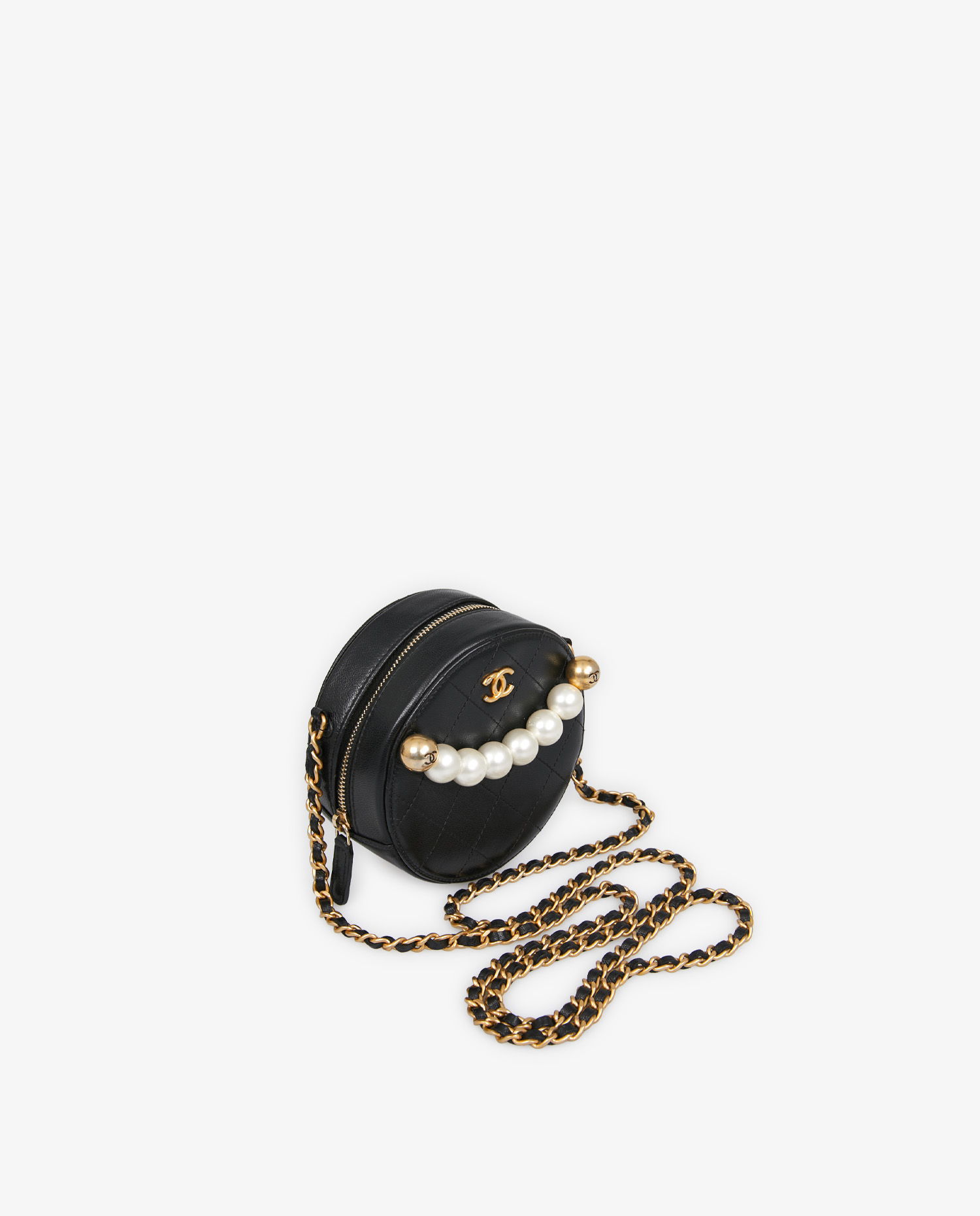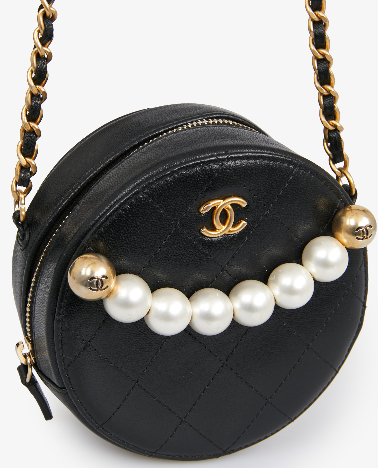 Le cuir noir à grains fins matelassé est rehaussé par un jeu de surpiqûres formant les traditionnels motifs en losange. Sur le devant, une ligne de perles blanches synthétiques, encadrée de deux sphères dorées gravées du logo Chanel, apporte un accent bijou. La fermeture zippée en métal doré ceinture le sac. La bandoulière en chaîne dorée entrelacée de cuir permet un porté ajustable. Le dos du sac reprend le matelassage classique sans ornement supplémentaire.