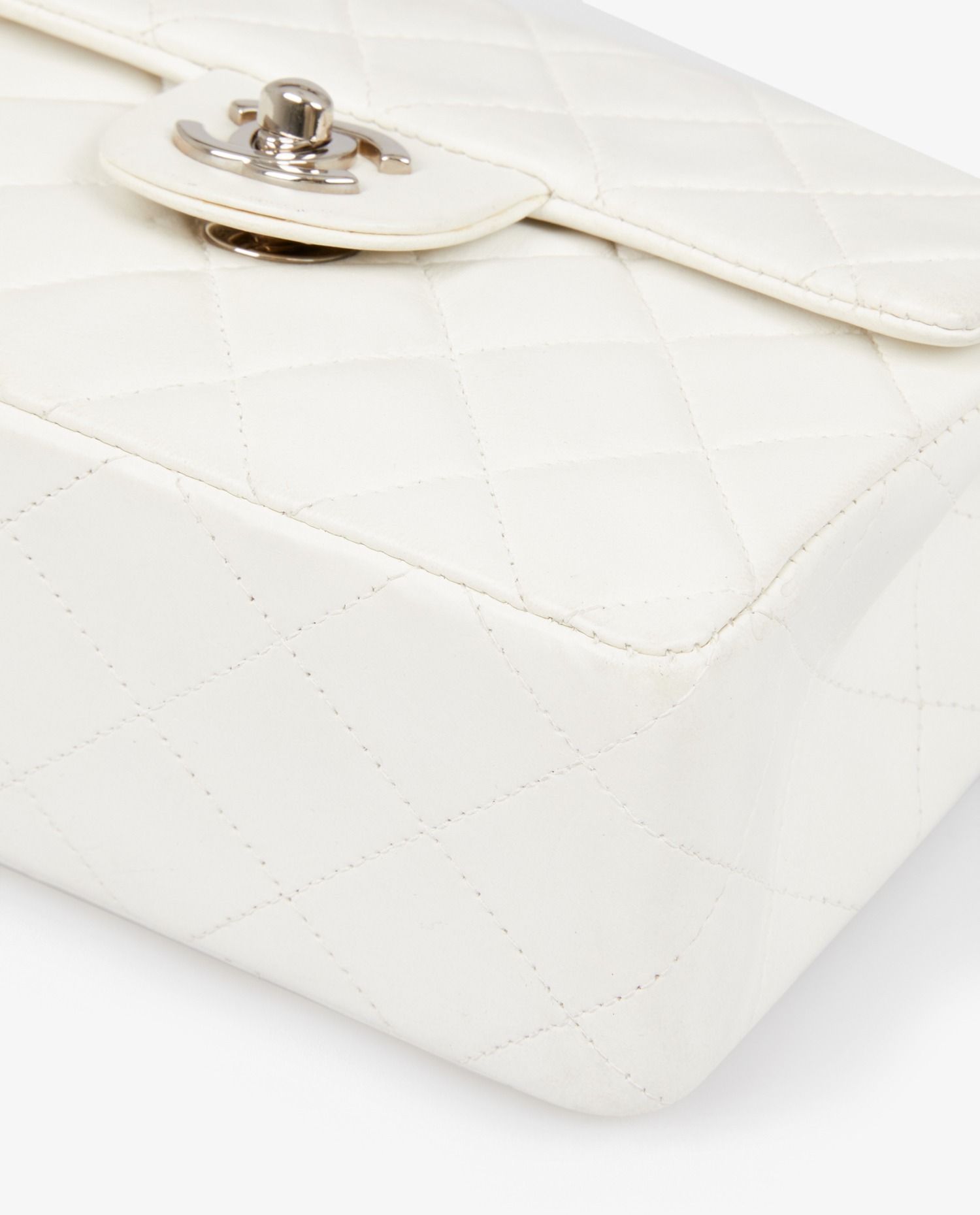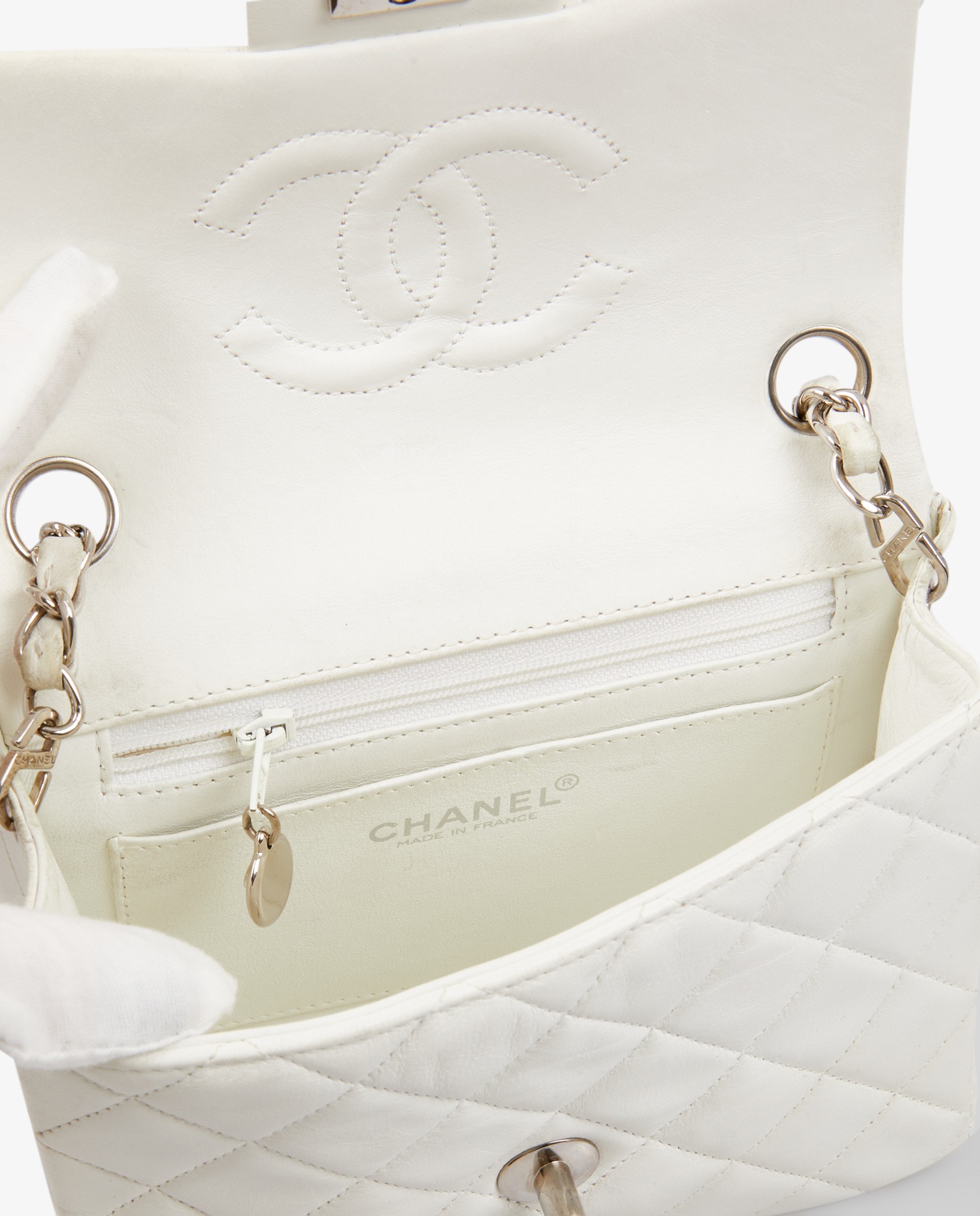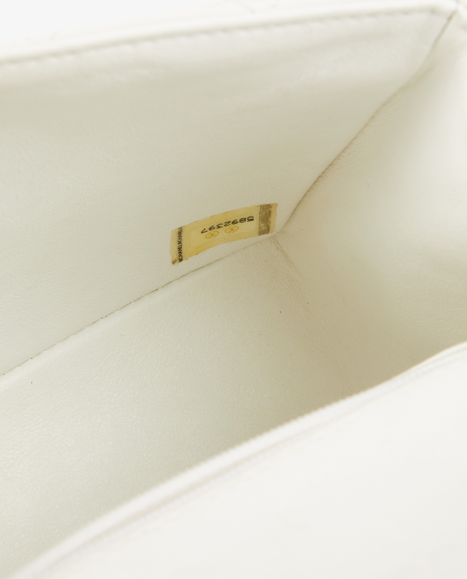 Mini Timeless Chanel en cuir d’agneau matelassé blanc. Bijouterie argent. Porté épaule ou en bandoulière. Elle mesure 111cm. En très bon état.