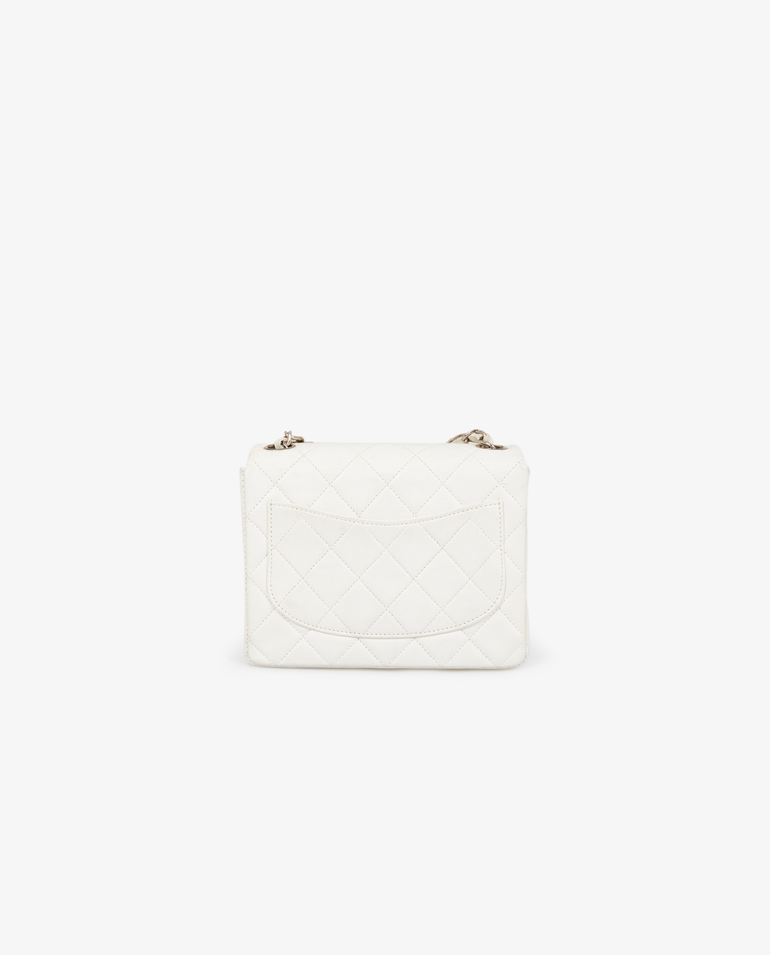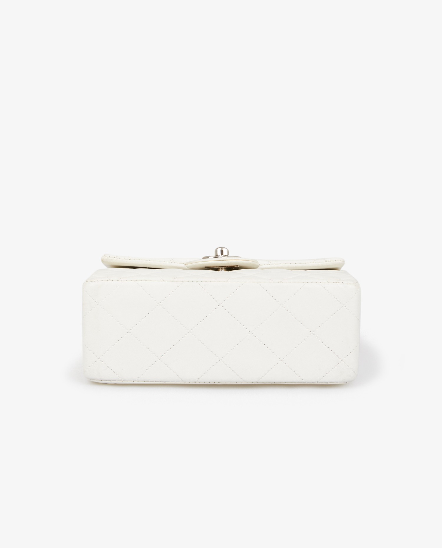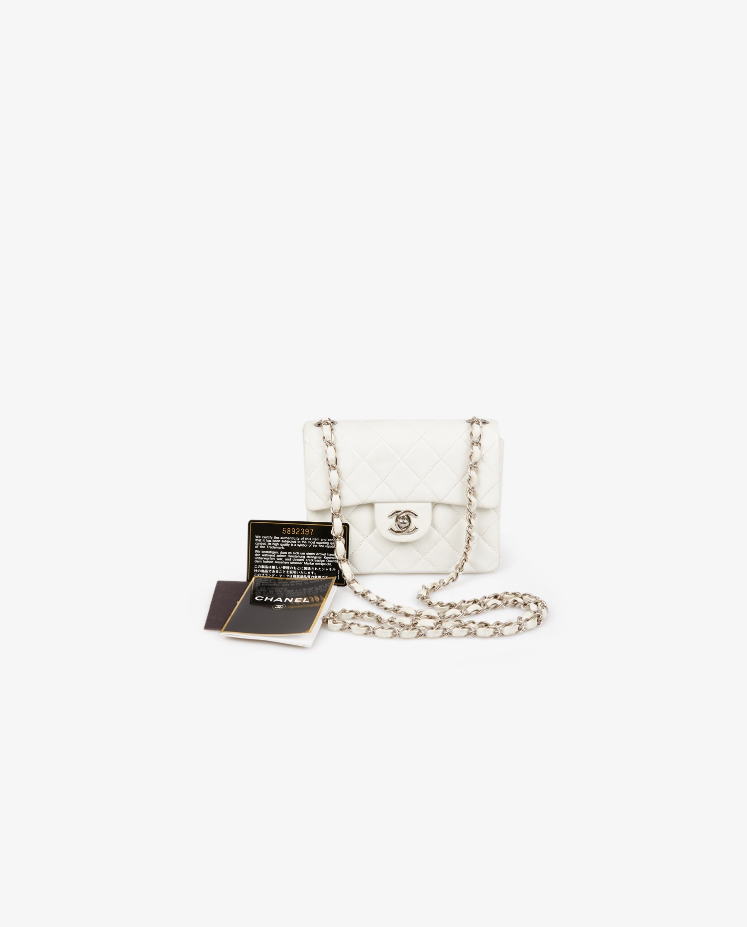 Mini Timeless Chanel en cuir d’agneau matelassé blanc. Bijouterie argent. Porté épaule ou en bandoulière. Elle mesure 111cm. En très bon état.