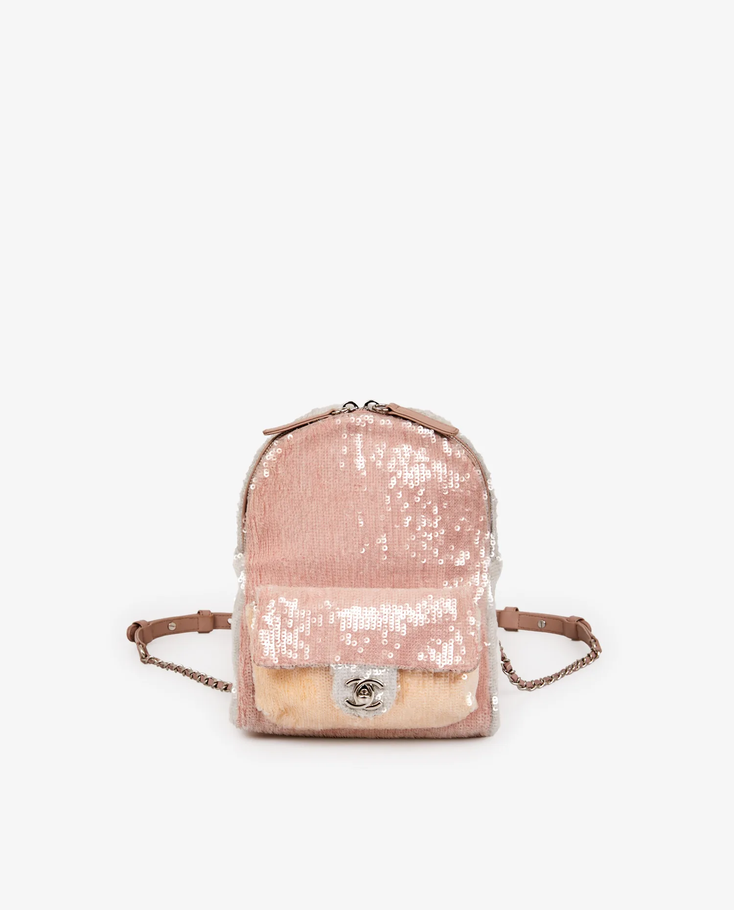 Produite entre 2016 et 2017, cette version du mini sac à dos Chanel précède légèrement la collection Printemps-Été 2018, tout en partageant avec elle l’esthétique ludique et expérimentale chère à Karl Lagerfeld. Cette période voit Chanel intégrer des matériaux inattendus comme les sequins sur des formats pratiques, mêlant fonctionnalité quotidienne et esprit couture. Le format sac à dos mini, alors très en vogue, revisite les codes classiques de la maison à travers une approche plus décontractée et jeune.