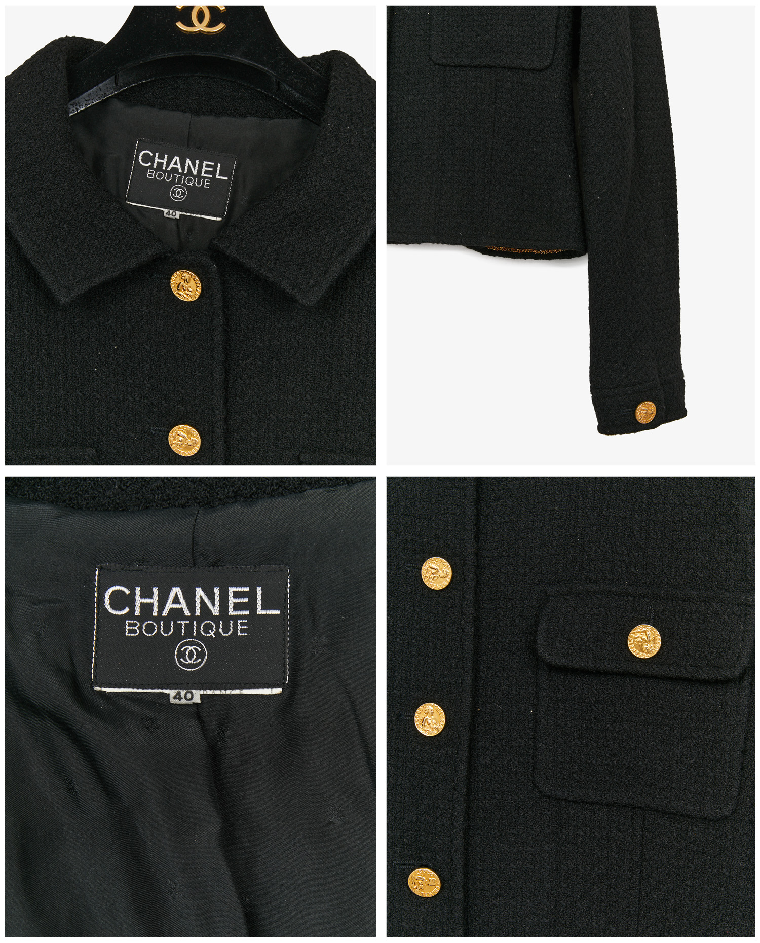 Cette pièce s’inscrit dans l’héritage des tailleurs Chanel popularisés dès les années 1950, puis revisités dans les collections Chanel Boutique des décennies suivantes. L’ajout de détails marqués comme les boutons figuratifs à l’effigie de Gabrielle Chanel reflète l’attention portée par la maison aux symboles de sa fondatrice. La coupe courte, les finitions précises et le tweed structuré restent fidèles à l’ADN de Chanel, faisant de cette veste une pièce précieuse du vestiaire vintage de luxe.