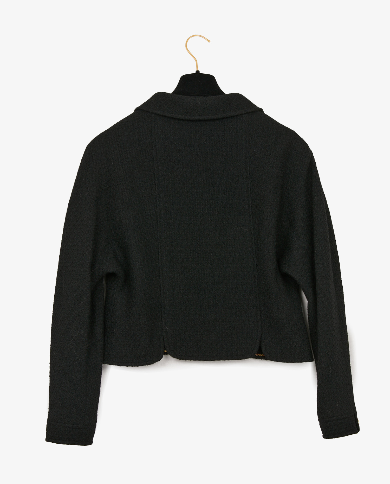 Le tweed noir offre une texture dense et subtilement mate. La veste présente une ligne droite légèrement ajustée, deux poches poitrine plaquées et un col classique. Les cinq boutons dorés, gravés du profil de Coco Chanel et de son nom, attirent le regard tout en restant élégants. Les poignets sont également dotés de boutons assortis.