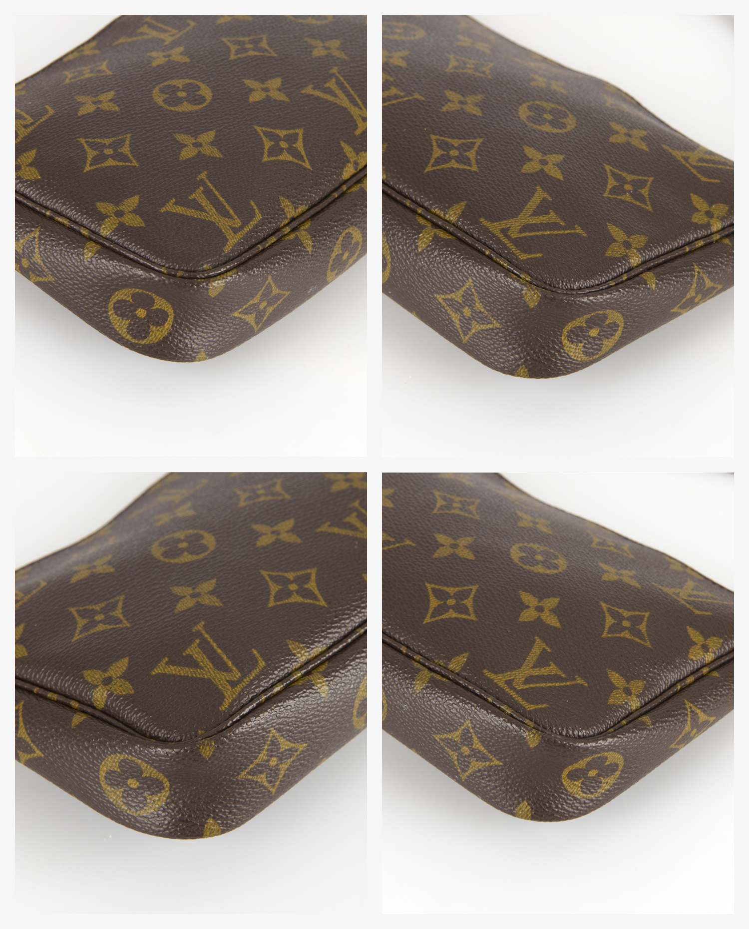 La toile enduite Monogram présente le motif classique de la maison Louis Vuitton en doré sur fond marron chocolat. La pochette principale se ferme par un zip en métal doré gravé « LV », avec des renforts latéraux en cuir naturel. La petite pochette amovible, également en toile Monogram, est fixée à l’aide de mousquetons en laiton doré. La bandoulière courte en cuir vachetta est patinée. La bandoulière longue, également en toile Monogram, se fixe grâce à des crochets pivotants. Les finitions métalliques présentent un bon éclat.