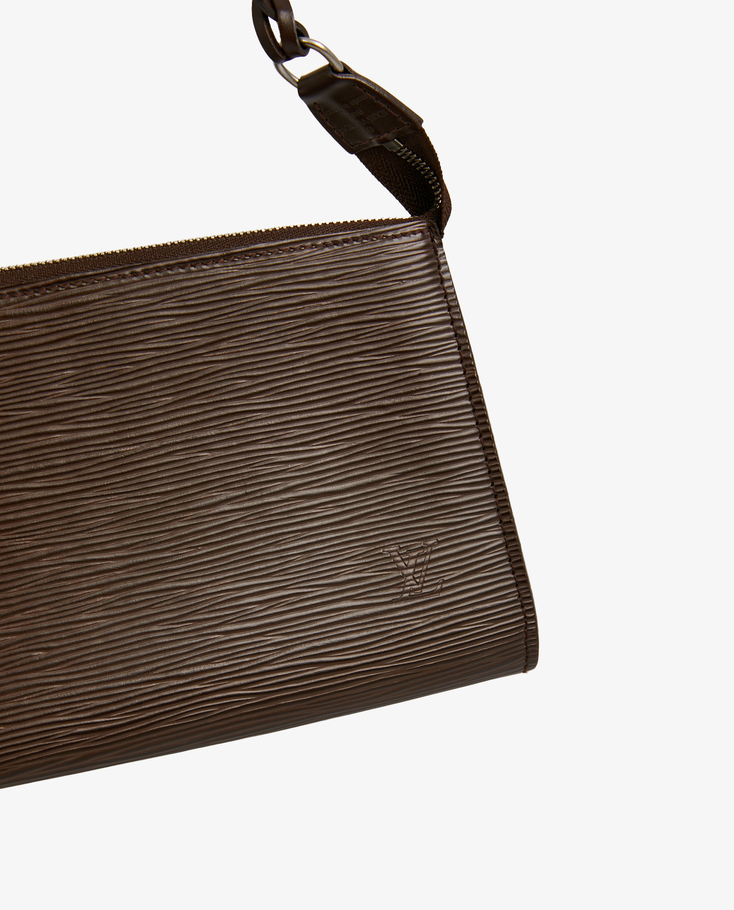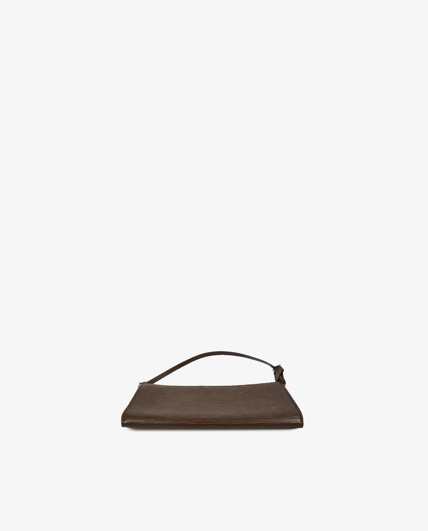 Pochette accessoires Louis Vuitton vintage en cuir épi marron. Fermeture zippée. Bijouterie argent mat. Porté épaule. En très bon état.