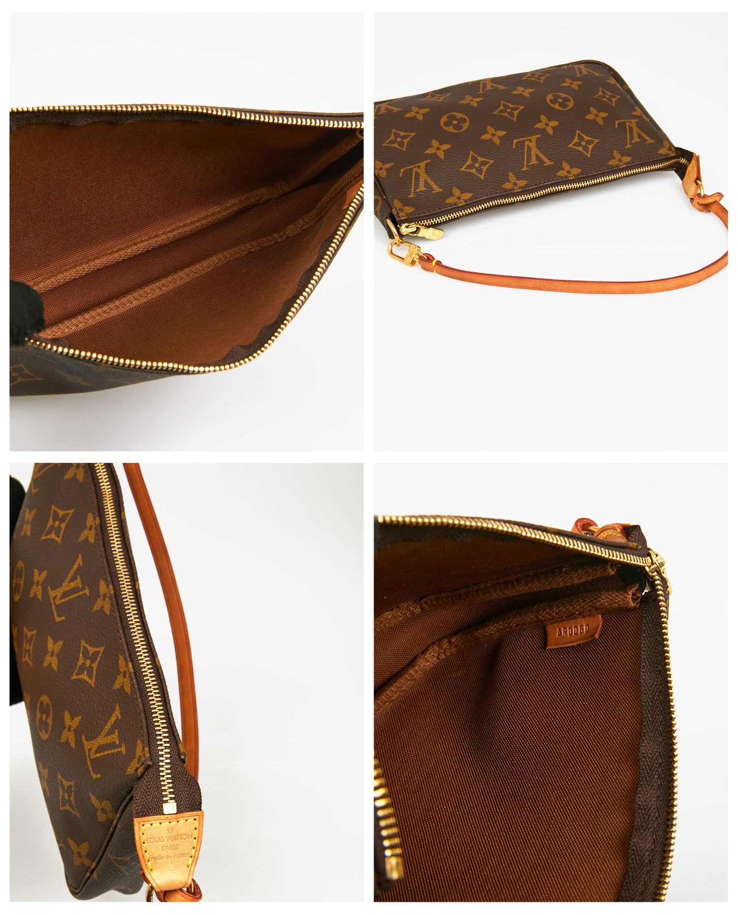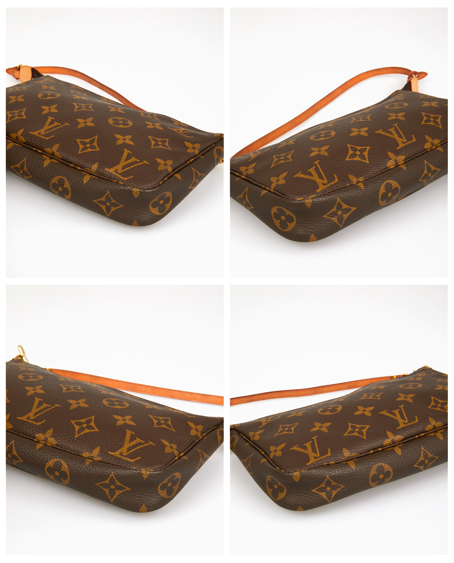 La pochette est en bon état vintage. La toile Monogram ne présente ni fissures ni tâches. Le cuir naturel de la lanière affiche une belle patine uniforme avec quelques marques d’usage normales. Le zip doré fonctionne sans accroc, avec une légère oxydation localisée. L’intérieur est propre, sans tache notable ni trace d’usure excessive.