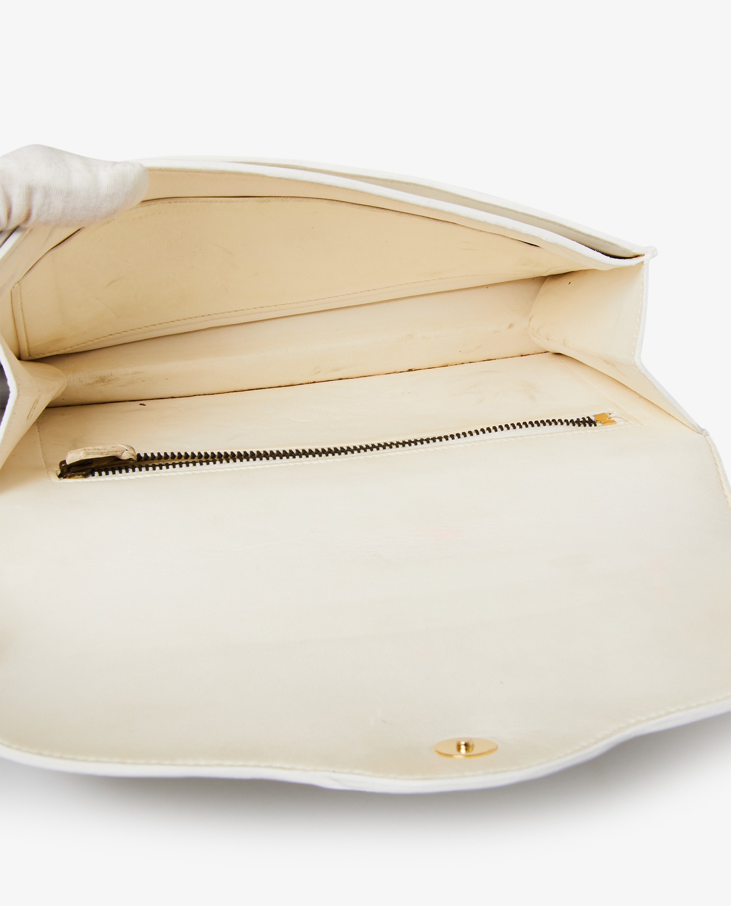 Le cuir blanc, confère à la pochette une allure lumineuse et sobre. La découpe arrondie du rabat apporte un léger contraste aux lignes rigides du format rectangulaire. La couture ton sur ton, nette et régulière, renforce la pureté de la silhouette. Fermée, la pochette mesure environ 26 cm de largeur pour 16 cm de hauteur, avec une épaisseur fine convenant à l’essentiel.