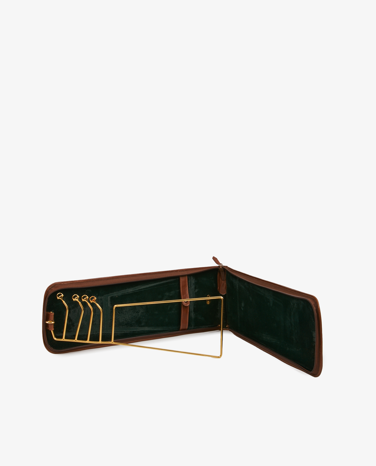 Porte-cravate Gucci en cuir lisse marron. Fermeture zippée. L’intérieur est en suède vert. Il comprend 4 accroches en métal doré avec un embout en forme de mors à cheval ainsi qu’une plaque métallique siglé Gucci. En très bon état. Quelques marques d’usure d’usage sont visibles sur le velours et une petite déchirure du cuir sur l’un des coins. Voir photos.