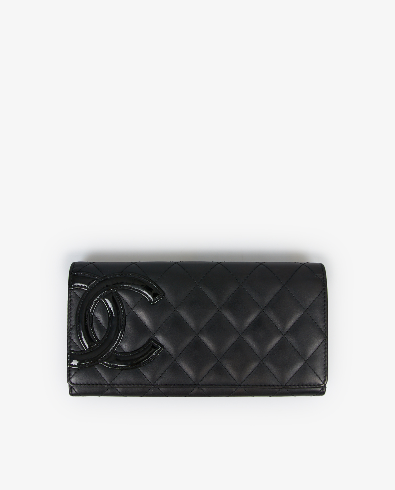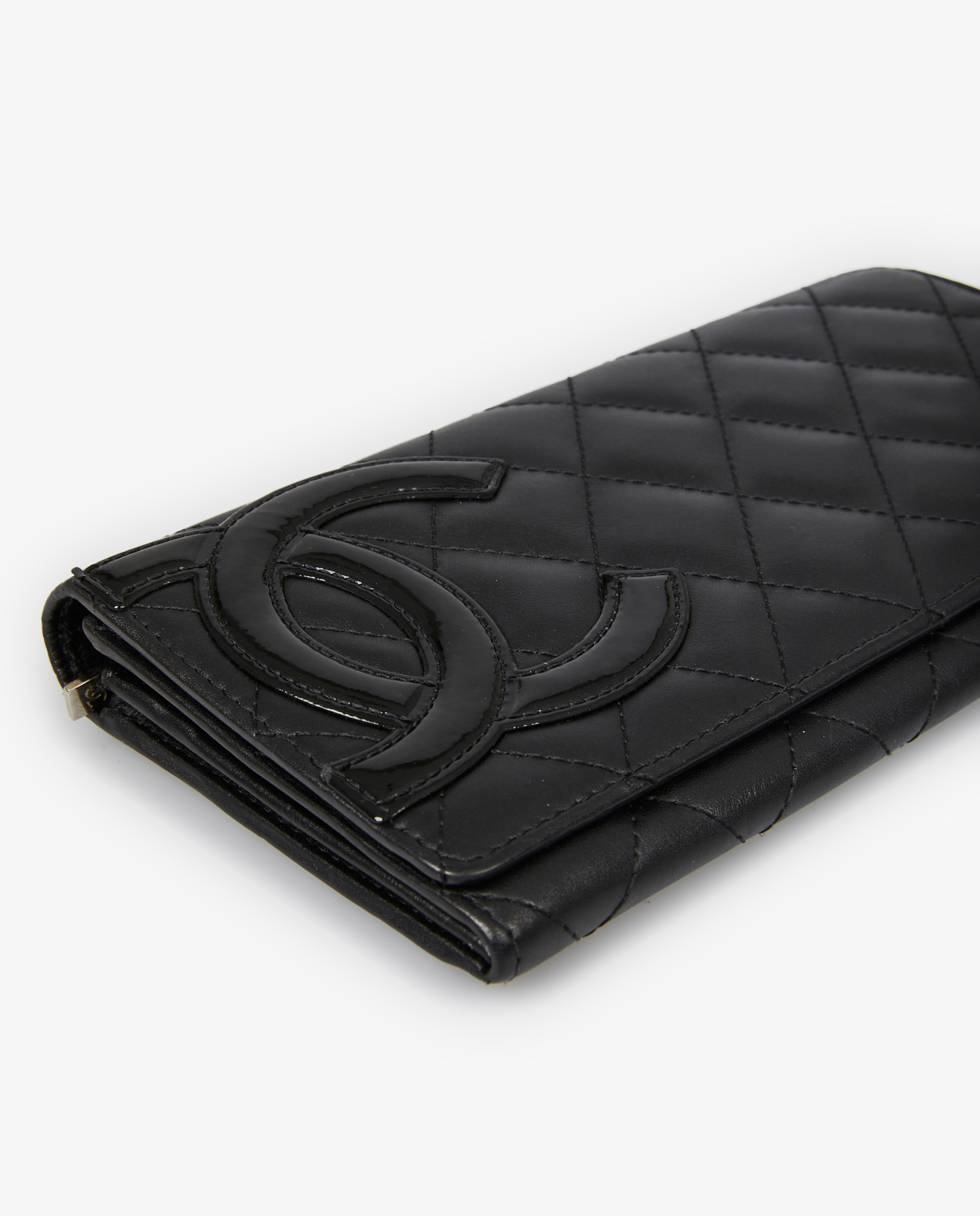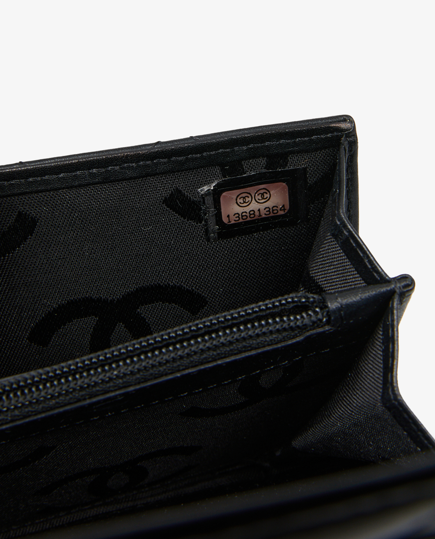 Portefeuille Cambon Chanel à rabat en cuir d’agneau matlassé noir. Fermeture par bouton pression. 6 fentes pour cartes, une pochette zippée et 3 fentes pour billets. En très bon état.