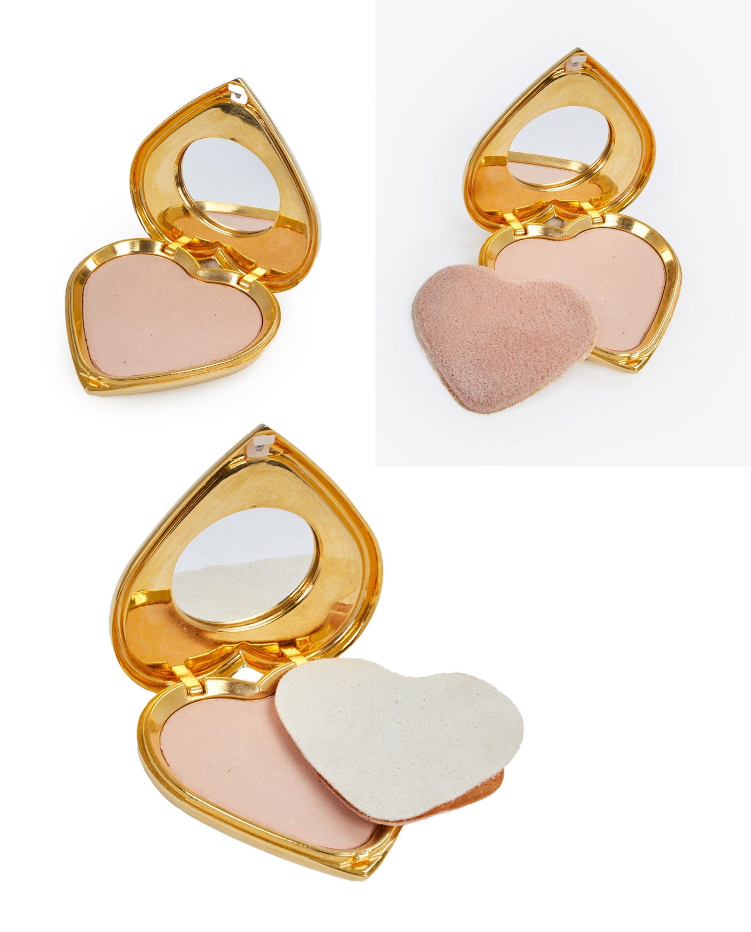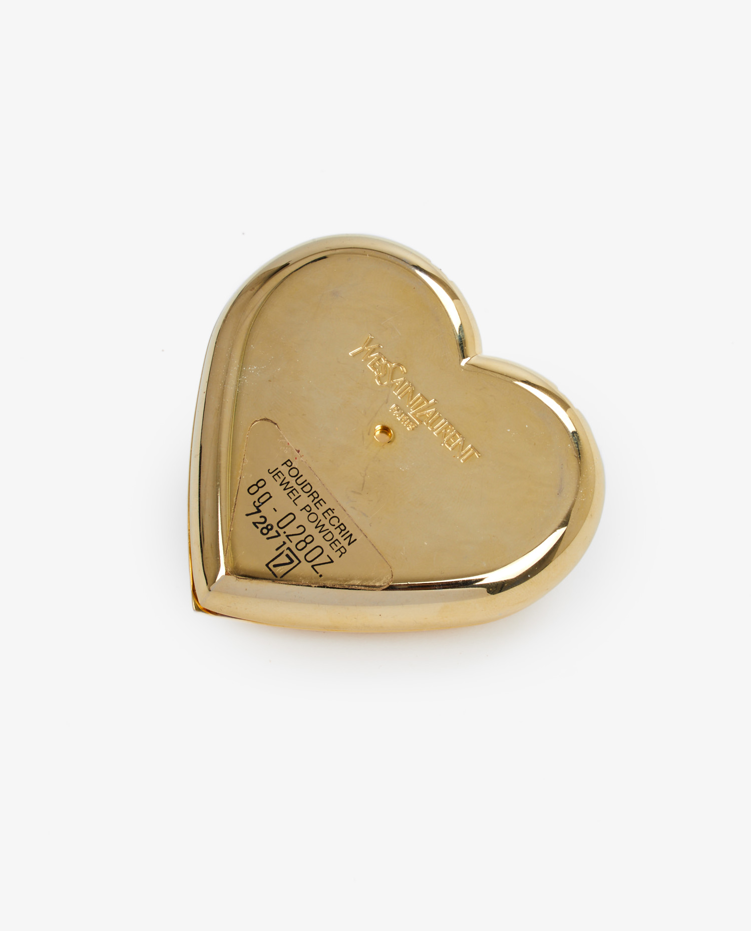 Ravissant poudrier Yves Saint Laurent vintage en métal doré et finitions cristaux bleu en forme de coeur. En très bon état.