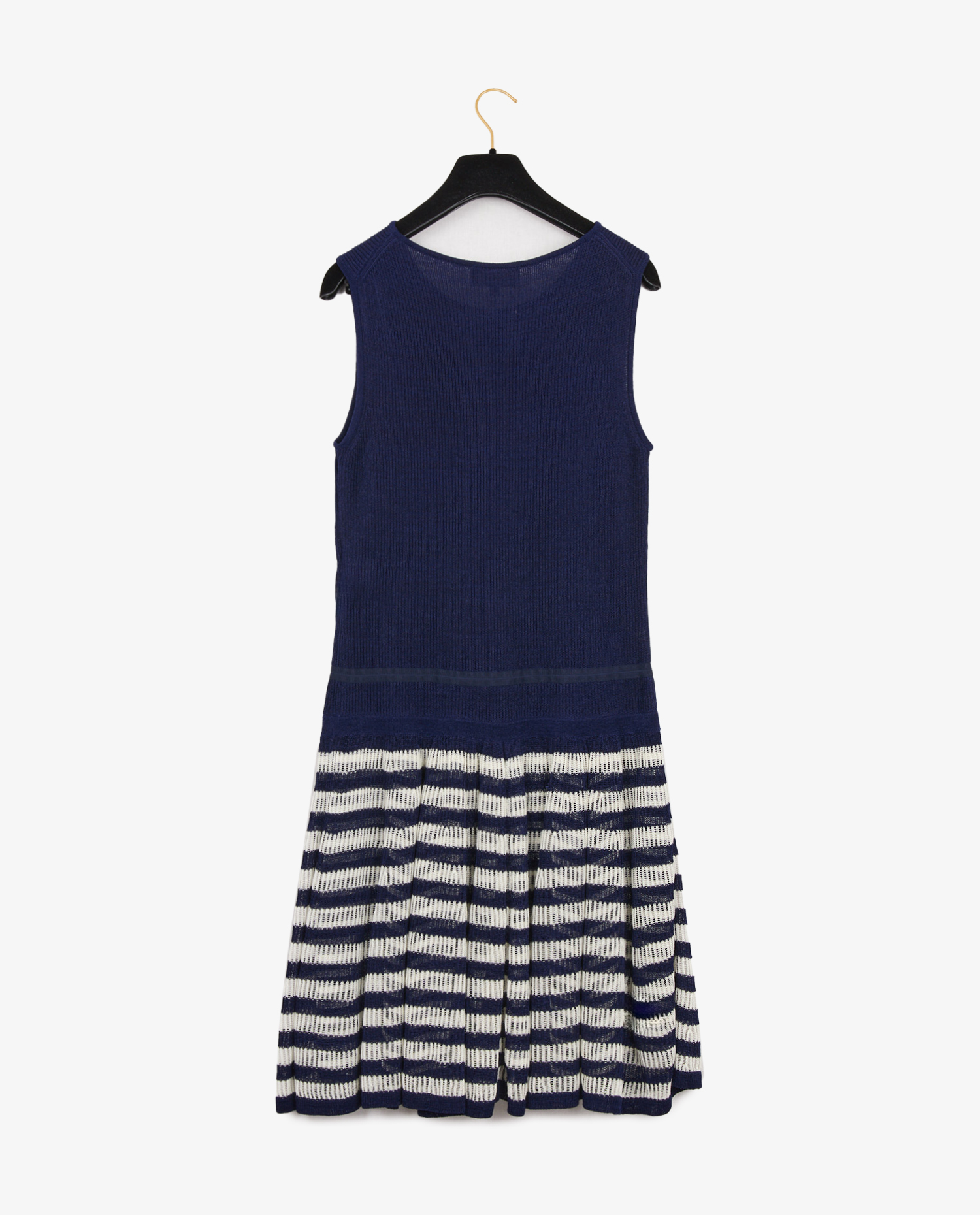 La robe se compose d’un haut en maille dense bleu marine, à encolure ronde dégagée et emmanchures finement travaillées. La taille est marquée par une bande en ruban gros-grain bleu marine, sur laquelle se fixe un lien de serrage en velours. La partie inférieure adopte une forme évasée, animée par des rayures ajourées blanches et bleu marine tricotées en relief. Un bouton métallique siglé Chanel est cousu sur le côté gauche, discrètement intégré dans le motif.
