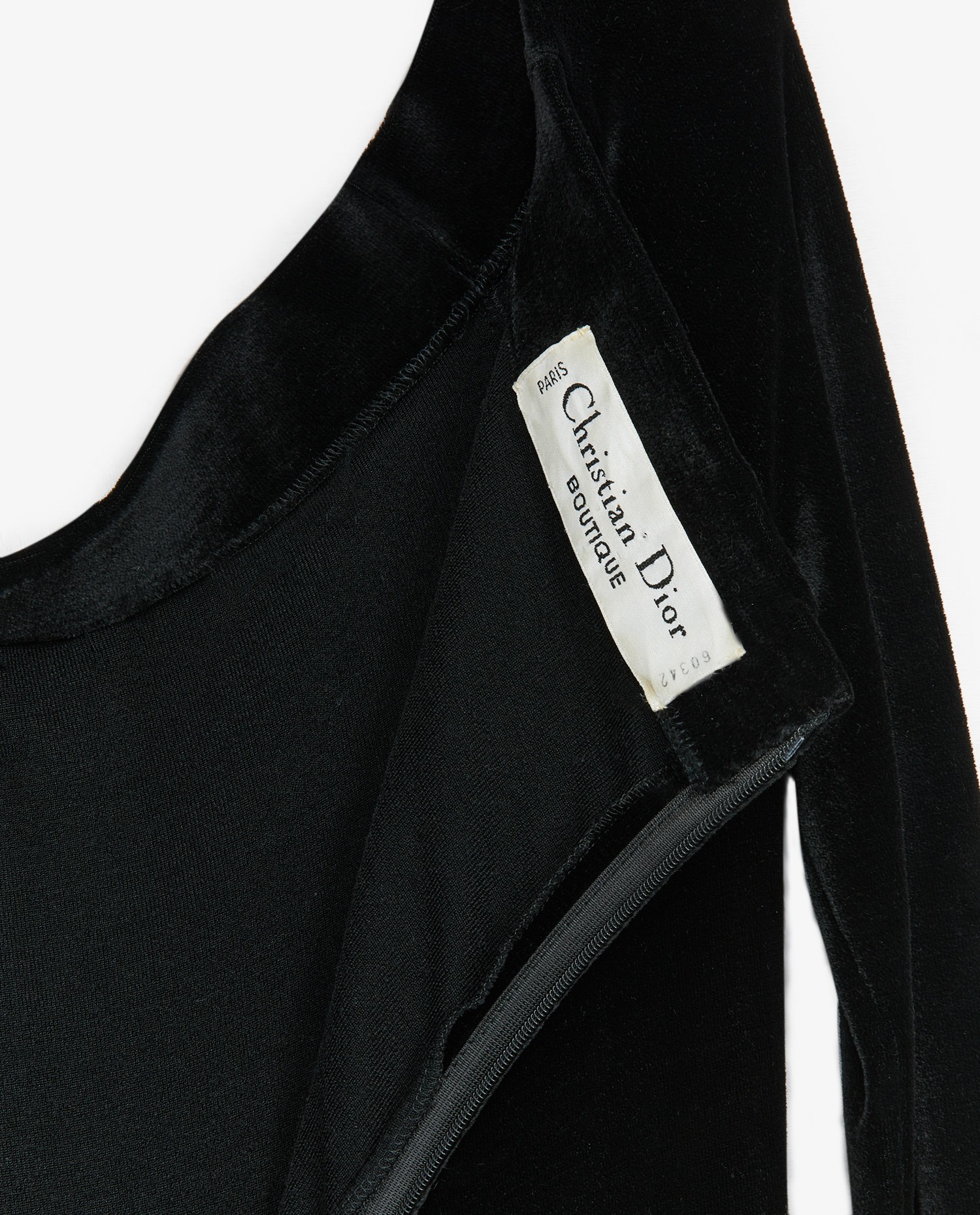 Robe du soir Christian Dior vintage en velours et soie noire. Tombante sur les épaules. Cintrée à la taille. En très bon état.