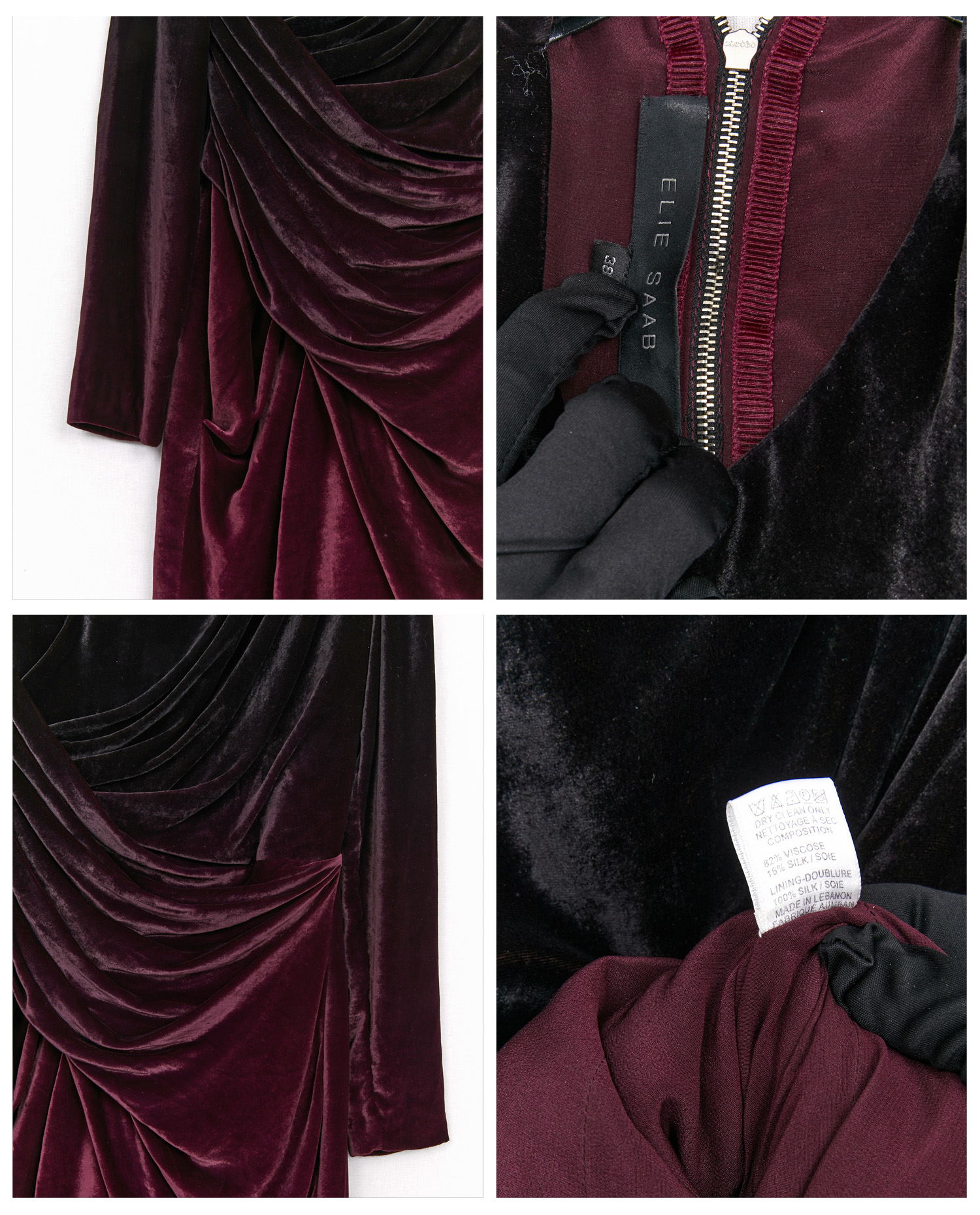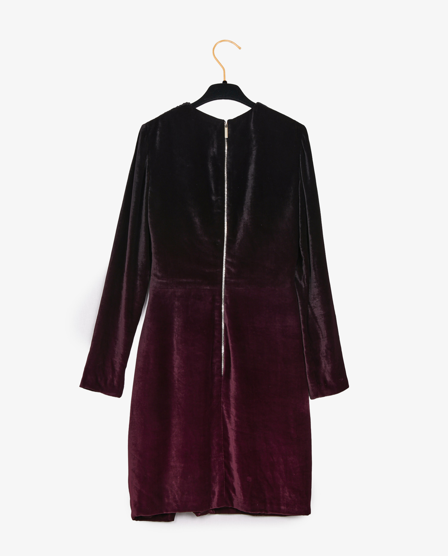 Le velours, mêlant viscose et soie, présente une texture dense et brillante, réagissant subtilement à la lumière. Le dégradé de couleur du haut noir au bas lie-de-vin accentue la verticalité du modèle. Le drapé asymétrique, présent à l’avant et partiellement sur la hanche, apporte du mouvement tout en structurant la robe. Le dos est sobre, fermé par une fermeture éclair apparente sur toute la longueur, assurant un enfilage aisé.