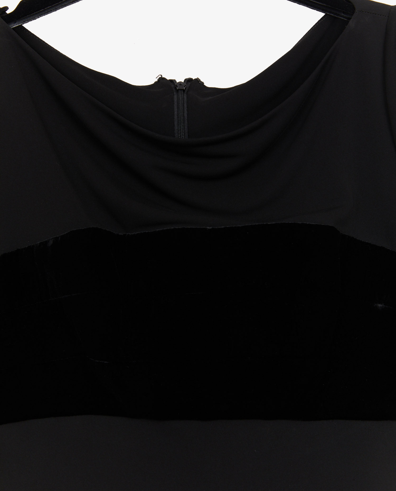 La robe est confectionnée dans un tissu noir fluide, à la fois dense et souple, qui tombe parfaitement sans marquer. Elle se distingue par un large bandeau en velours noir profond, positionné sous la poitrine, qui accentue la structure et apporte de la texture. L’encolure présente un drapé subtil, tombant avec douceur sur les épaules. Les manches sont longues et légèrement évasées, et la jupe, de longueur midi, propose une coupe portefeuille dissimulée dans un pli central, offrant une belle liberté de mouvement. L’arrière de la robe est fermé par un zip discret ton sur ton, placé au centre du dos.