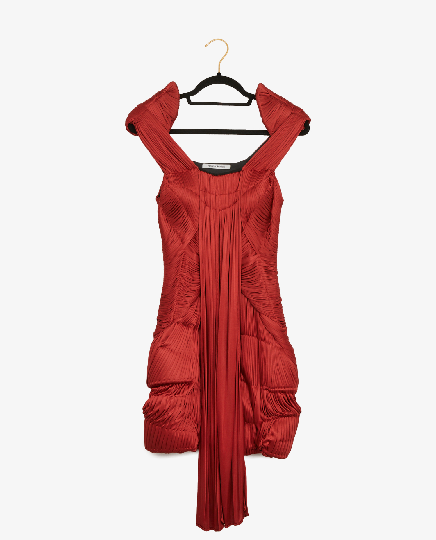 Robe du soir Sofia Kokosalaki en satin plissé rouge. Coques au. niveau de la poitrine. Taille 38. En très bon état. Quelques légers accrocs voir photos mais peu visibles.