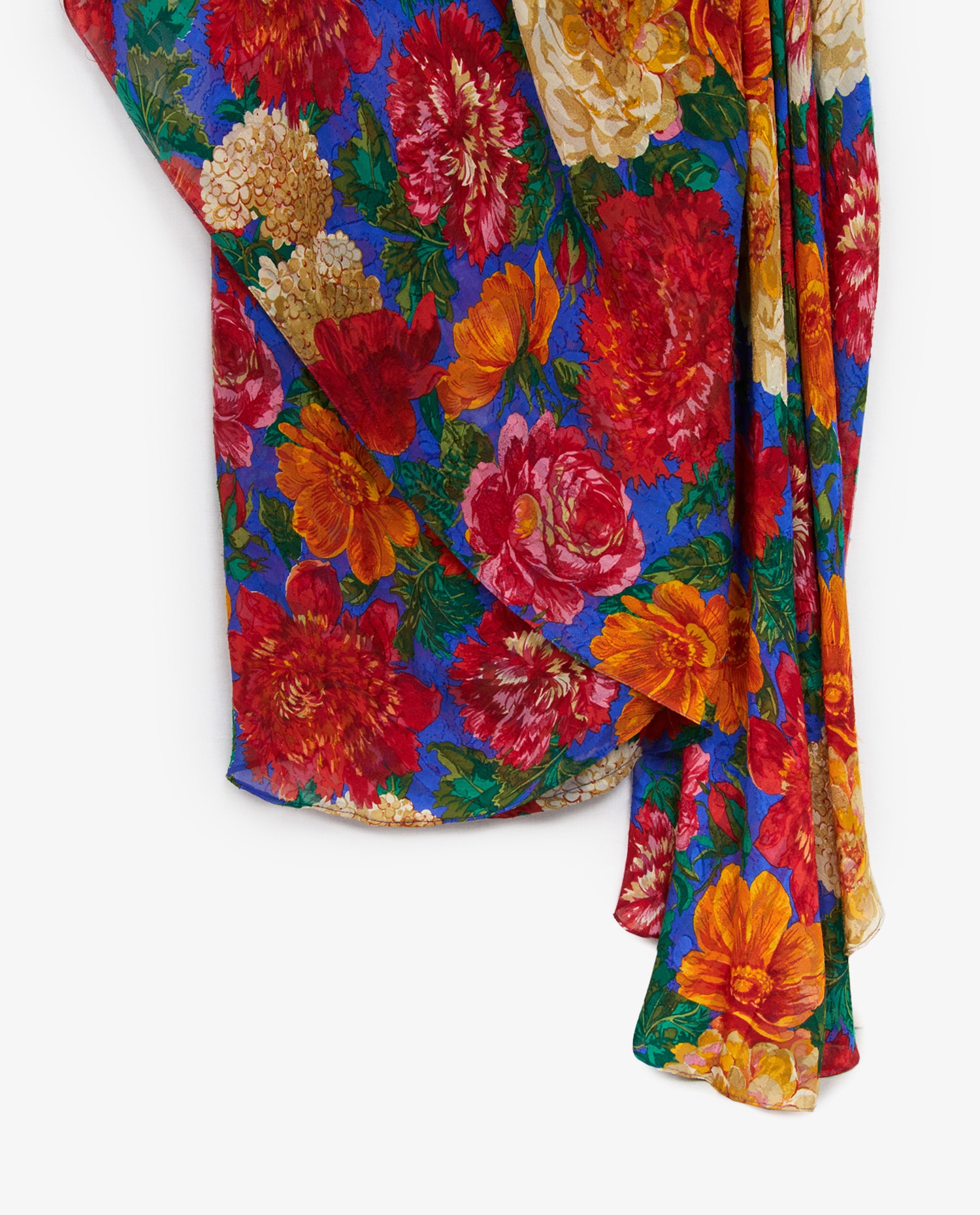 Robe de cocktail vintage Yves Saint Laurent en soie imprimée fleurie. Une cape vient épouser l’épaule droite. A l’intérieur, un corset vient maintenir le buste et la poitrine. Taille 42. En très bon état.